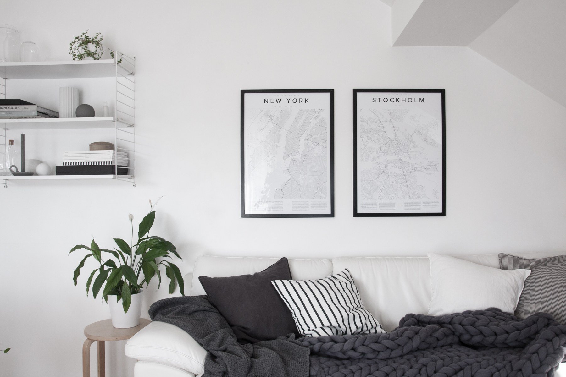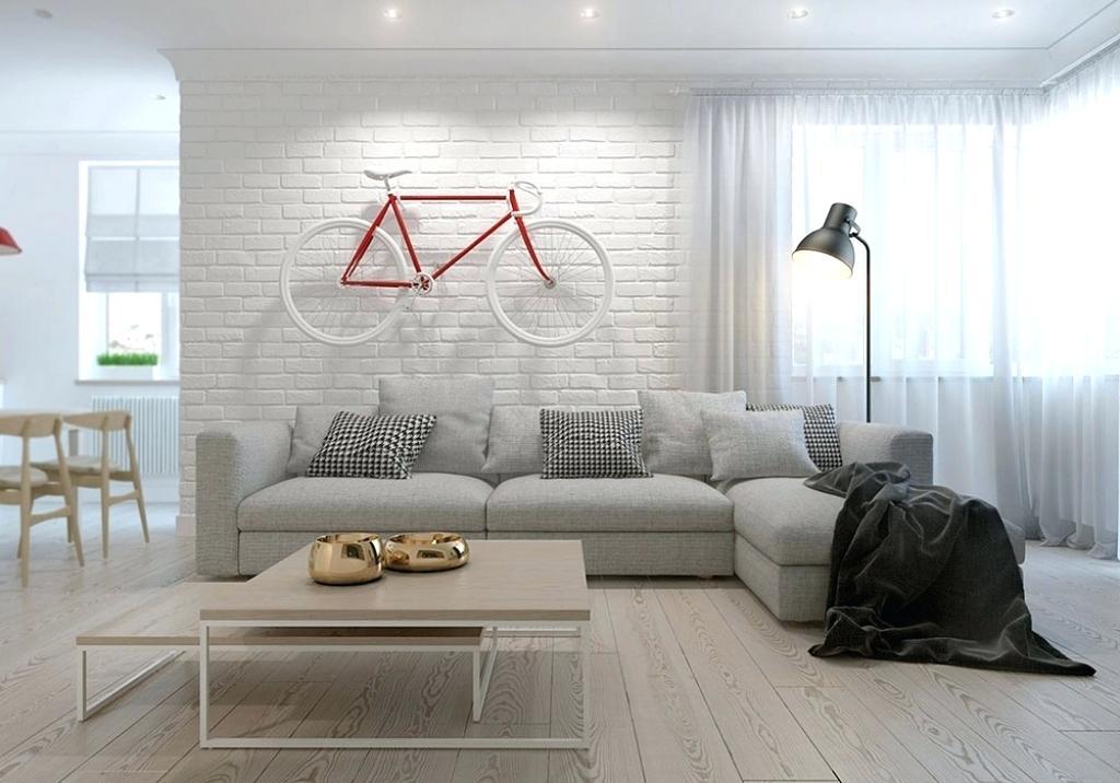 La solución adecuada para la decoración de paredes en el estilo escandinavo será la pintura habitual. Las composiciones ligeras se deben elegir para el trabajo: gris, azul claro (casi blanco) o blanco puro. Es posible combinar dos colores a la vez en el diseño de las paredes de la sala de estar. Por ejemplo, detrás del área de recreación, pinte la pared en gris claro y deje el resto blanco. Una solución universal es pintar todas las paredes en blanco. En este caso, la textura de la superficie puede ser perfectamente lisa o tener un ligero relieve, patrones volumétricos sutiles. Una opción aceptable sería pegar papel tapiz blanco. Pueden ser lienzos lisos o materiales de acabado con pequeños patrones convexos. Un acabado de ladrillo también se verá bien en una sala de estar escandinava. Puede ser papel tapiz especial o paneles de espuma en blanco.