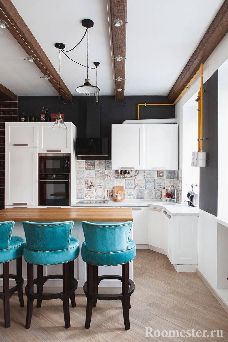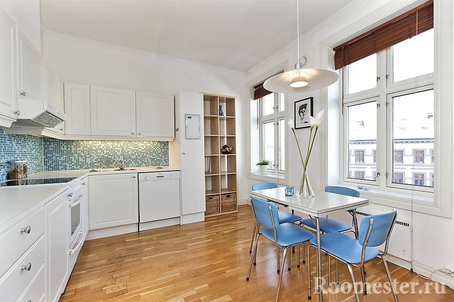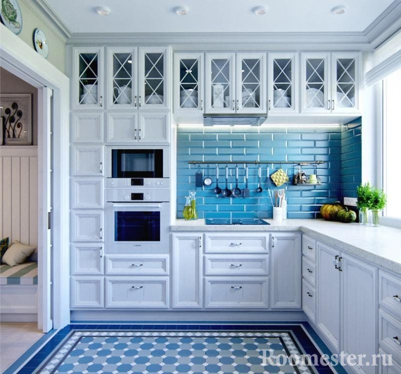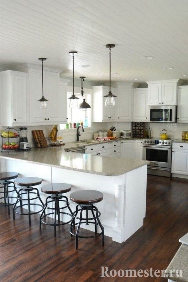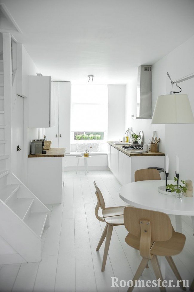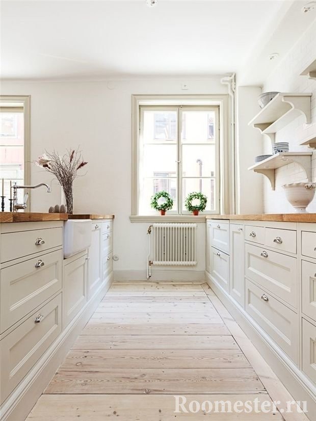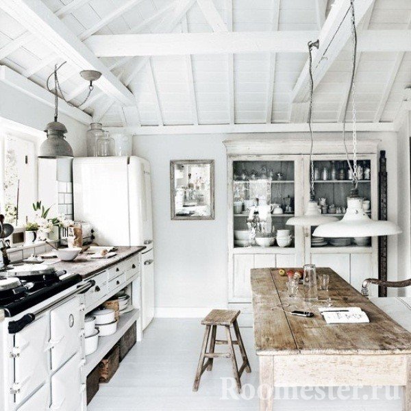 La cocina es un lugar donde puede habilitar diferentes soluciones de pisos. Puede hacer esto en el contraste de texturas o elegir una sola actuación. Permita no solo un piso oscuro, sino también a granel, incluso colores brillantes: una opción armoniosa con un delantal, un área de trabajo. Puede darle un toque especial a una cocina blanca con un piso de tablero de ajedrez. Dependiendo del estilo, la tensión, las estructuras de la viga, se utilizan techos blanqueados clásicos.