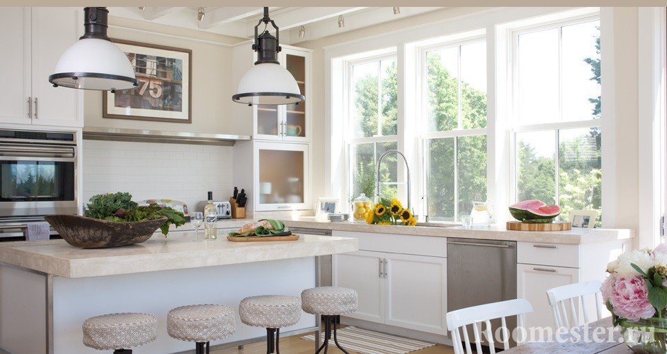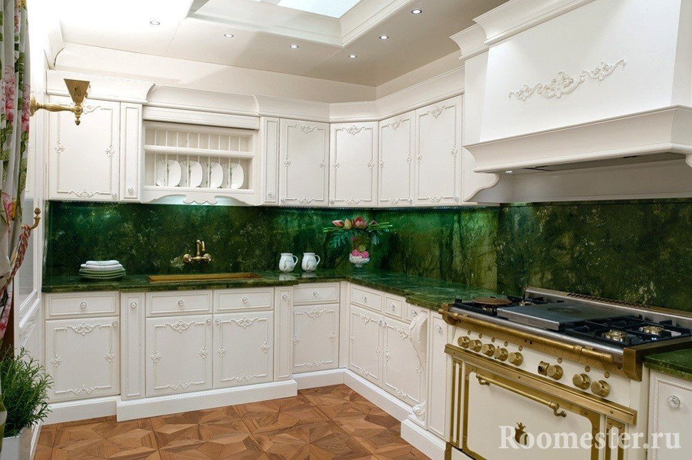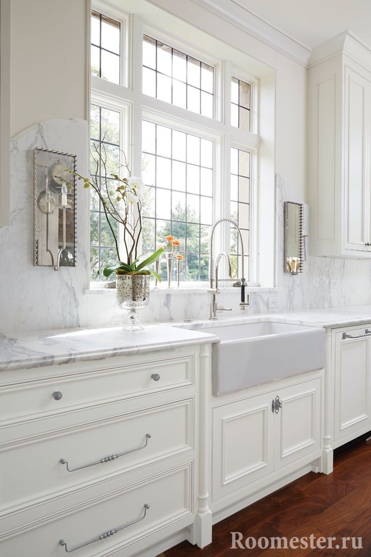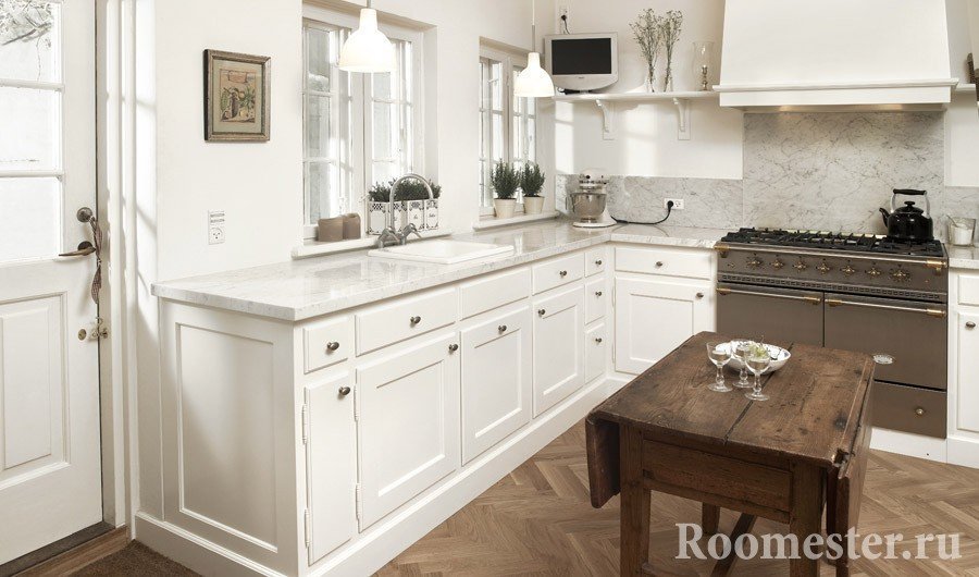 Los fanáticos de las encimeras de piedra deben mirar el análogo artificial del mármol: es más fácil y más barato, pero la durabilidad es estándar. Además, el mármol natural con uso activo puede requerir renovación en forma de pulido profesional.