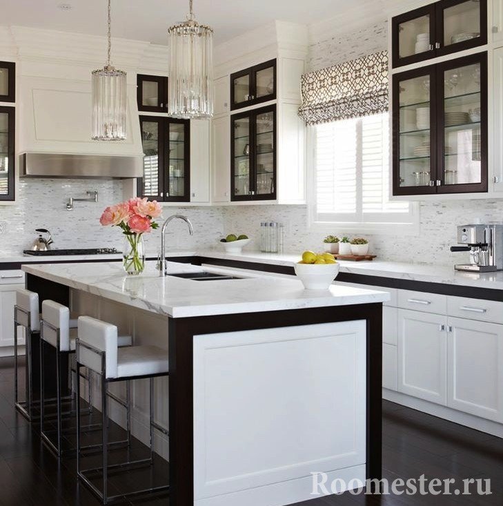Negro Recientemente, los interiores en blanco y negro tienen una posición de liderazgo, y la cocina no es una excepción. Cualquier proporción es aceptable aquí, lo principal es la originalidad de la imagen general. Alternativa: grafito, gris oscuro.