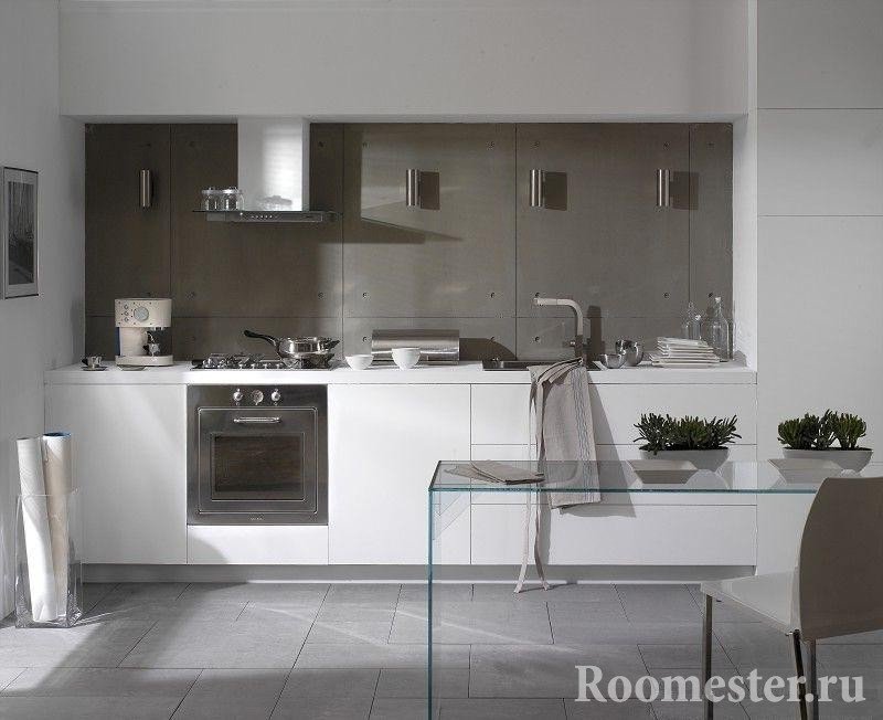 El blanco es un color muy conveniente; no solo se combina con todos los demás, sino que los embellece y hace que el aspecto general sea expresivo.No puede tener miedo de cometer un error con él cuando se combina, pero definitivamente no debe dejarlo solo. Especialmente en combinación con los elementos cromados de los electrodomésticos, un grifo y otros artículos de cocina con un estilo moderno. Entonces, definitivamente, no se puede evitar una comparación estándar con la sala de operaciones.