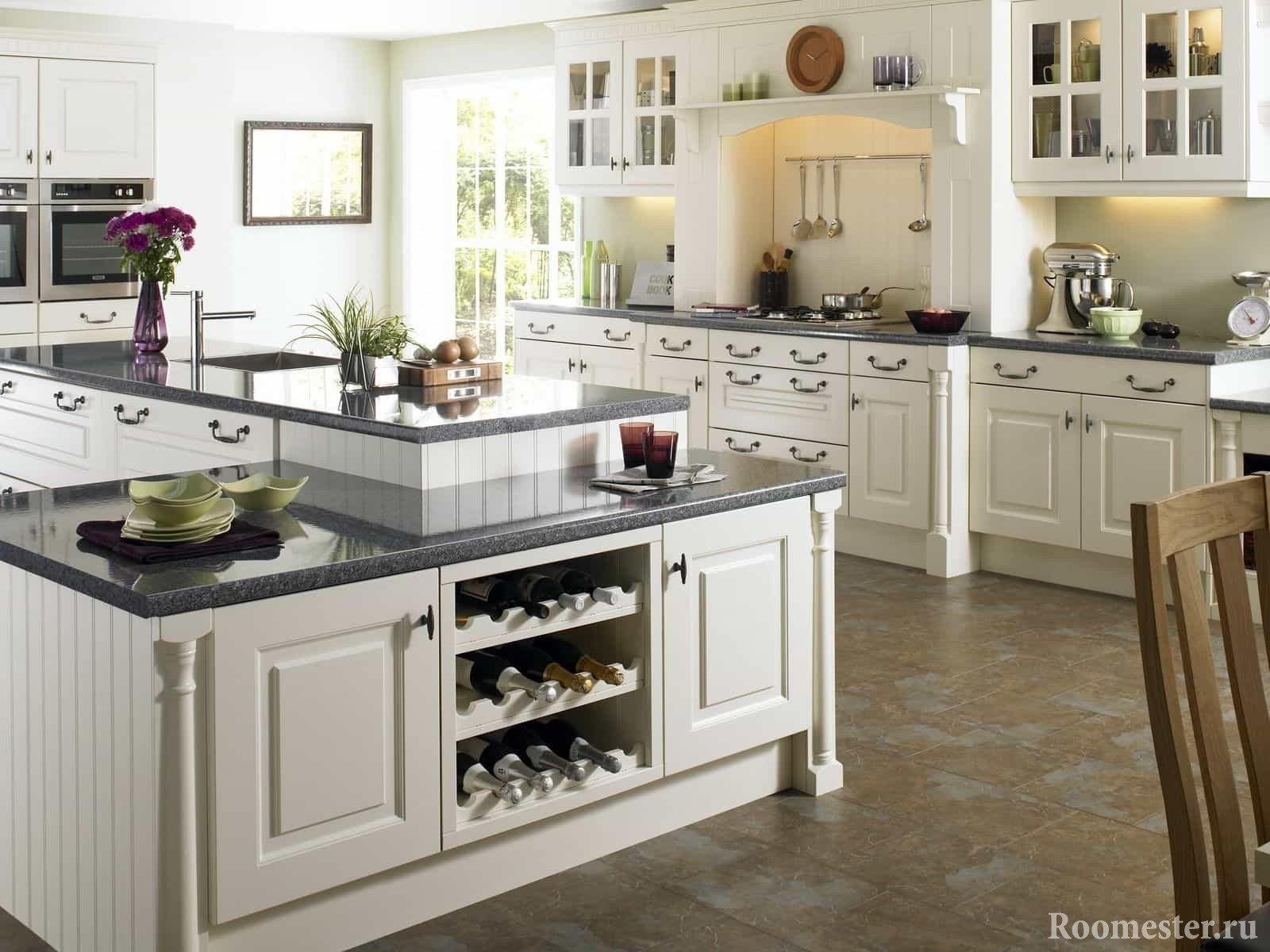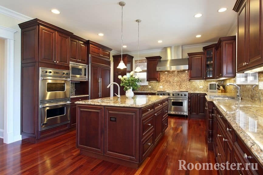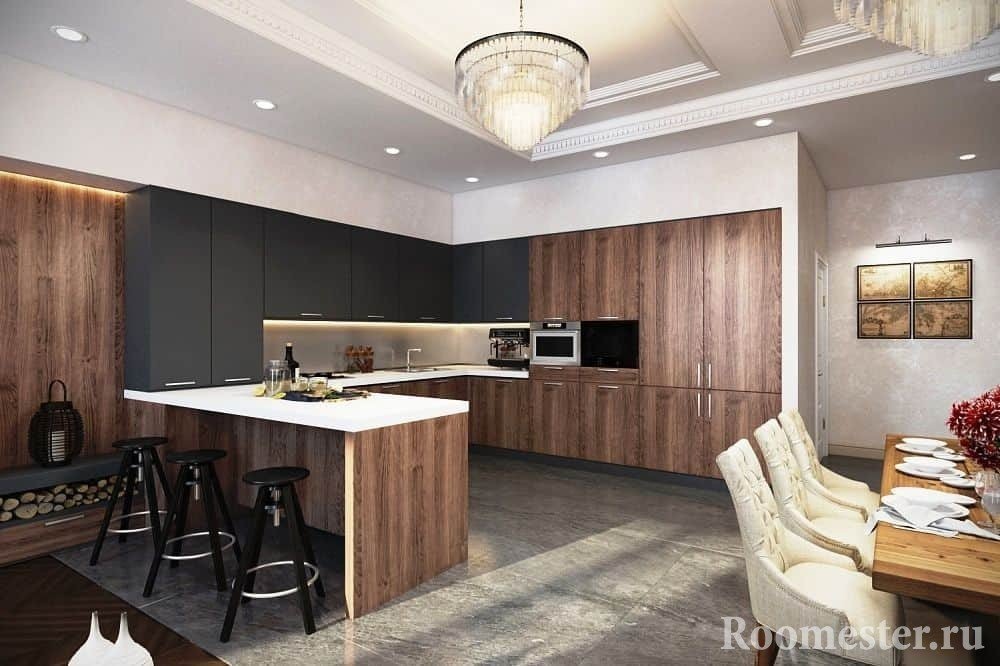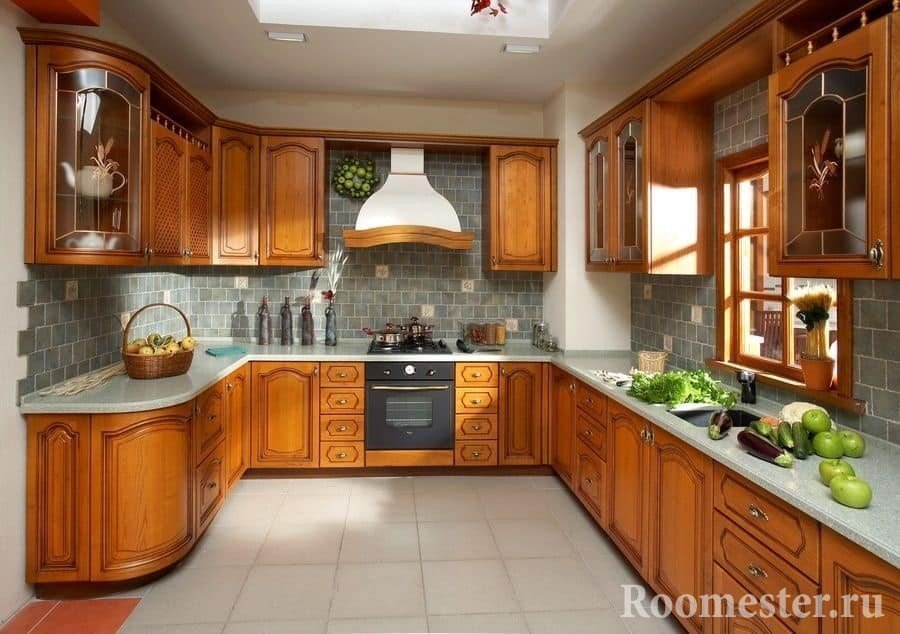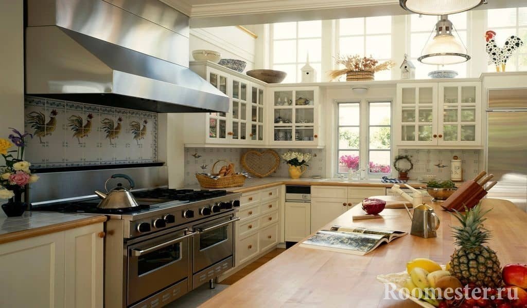 Para darle al diseño de una cocina grande un estilo clásico, vale la pena hacer un sesgo hacia el país.
