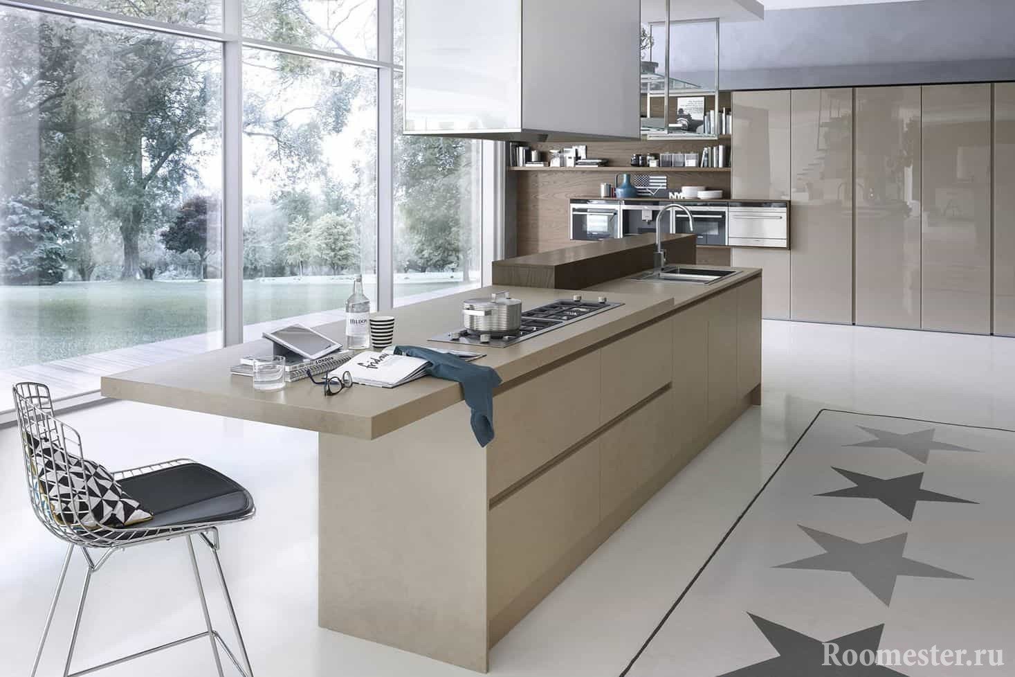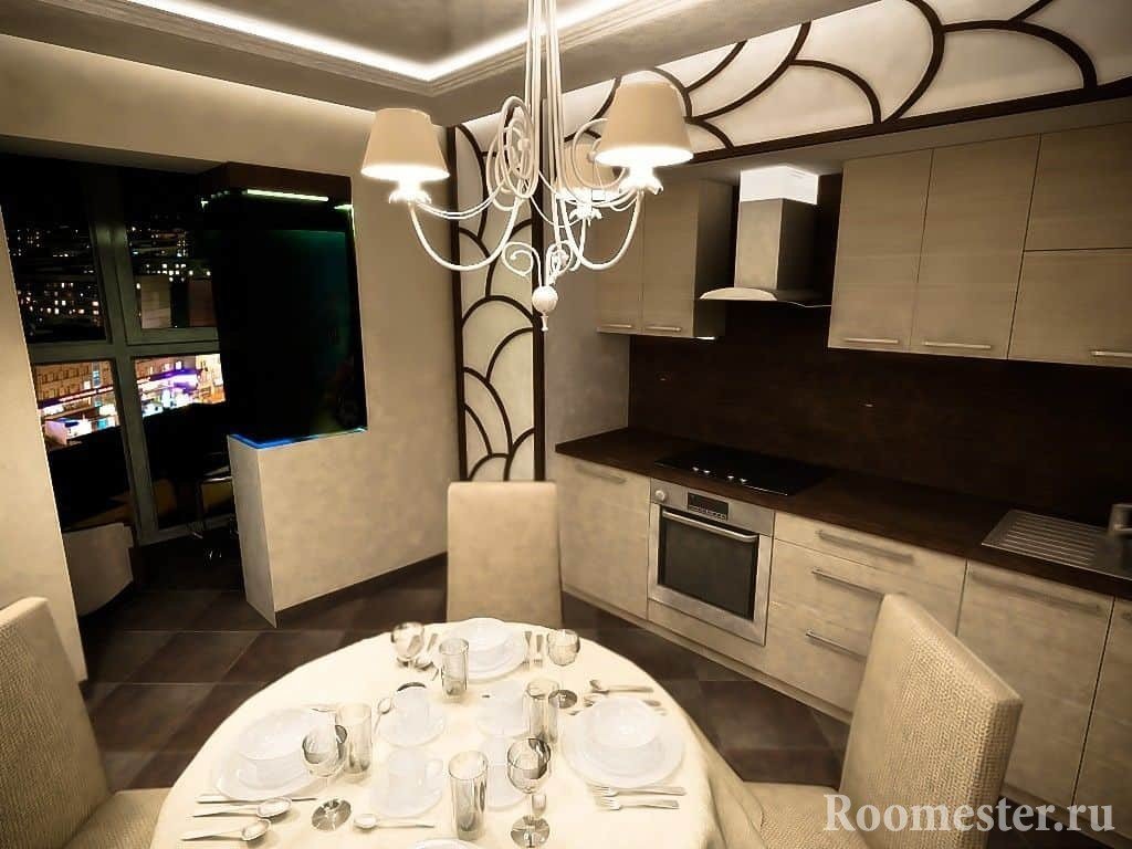 El diseño de la gran cocina permite el uso de electrodomésticos modernos, integrados en los muebles. La integración de una máquina de café, una cosechadora, un lavavajillas y otros equipos le permite usar la cocina con un nivel de comodidad decente.