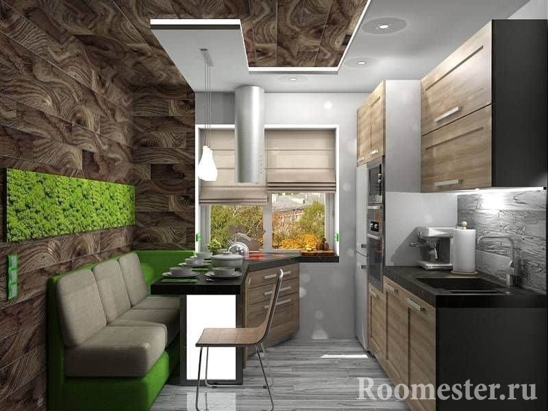 El diseño se apoya en vidrieras, paneles y otros elementos. Para hacer espacio en una cocina grande, para hacerlo aún más libre, use muebles transformables. Entre ellos: varias mesas con una tapa plegable, un aumento en el área de trabajo cerca de la ventana, la disposición de la abertura de la ventana con estantes. La funcionalidad agregará varios sistemas de almacenamiento para productos bajo techo, mesa o nicho organizado.