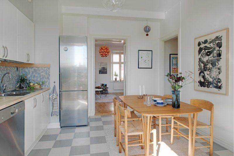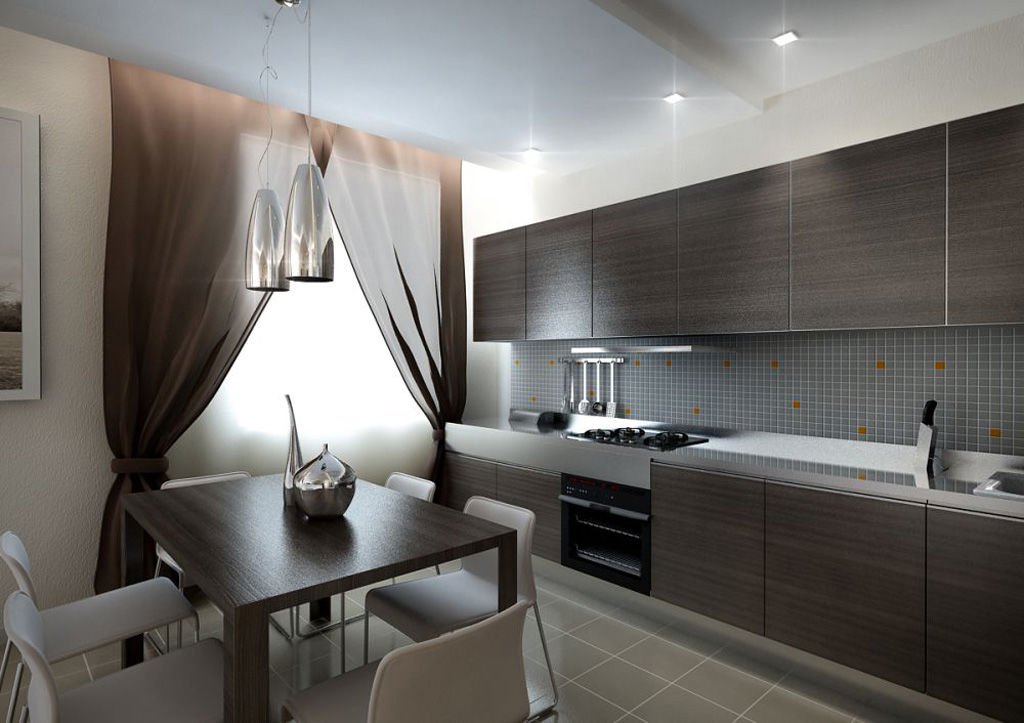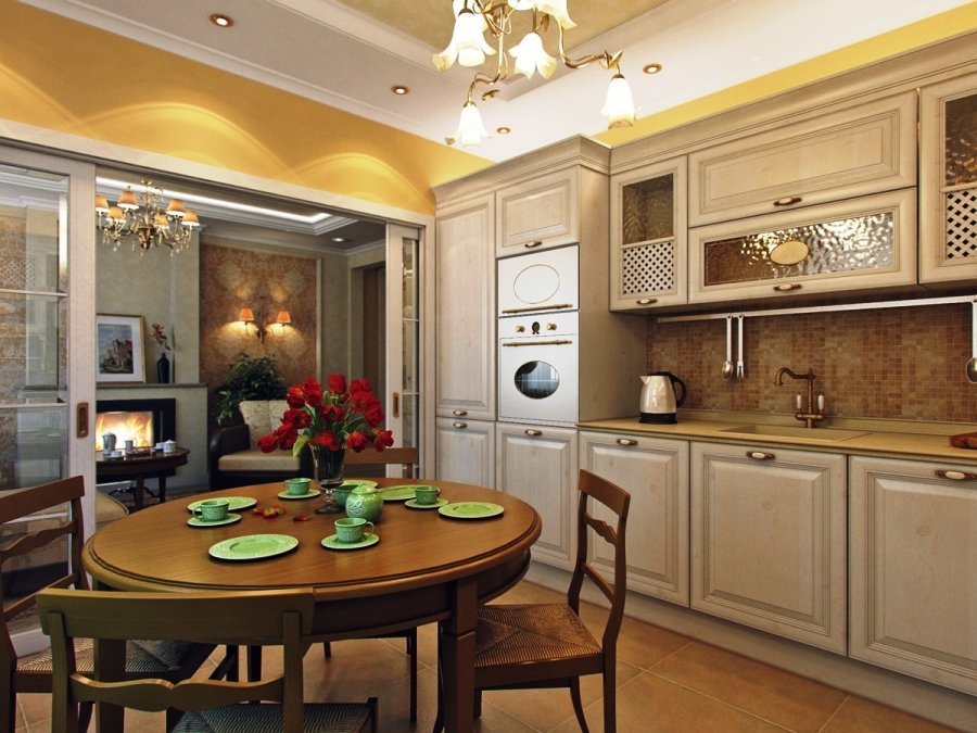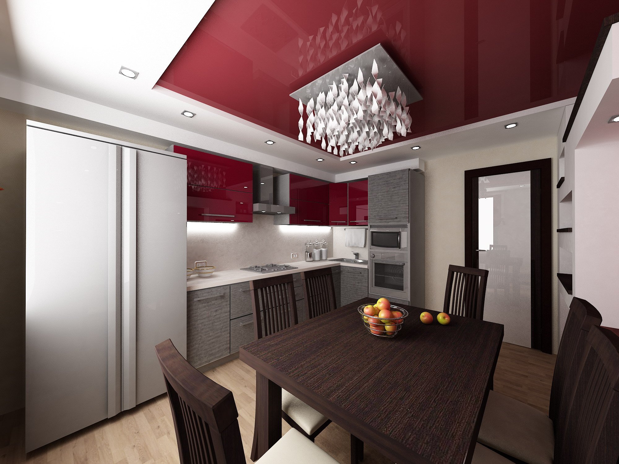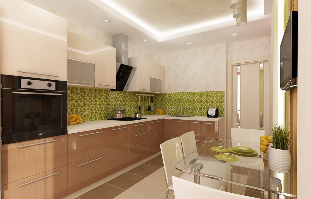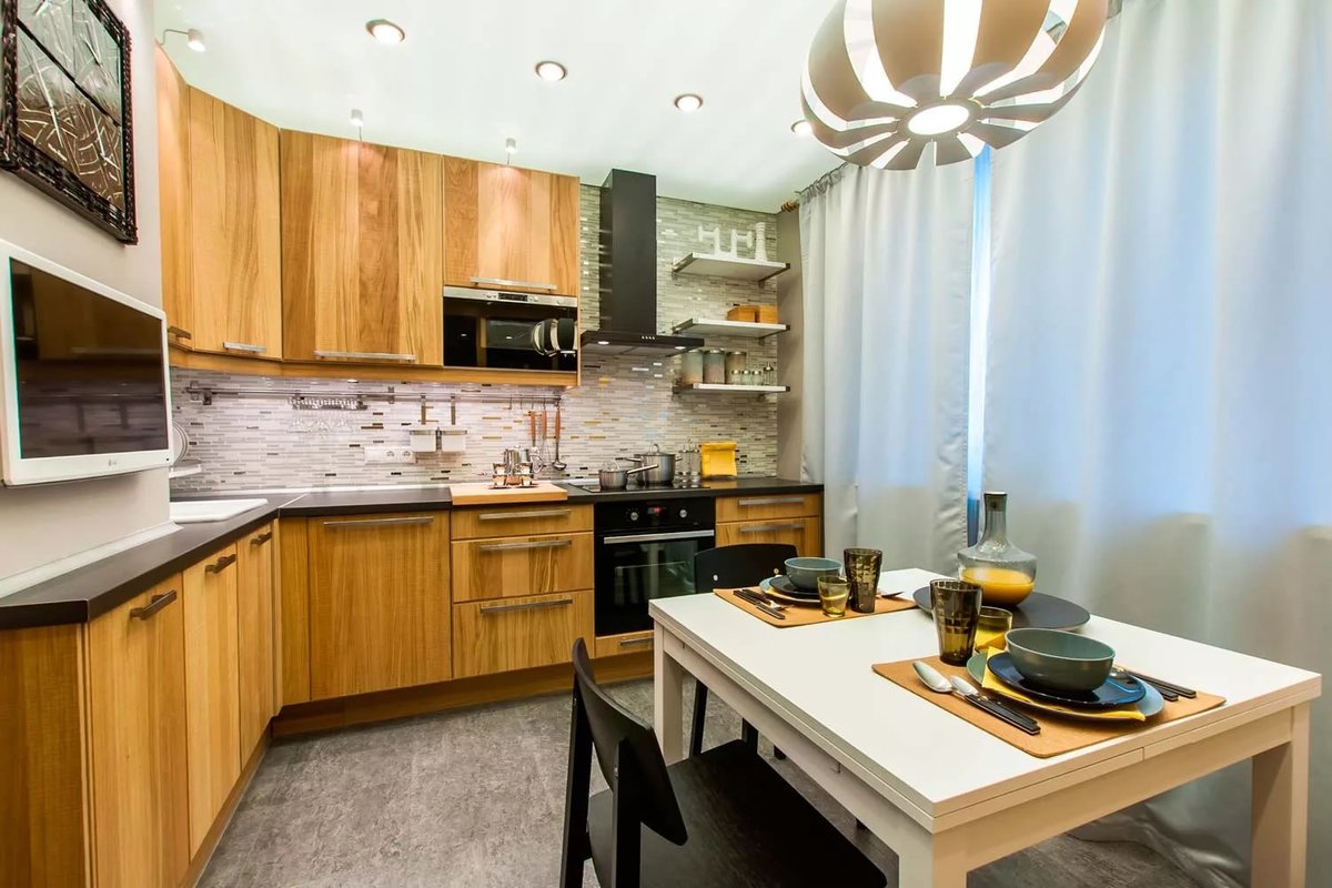 La cocina es la zona más "malhumorada" del apartamento. El final aquí es atacado por salpicaduras de agua y grasa. Debe estar preparada para ser frotada sin piedad con cepillos duros y probada con productos químicos cáusticos. Esto es especialmente cierto para el "delantal". Elija materiales duraderos para ello: baldosas, gres porcelánico, mármol, piedra decorativa, vidrio. Las zonas restantes no son "atacadas" por los dispositivos de limpieza. Se pueden pintar, pegar con papel tapiz, corcho o paneles de madera, revestimiento. El techo puede ser suspendido, suspendido o combinado. En algunos estilos, la Provenza o el país debajo se fijan con vigas de madera natural. Las baldosas cerámicas o las baldosas de porcelana sin costuras se colocan en el piso, se recortan con linóleo, paneles de vinilo, laminado impermeable, corcho.