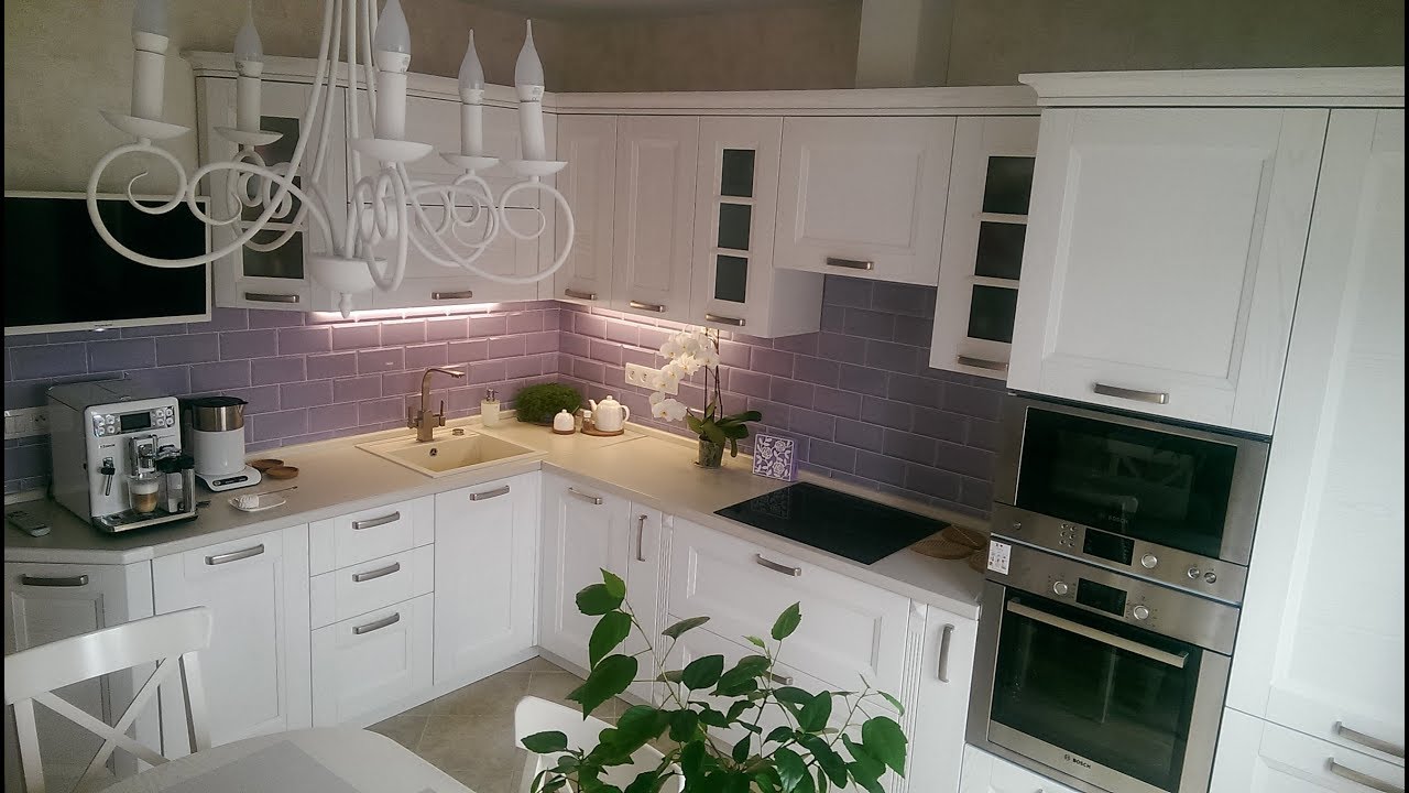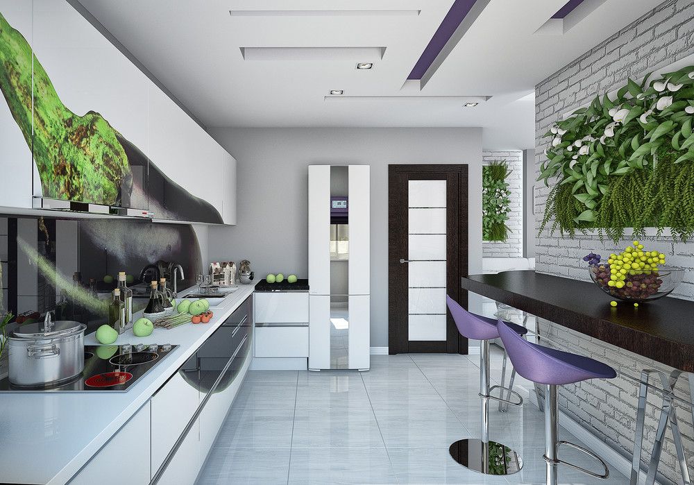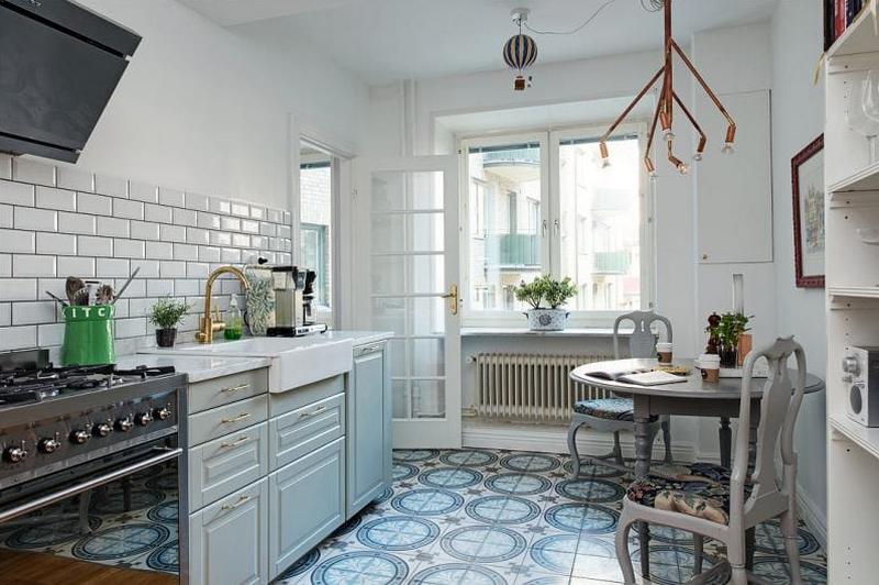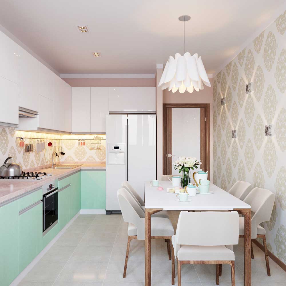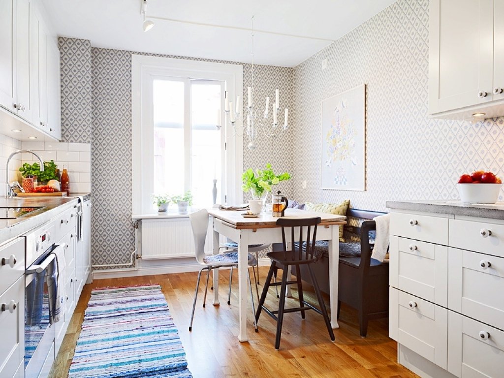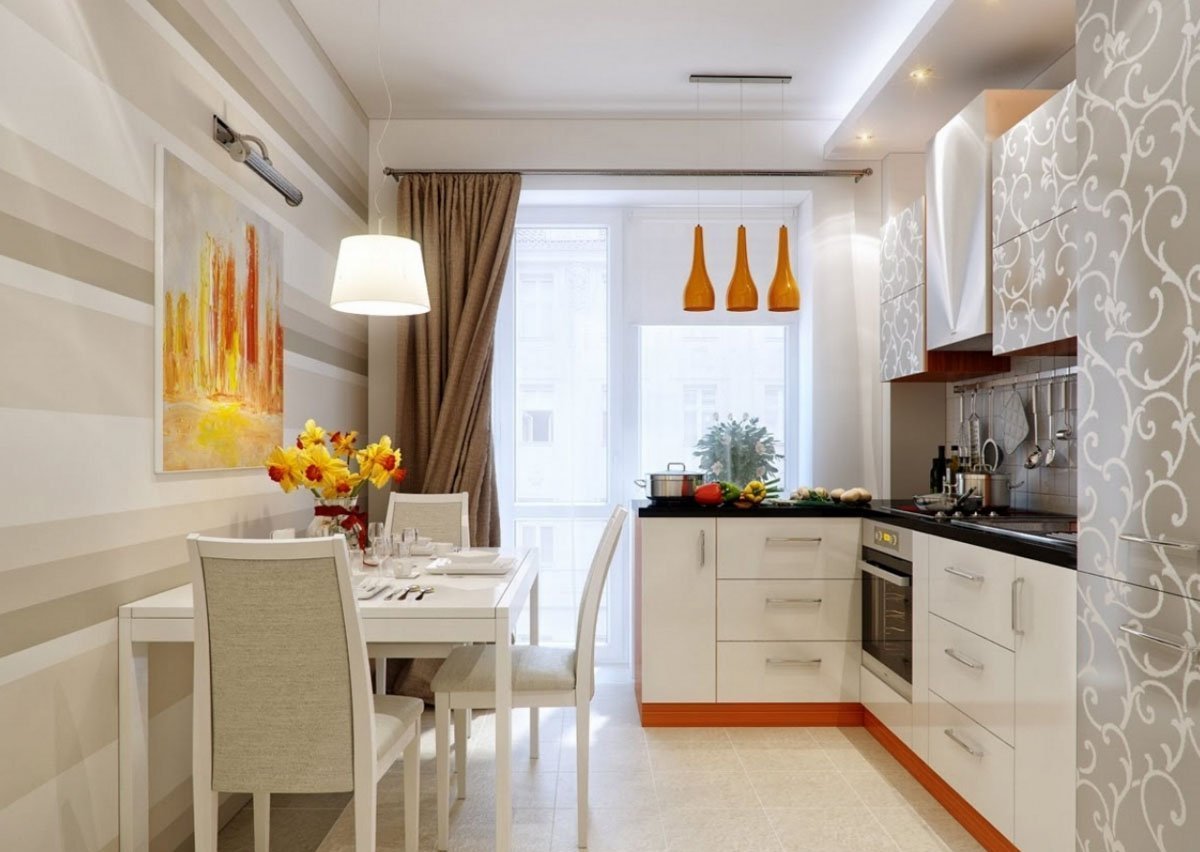 La cocina es la zona más "malhumorada" del apartamento. El final aquí es atacado por salpicaduras de agua y grasa. Debe estar preparada para ser frotada sin piedad con cepillos duros y probada con productos químicos cáusticos. Esto es especialmente cierto para el "delantal". Elija materiales duraderos para ello: baldosas, gres porcelánico, mármol, piedra decorativa, vidrio. Las zonas restantes no son "atacadas" por los dispositivos de limpieza. Se pueden pintar, pegar con papel tapiz, corcho o paneles de madera, revestimiento. El techo puede ser suspendido, suspendido o combinado. En algunos estilos, la Provenza o el país debajo se fijan con vigas de madera natural. Las baldosas cerámicas o las baldosas de porcelana sin costuras se colocan en el piso, se recortan con linóleo, paneles de vinilo, laminado impermeable, corcho.