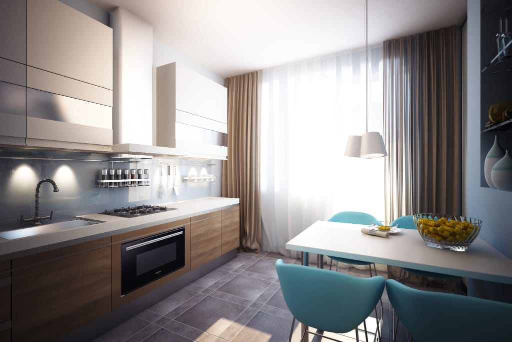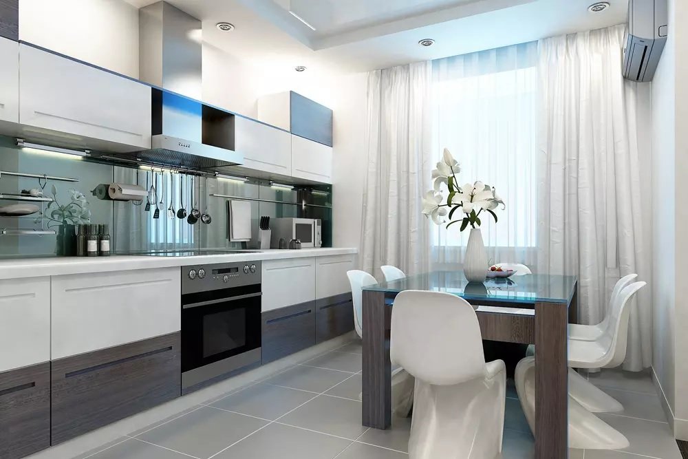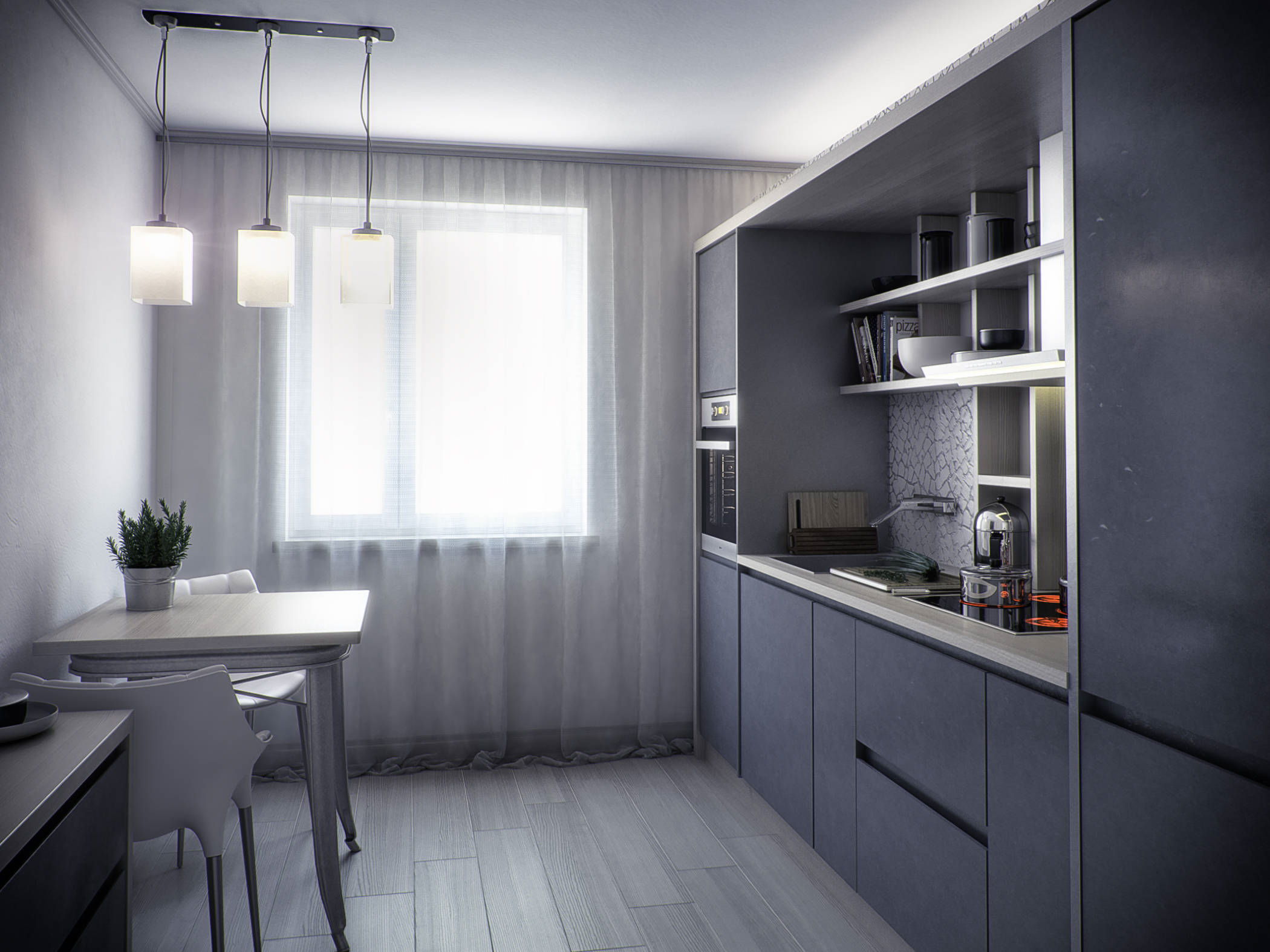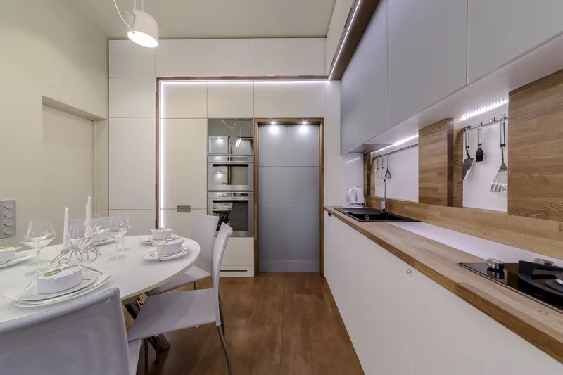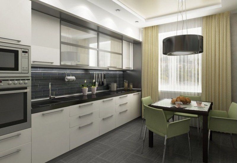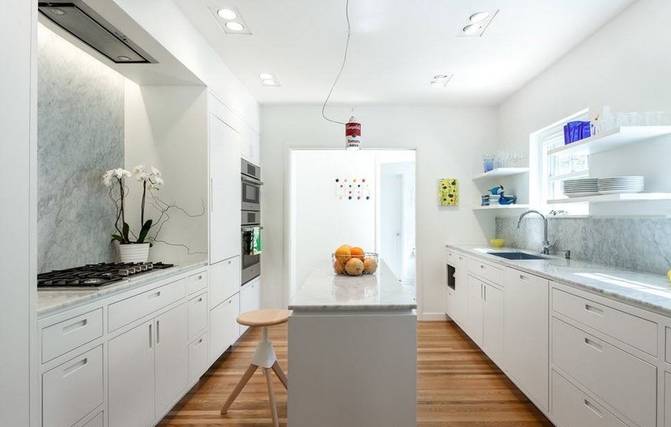 paralelo: los muebles se colocan a lo largo de las paredes en dos filas. El paso entre ellos debe ser de al menos 1,2 metros. En dicha cocina caben dos o tres chefs simultáneamente.