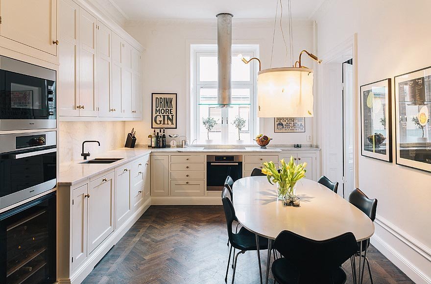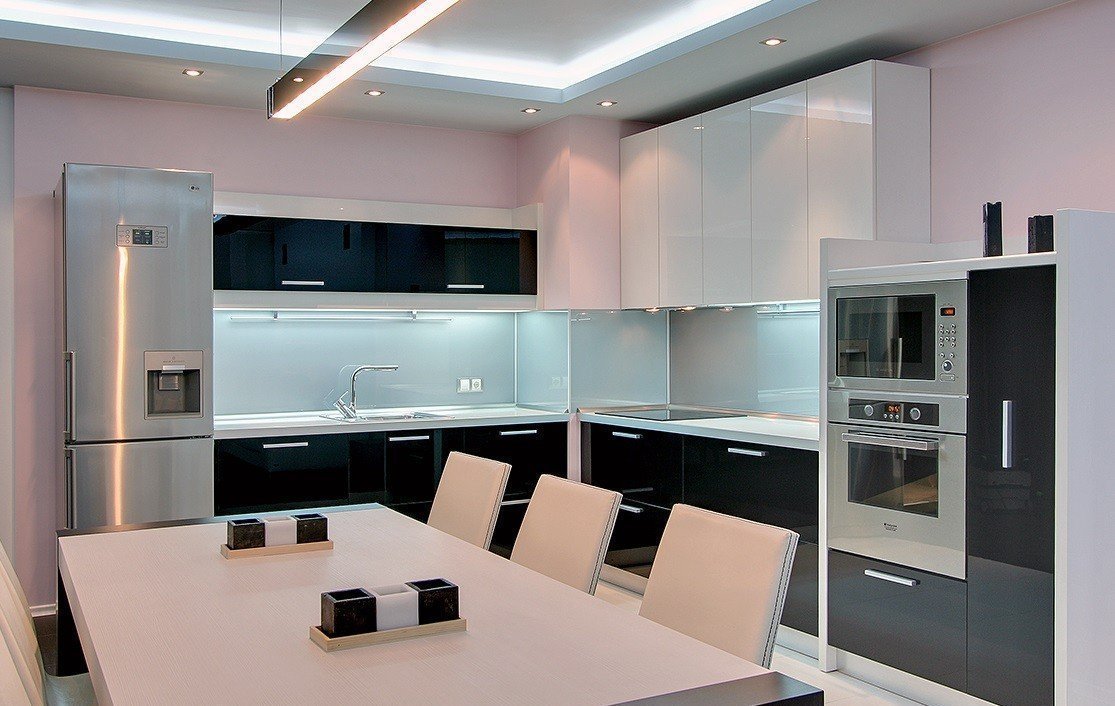 Hay varias zonas funcionales en la cocina; piense en una solución de iluminación para cada una de ellas. Las áreas de trabajo y comedor deben tener iluminación local. Agregue algunas lámparas, una tira de LED debajo del nivel superior o solicite una cocina con dispositivos incorporados. En el comedor, luces colgantes, apliques son apropiados. Rechace las lámparas fluorescentes frías: distorsionan el verdadero color de los alimentos.