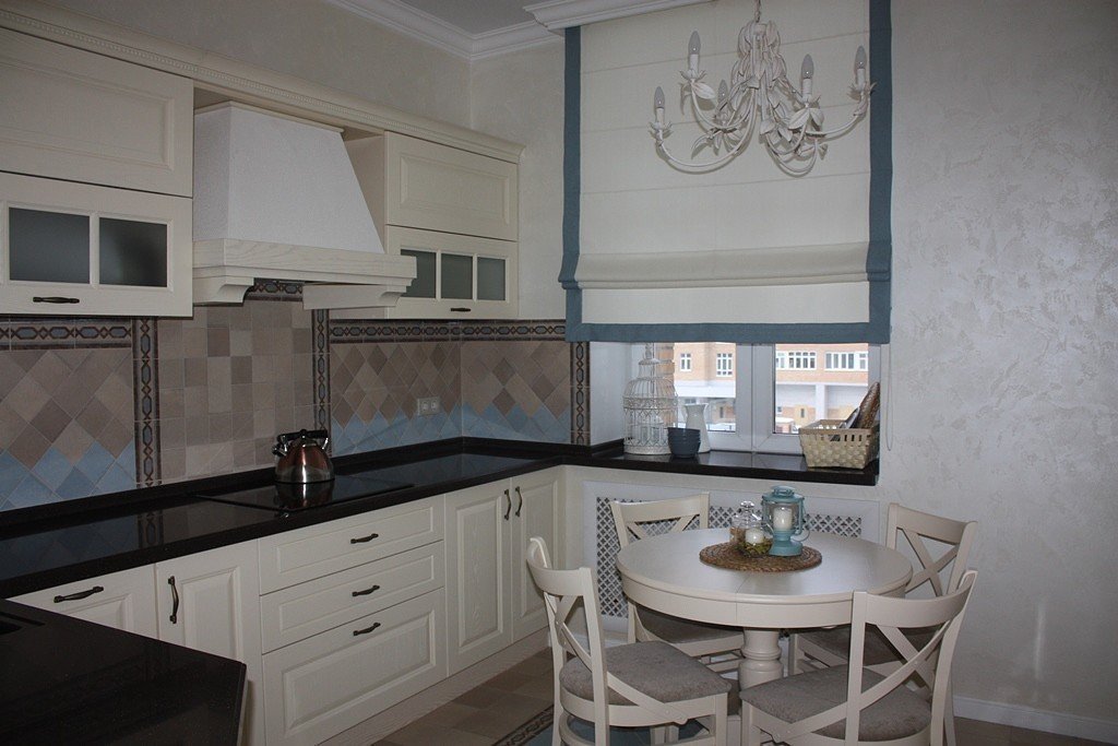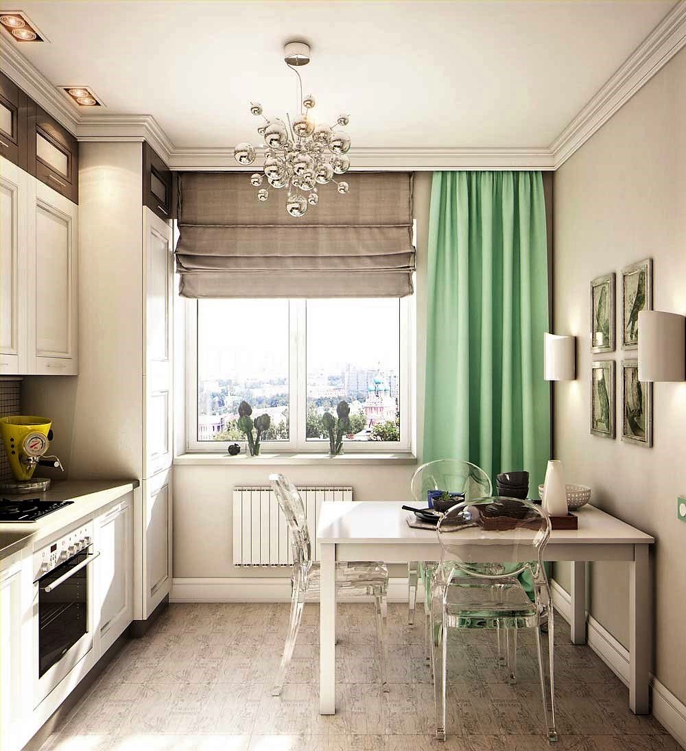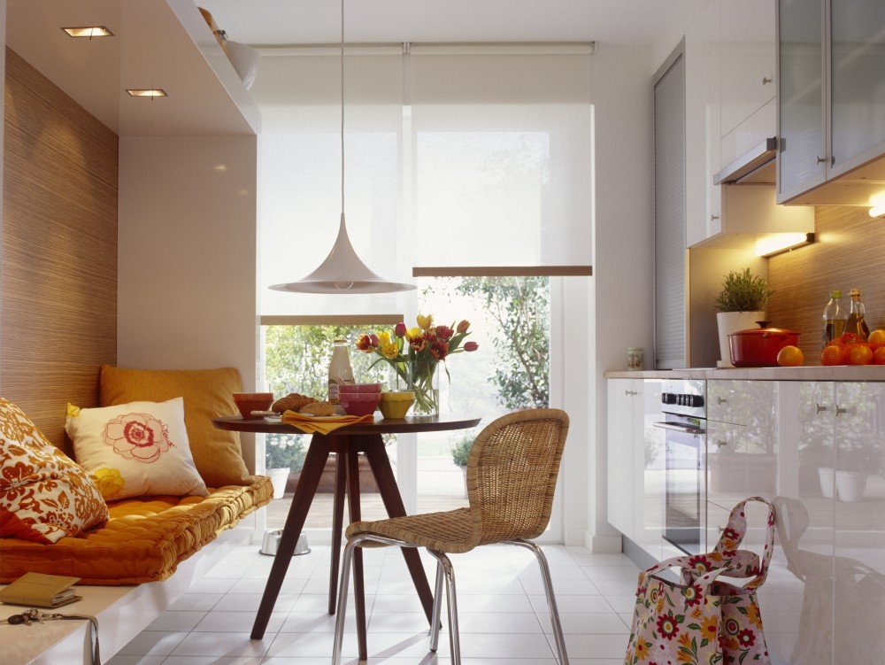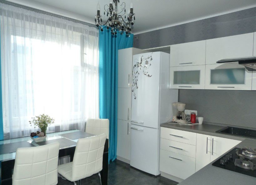 Al elegir cortinas para la cocina, prefiera modelos prácticos y simples hechos de telas fáciles de lavar. Para no sobrecargar el interior de pintura ya saturado, use telas lisas. Pero en medio de muebles neutros y acabados claros, las cortinas con dibujos pueden convertirse en un acento espectacular. Los más convenientes para esta habitación son romanos, persianas enrollables, paneles japoneses, cortinas de café. Es poco probable que las cortinas clásicas sean apropiadas, excepto en el área de la logia adjunta a la habitación principal.