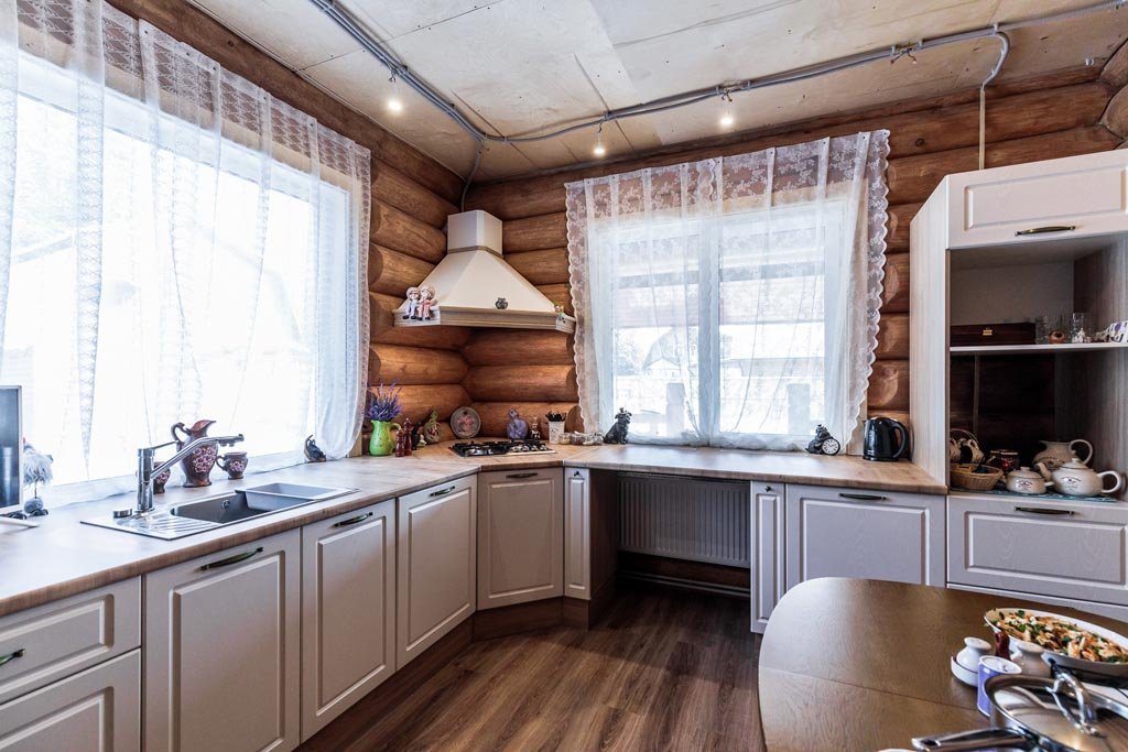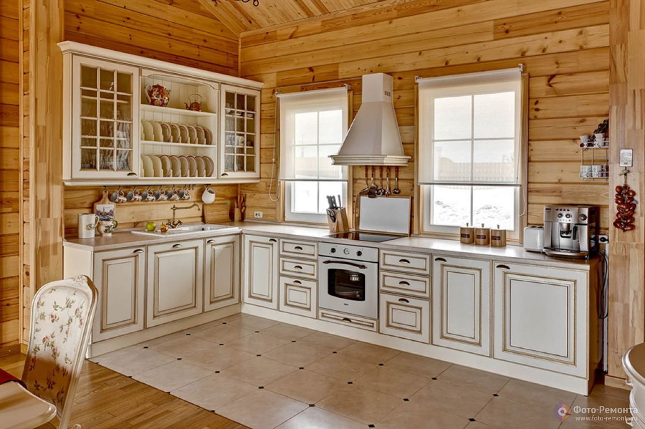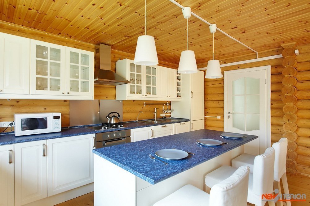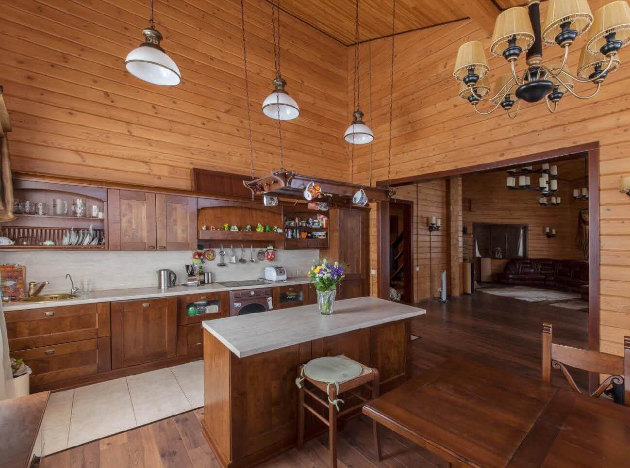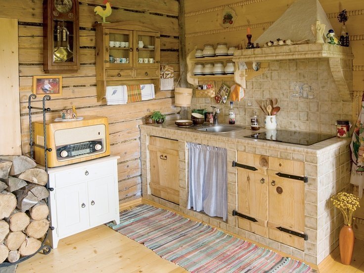 En los estilos étnicos tradicionales, la cocina se puede terminar a bajo precio e incluso con materiales improvisados. Las paredes están forradas con paneles de madera o forradas con forro, y las tablas pulidas en los troncos se colocan en el piso. El techo a veces generalmente se deja en su forma original con vigas, ya que algunos interiores solo aceptan tal decisión (chalet, país). También se puede recubrir con yeso de color claro, una opción simple y práctica.