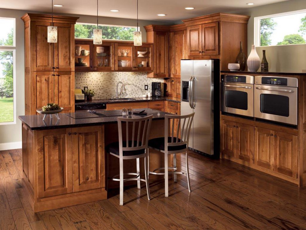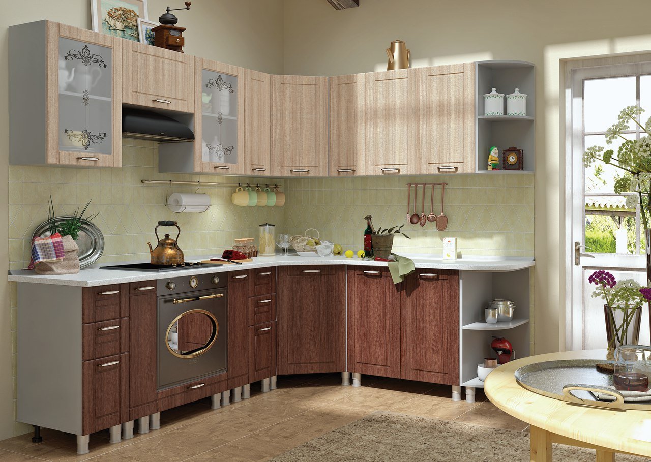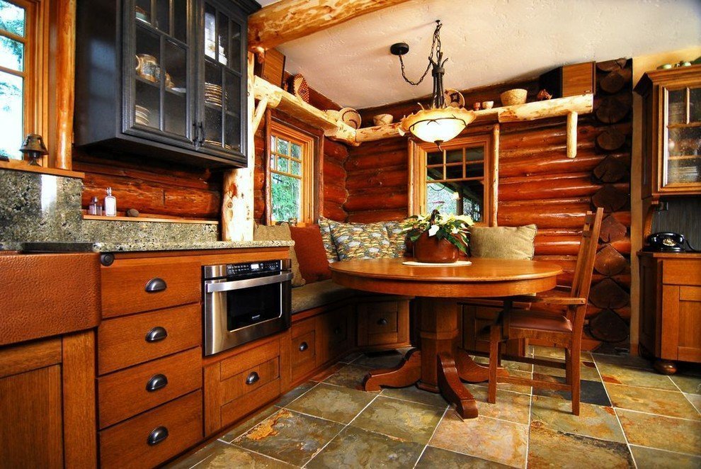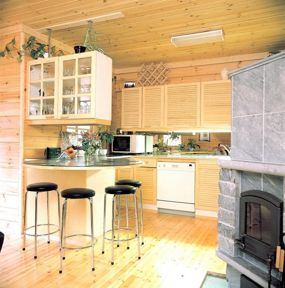 En los estilos étnicos tradicionales, la cocina se puede terminar a bajo precio e incluso con materiales improvisados. Las paredes están forradas con paneles de madera o forradas con forro, y las tablas pulidas en los troncos se colocan en el piso. El techo a veces generalmente se deja en su forma original con vigas, ya que algunos interiores solo aceptan tal decisión (chalet, país). También se puede recubrir con yeso de color claro, una opción simple y práctica.