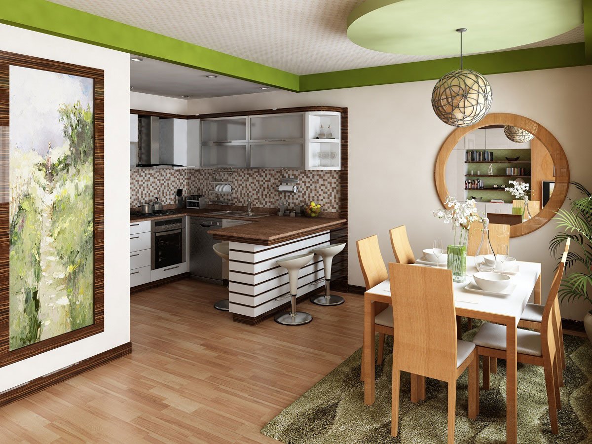 No se recomienda pegar sobre la cocina con papel de pared ordinario, es mejor usar modelos lavables especiales. En interiores más caros, se utilizan baldosas para terminar el delantal y el piso. Este material es fuerte y duradero, no sensible a los productos químicos domésticos y temperaturas extremas. En el desván, se usa ladrillo.Art Nouveau, minimalismo y estilo de castillo gravitan hacia la piedra natural. La opción de revestimiento más duradera en este momento se considera un piso a granel. Su instalación costará un centavo, pero puede olvidarse de reemplazar la superficie durante muchos años. Se recomienda dejar el parquet y el piso laminado para la decoración de otras habitaciones y reemplazarlo con linóleo más práctico con un diseño limpio.
