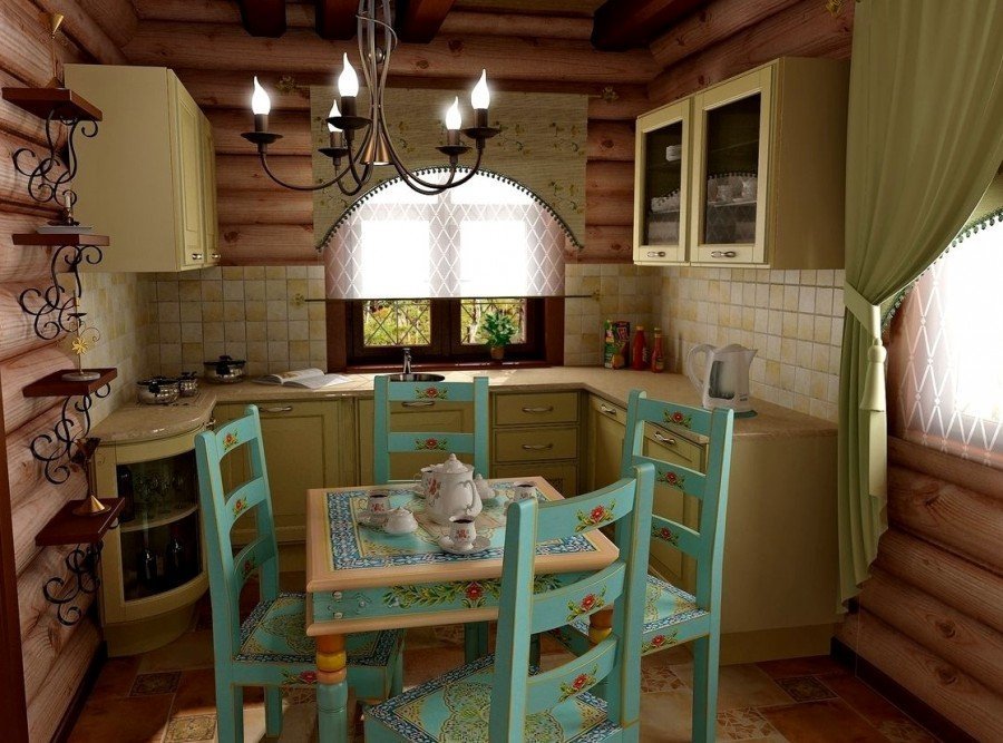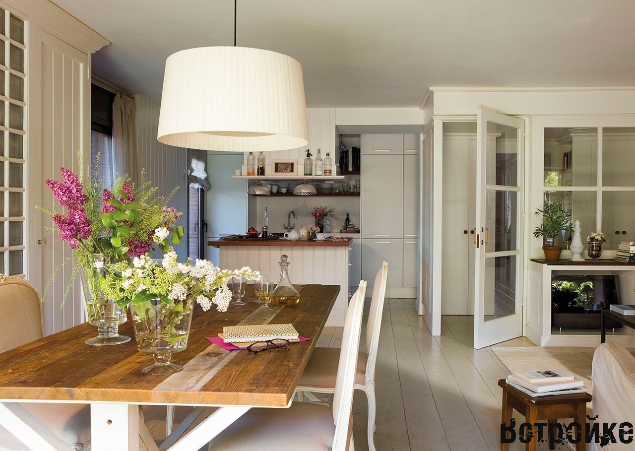 No te olvides de la iluminación. Necesariamente, la presencia no solo de una lámpara de techo central, sino también de electrodomésticos locales que ayudarán a iluminar el comedor o la encimera. Las opciones de país ganador se consideran estilos de pueblo. Y no solo porque son los más económicos en términos de compra de materiales de acabado y muebles. Estos estilos encarnan la idea de relajación en el interior, su atmósfera aún más distancia a la persona del ruido de los automóviles, la suciedad urbana y el “golpe” crónico de smog en el aire. En tales interiores, puede ir a descansar, sentirse como un residente de una aldea remota y disfrutar de todos los encantos de su vida. Para algunos, evitar los beneficios de la civilización es inaceptable, pero para otros se convertirá en un experimento agradable y útil.