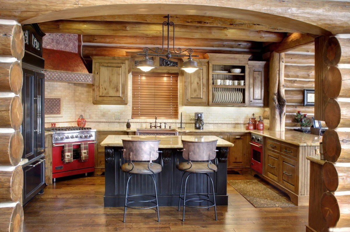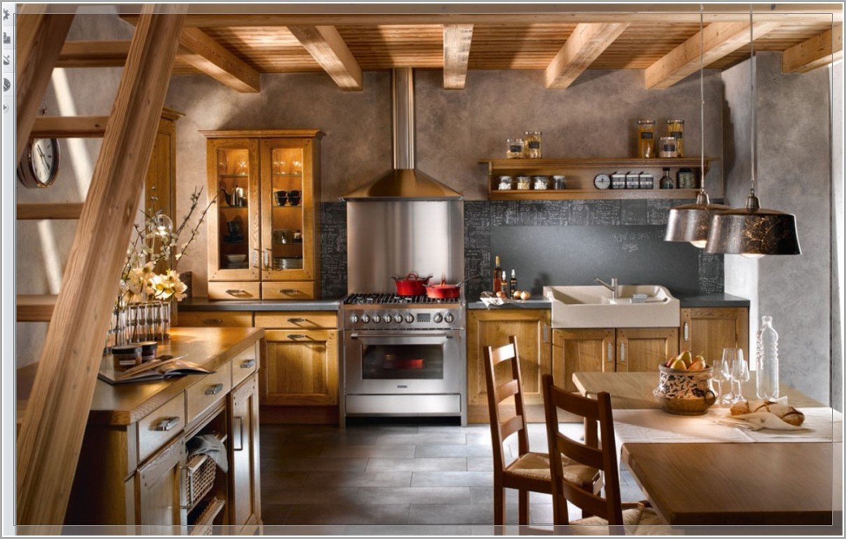 La cocina de estilo rústico está decorada en tonos marrones. Este color es característico de la madera, de la cual están hechos la mayoría de los elementos interiores. Una mesa masiva, más o menos procesada con una encimera de piedra lisa se coloca en el comedor. Se adjuntan sillas de mimbre con suaves cojines a cuadros en los asientos. En el techo durante la decoración, puede dejar las vigas de soporte, que se alternarán con yeso blanco, como en el estilo de un chalet. Los muebles también se eligen viejos con numerosos defectos en las superficies. Las paredes están decoradas con placas típicas del "tablón de anuncios" de Texas. La madera terminada a veces se alterna con ladrillos. Una lámpara de araña de hierro forjado que cuelga del techo completa la imagen interior.