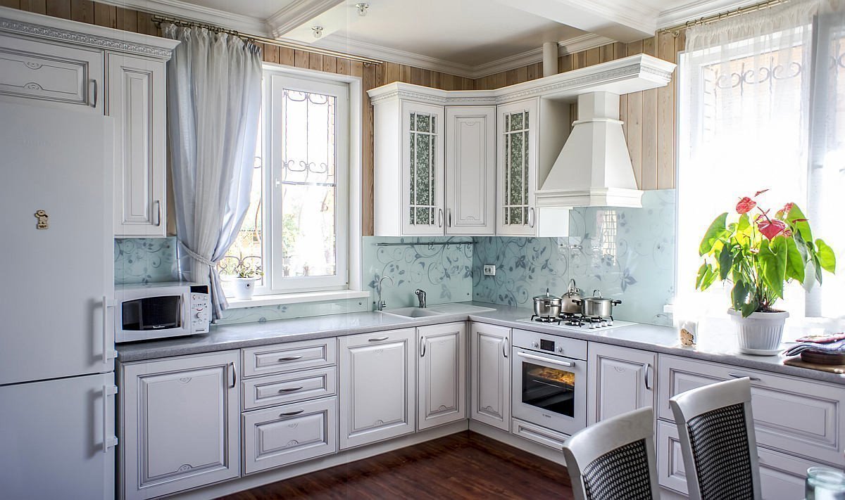 La cocina de estilo clásico está decorada en colores marrón pastel. Los colores claros se eligen como el tono principal: marfil, café con leche, nuez, beige. Las fachadas de los auriculares están decoradas con molduras en relieve con imitación de molduras de estuco, y las ventanas están cubiertas con lujosas cortinas romanas. En las paredes siempre hay pinturas o relieves, y en la atmósfera se supone que hay un lugar para una estatua en miniatura. Los muebles tienen líneas suaves y suaves de doblado, y el techo está coronado con una lámpara de araña dimensional de cristal con numerosos detalles rizados. Tal cocina no es propicia para el enlatado, por lo que la diversión del verano se transfiere necesariamente al verano en una habitación separada en un ambiente más relajado y hogareño.