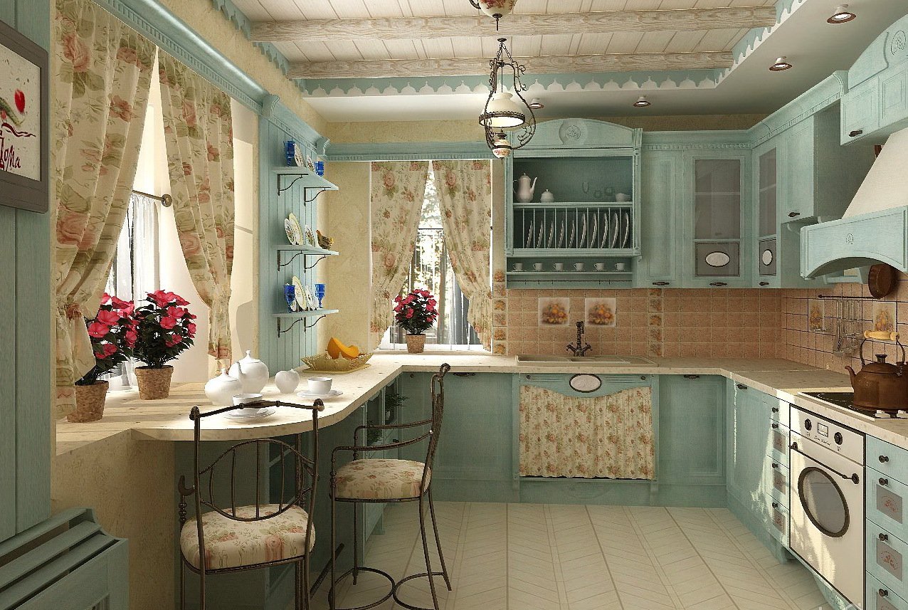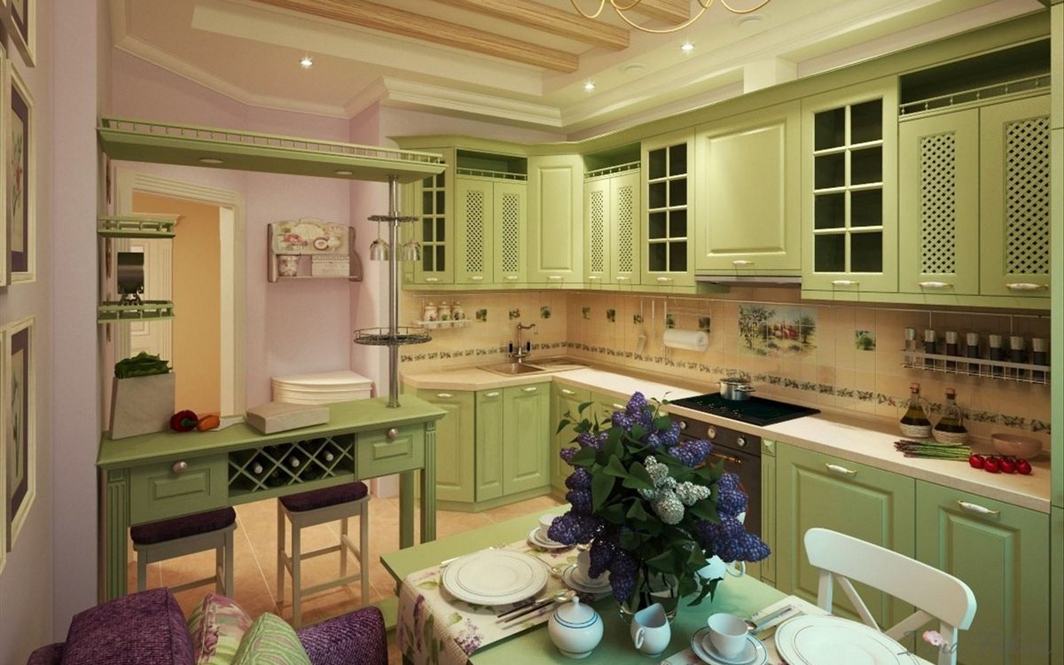 El blanco reina en Provenza. Este color se usa como fondo en el que juegan delicados tonos de lila, rosa, azul, turquesa, oliva y mostaza. En decoración, generalmente se usa papel tapiz en una flor pequeña. Las cortinas y un mantel están decorados con un patrón similar. Los muebles son deseables para usar a la vieja "abuela".Se ennoblece artificialmente con la ayuda de la pintura ligera y la técnica de decoupage, que se integra orgánicamente en el estilo. Entre los elementos decorativos, se prefieren numerosos jarrones, platos en soportes, ataúdes.