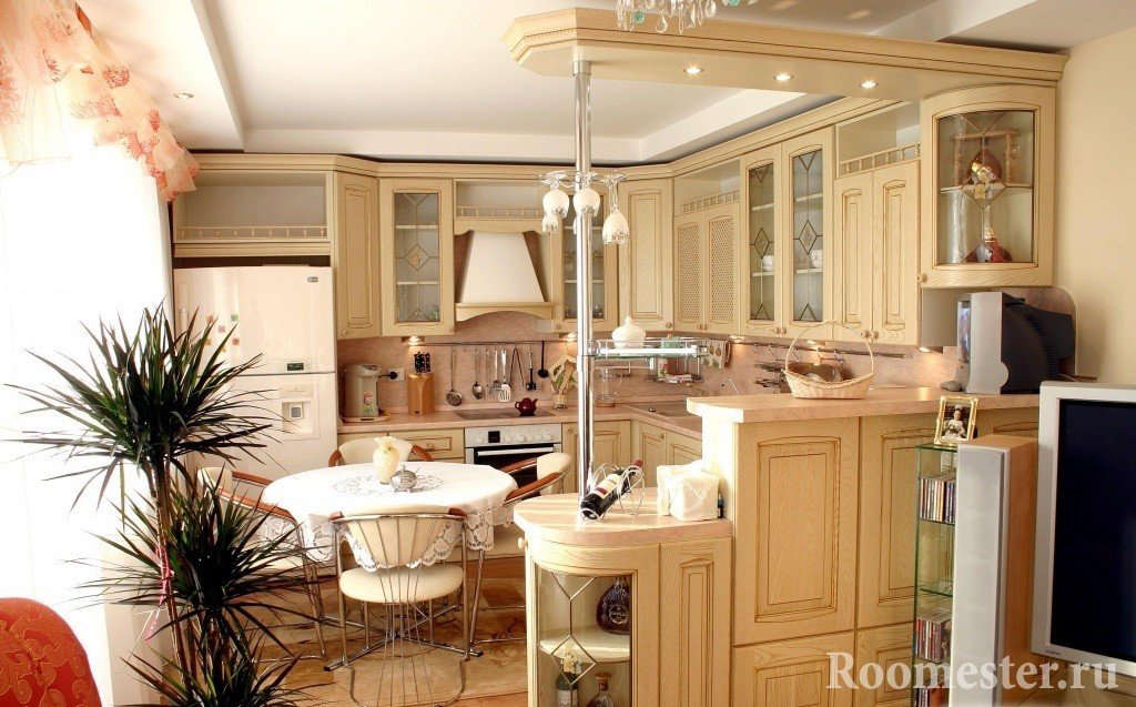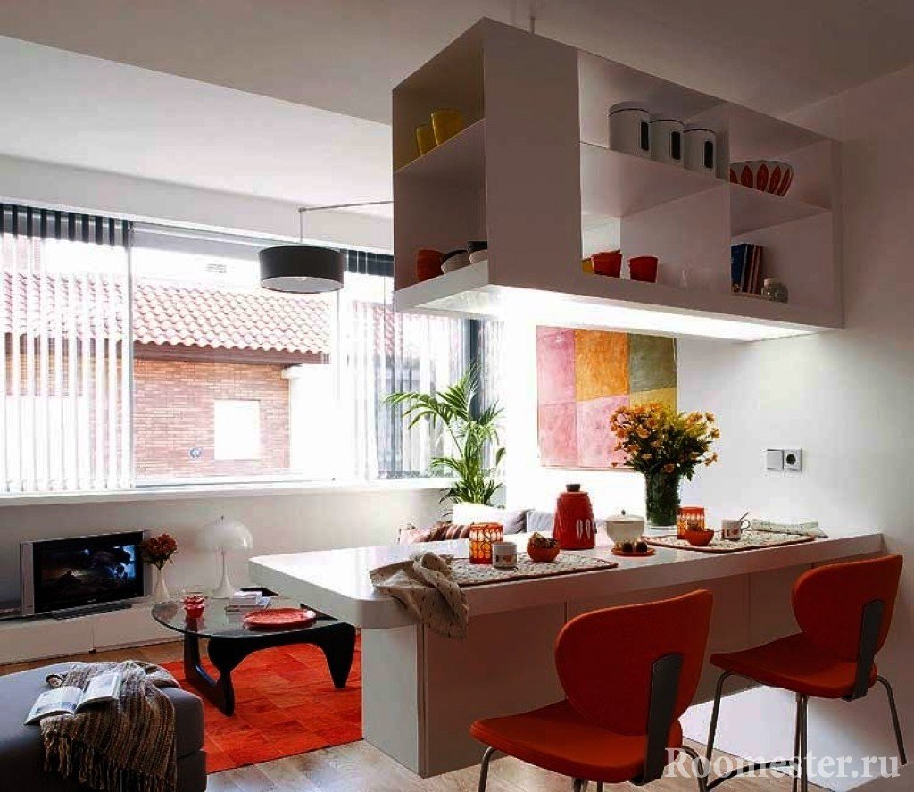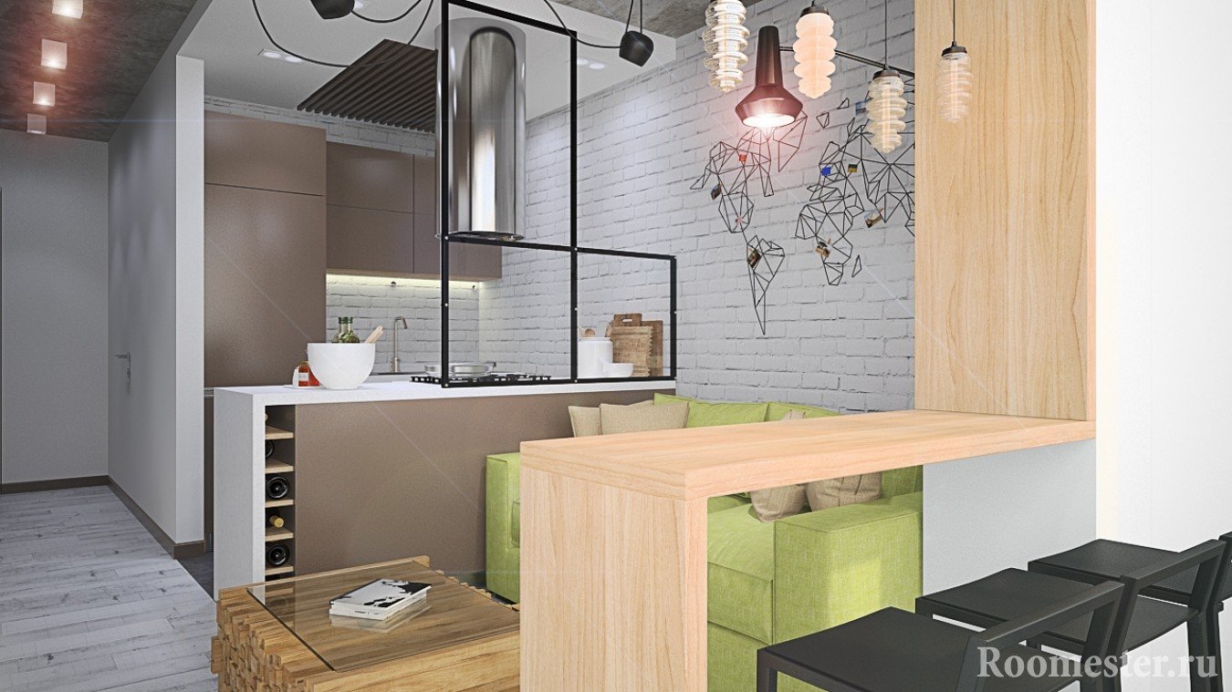 El mostrador del bar separa los lugares de cocción y almacenamiento de los utensilios de cocina del lugar equipado donde puede sentarse en la mesa, comer tranquilamente y conversar con familiares y amigos. Tenga en cuenta que este enfoque le permite mantener la higiene necesaria para la cocina.