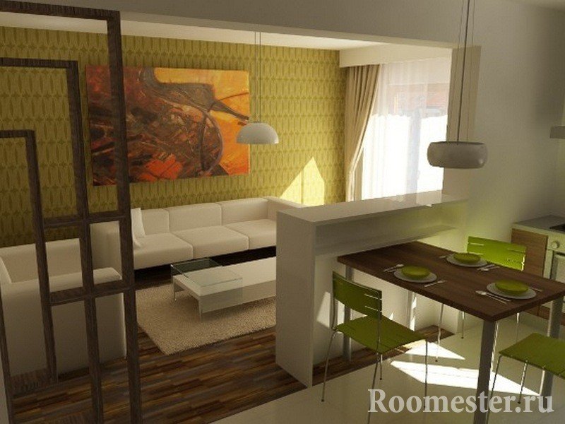 La zonificación de las instalaciones se lleva a cabo para dividirla en varias zonas funcionales domésticas necesarias. Para esto, las áreas individuales se asignan utilizando diferentes materiales, colores contrastantes, muebles e iluminación. Por lo tanto, el espacio abierto común del estudio puede combinar con éxito la sala de estar con la cocina.