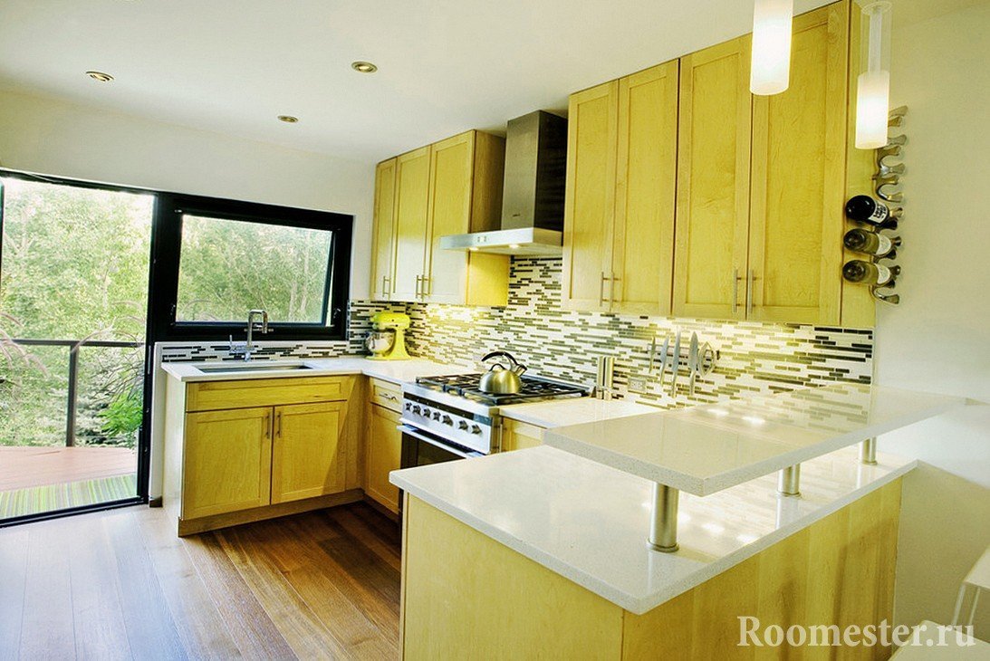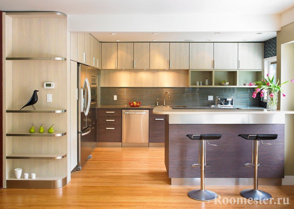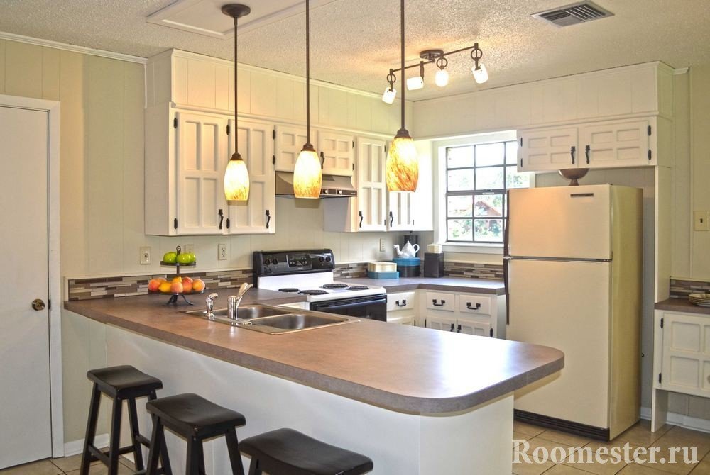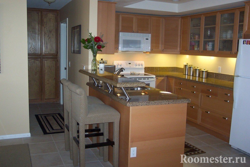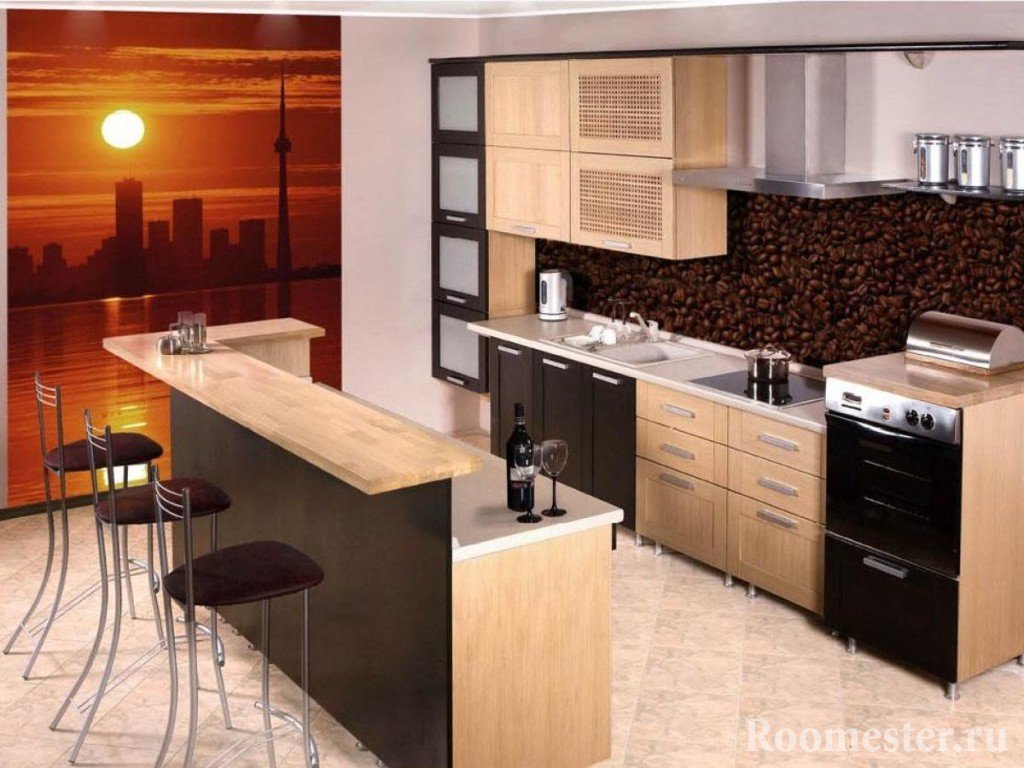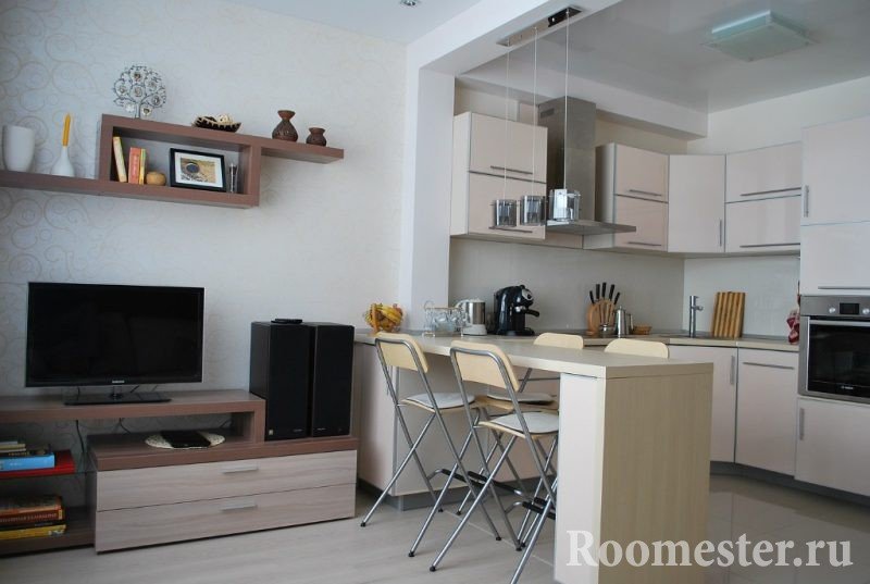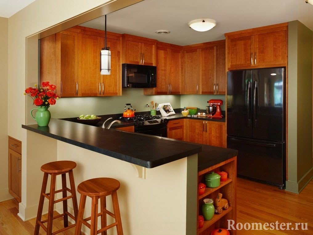 Sin embargo, debe tenerse en cuenta que dos paneles de un mostrador de barra ocupan un doble ancho. Con un tamaño mínimo, el ancho de dicho diseño no será superior a 60 cm. Para cocinas pequeñas, tal solución puede ser demasiado engorrosa.