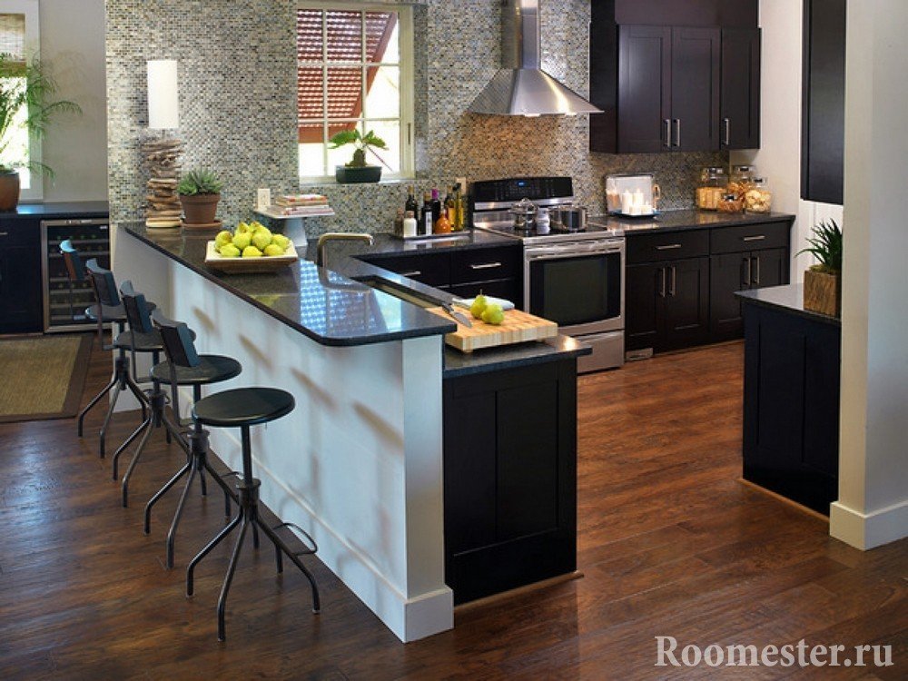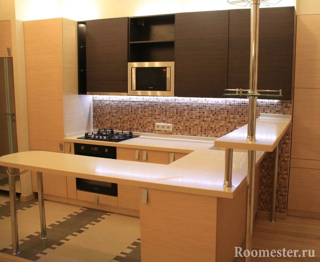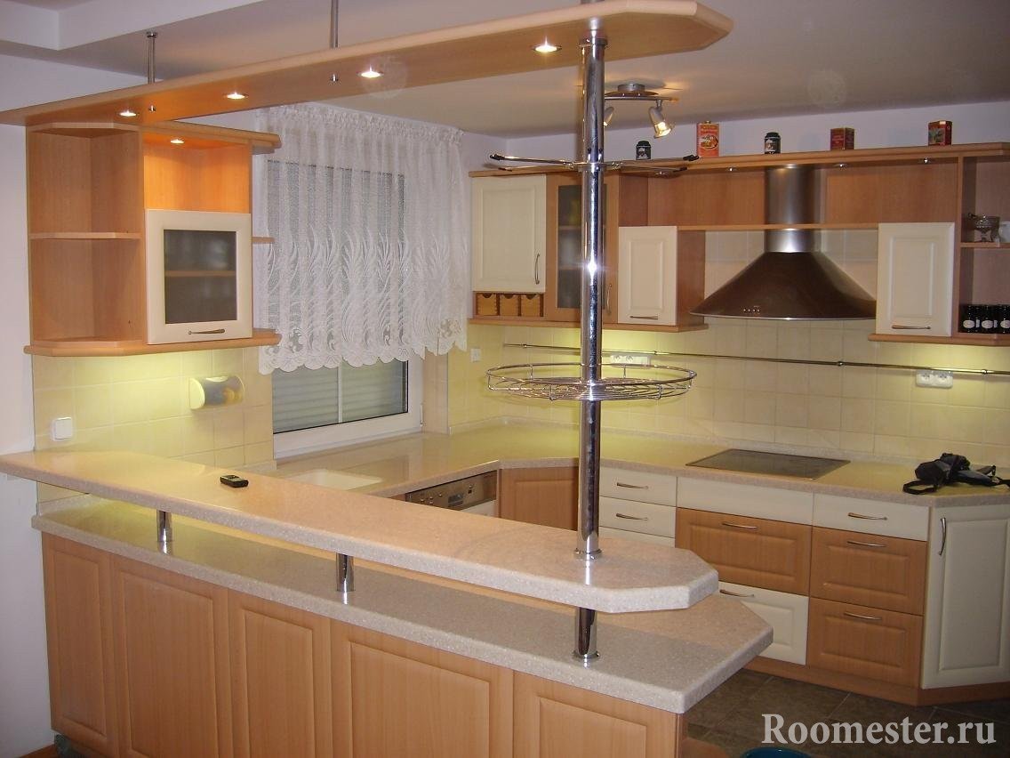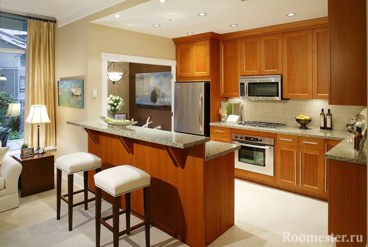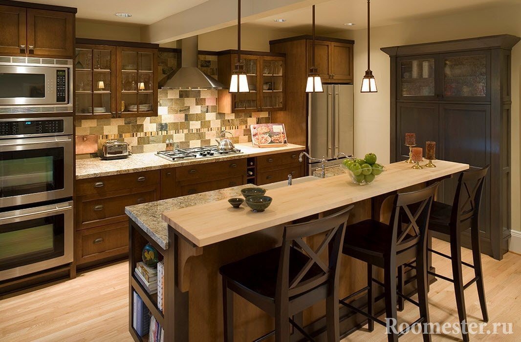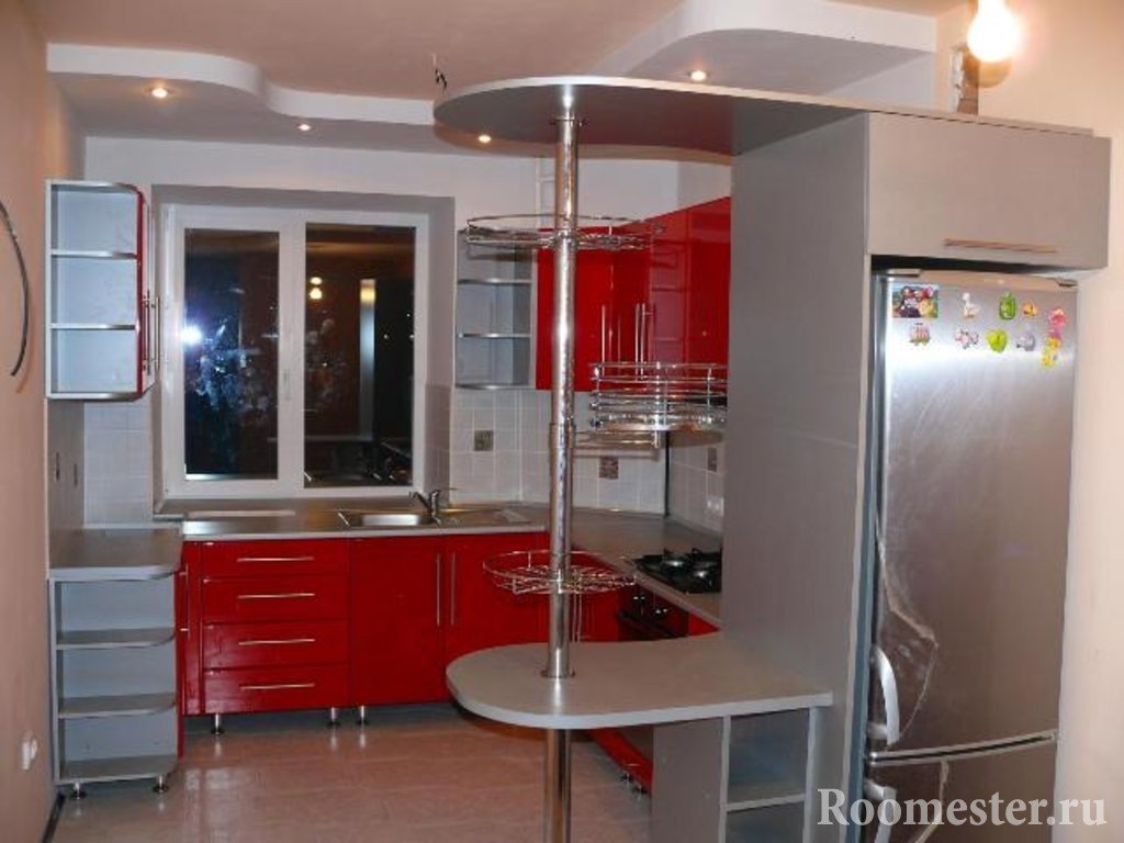 Sin embargo, debe tenerse en cuenta que dos paneles de un mostrador de barra ocupan un doble ancho. Con un tamaño mínimo, el ancho de dicho diseño no será superior a 60 cm. Para cocinas pequeñas, tal solución puede ser demasiado engorrosa.