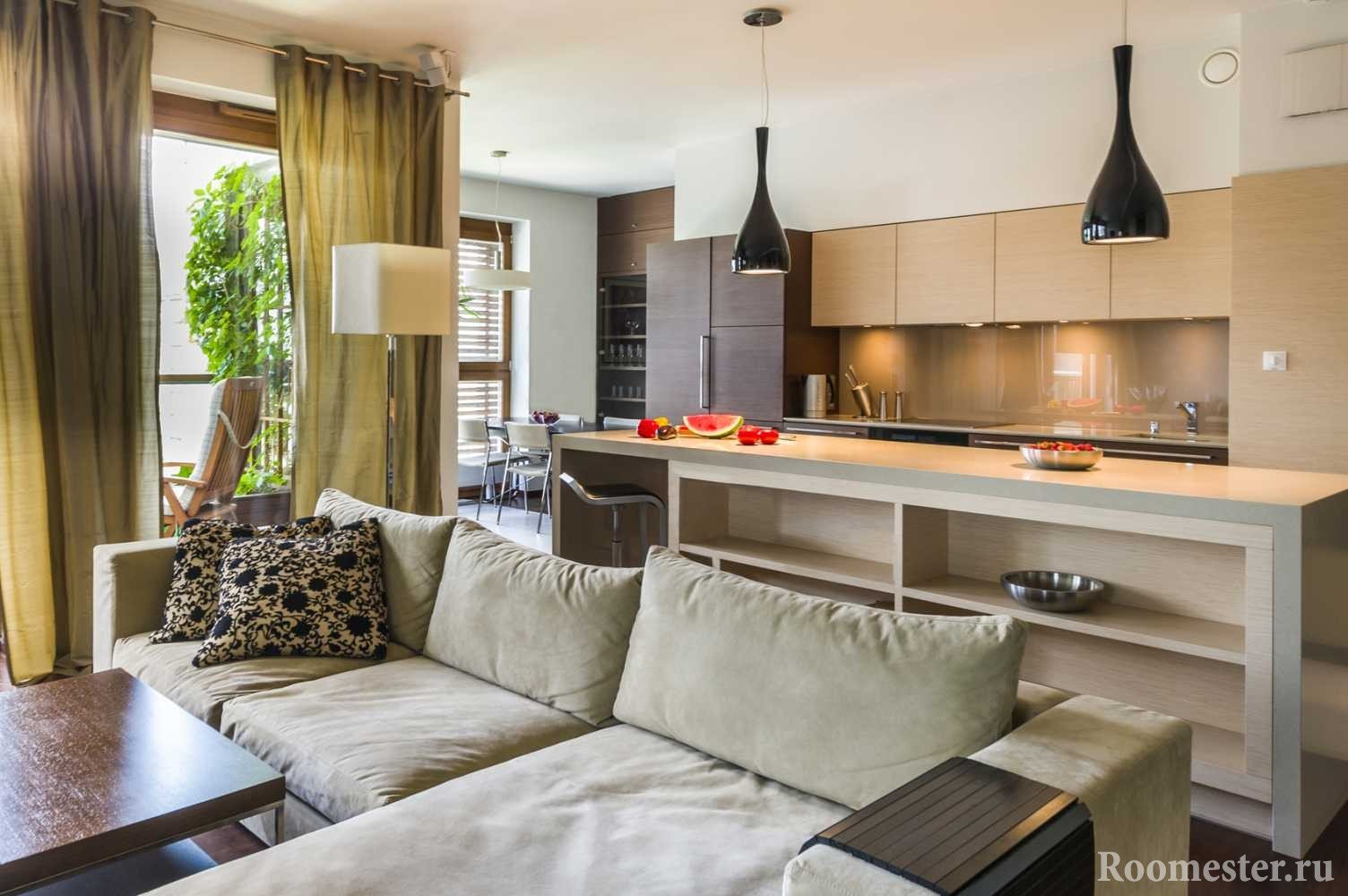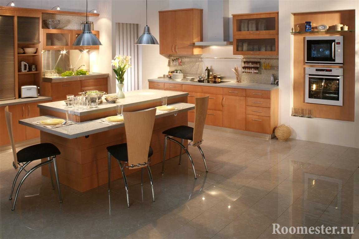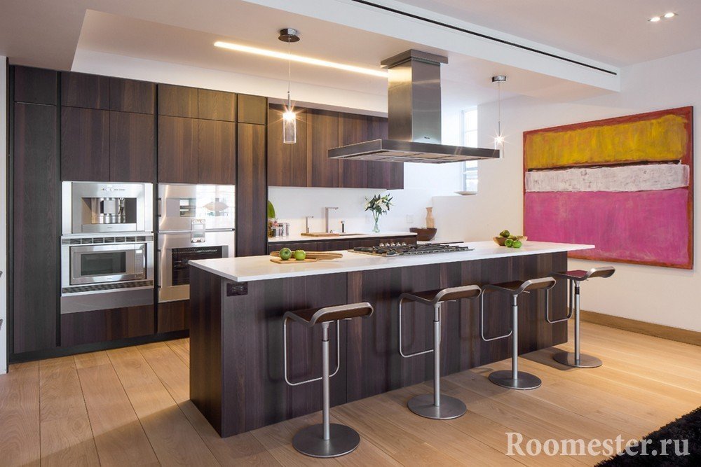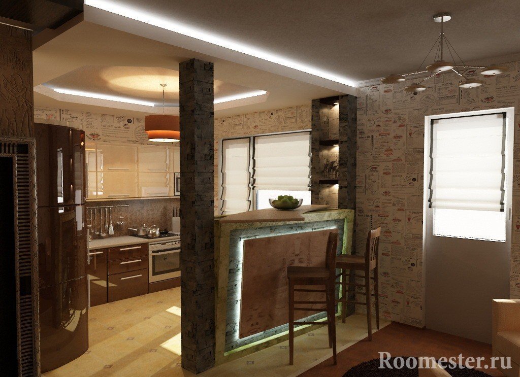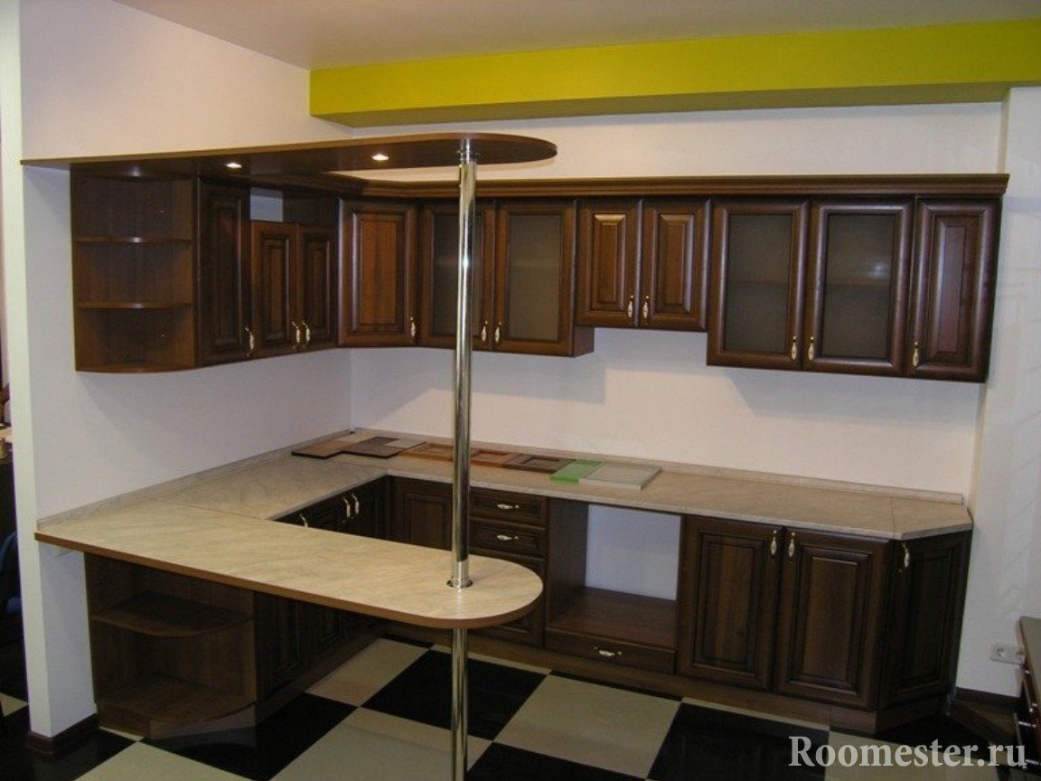 Sin embargo, debe tenerse en cuenta que dos paneles de un mostrador de barra ocupan un doble ancho. Con un tamaño mínimo, el ancho de dicho diseño no será superior a 60 cm. Para cocinas pequeñas, tal solución puede ser demasiado engorrosa.