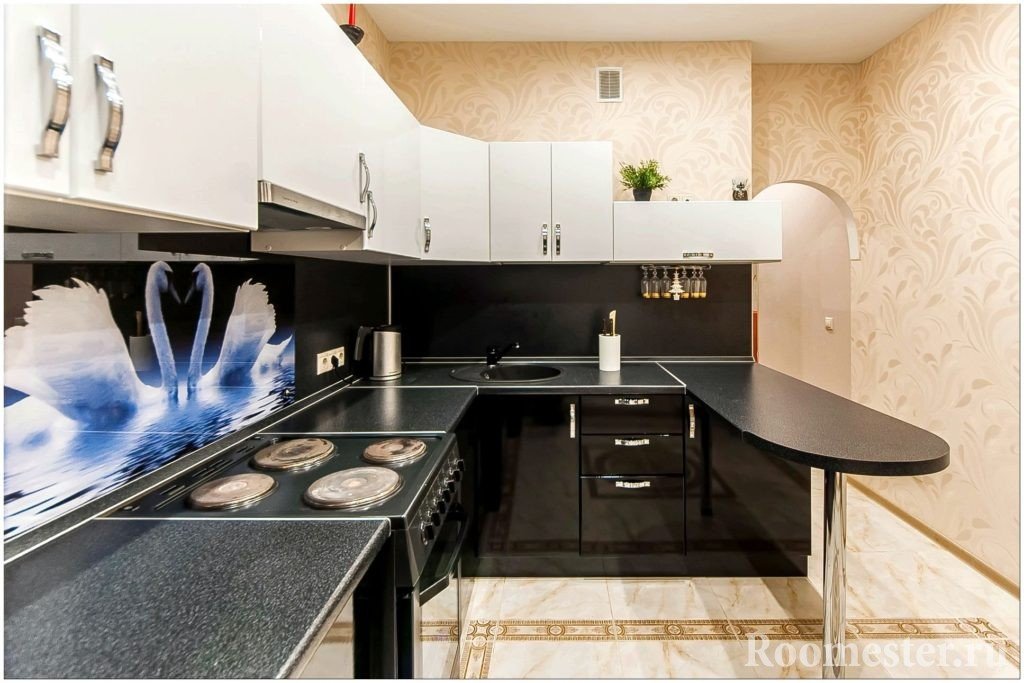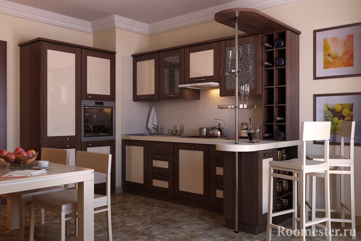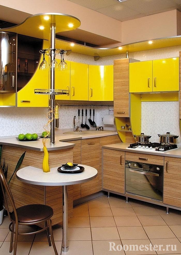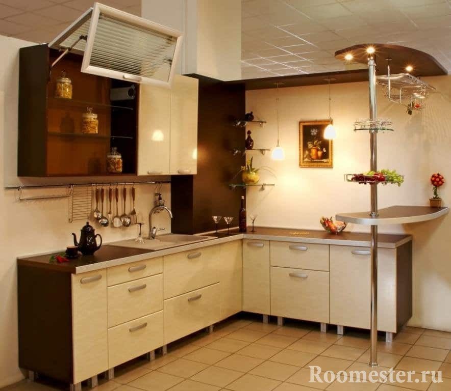 Si el área de la cocina es muy limitada, entonces es extremadamente difícil organizar una barra de bar completa en tales condiciones. ¡No importa! Una mini opción encajará perfectamente en el diseño de dicha cocina.