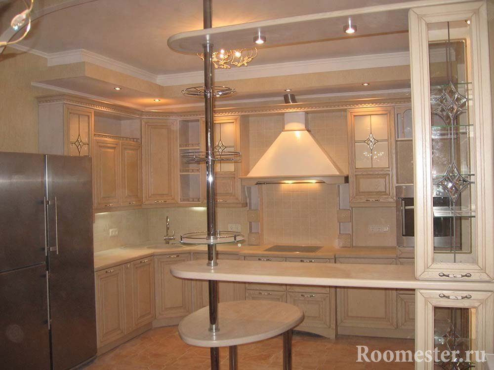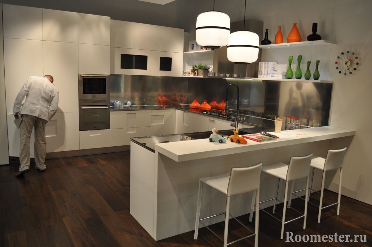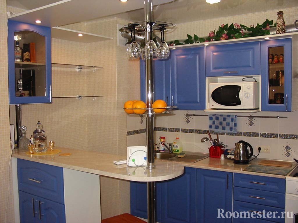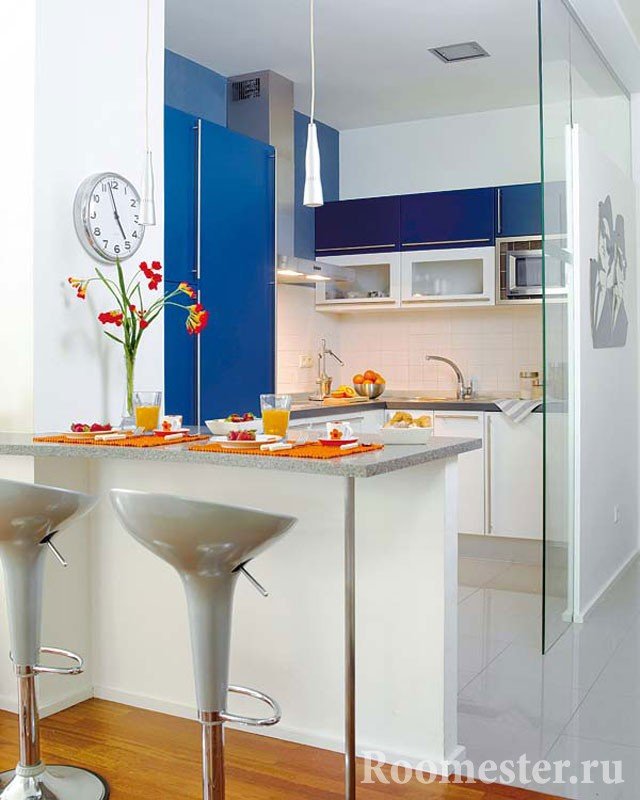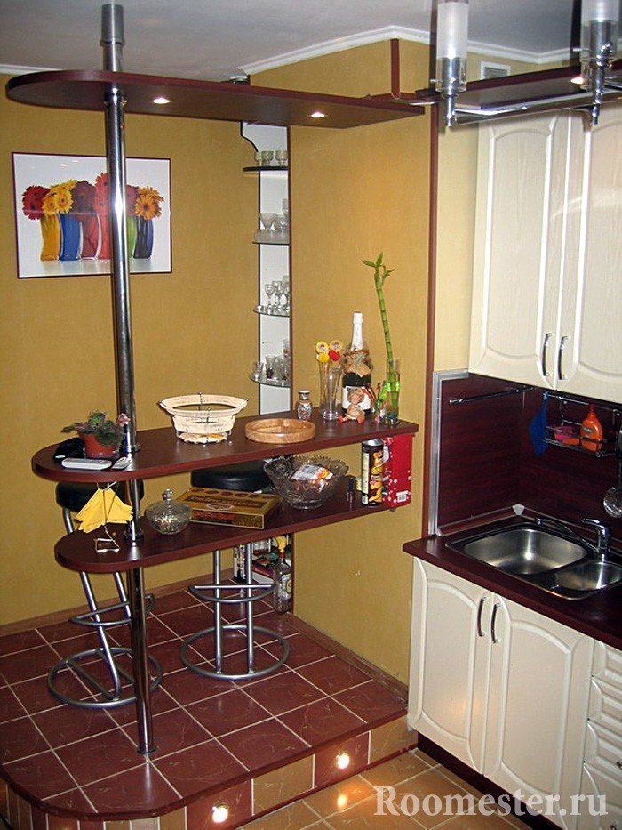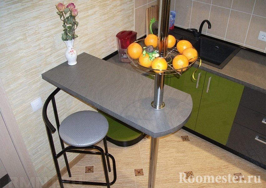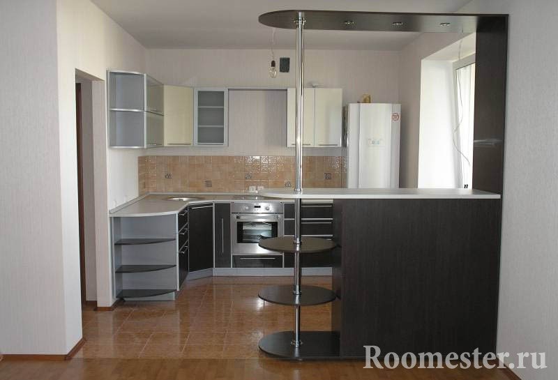 Barra de bar - "isla" es más compacta. Esto le brinda más opciones para instalarlo en una cocina pequeña.Por lo tanto, en cocinas pequeñas, a menudo se usa un diseño con una tubería de cromo y una pequeña superficie de la encimera.