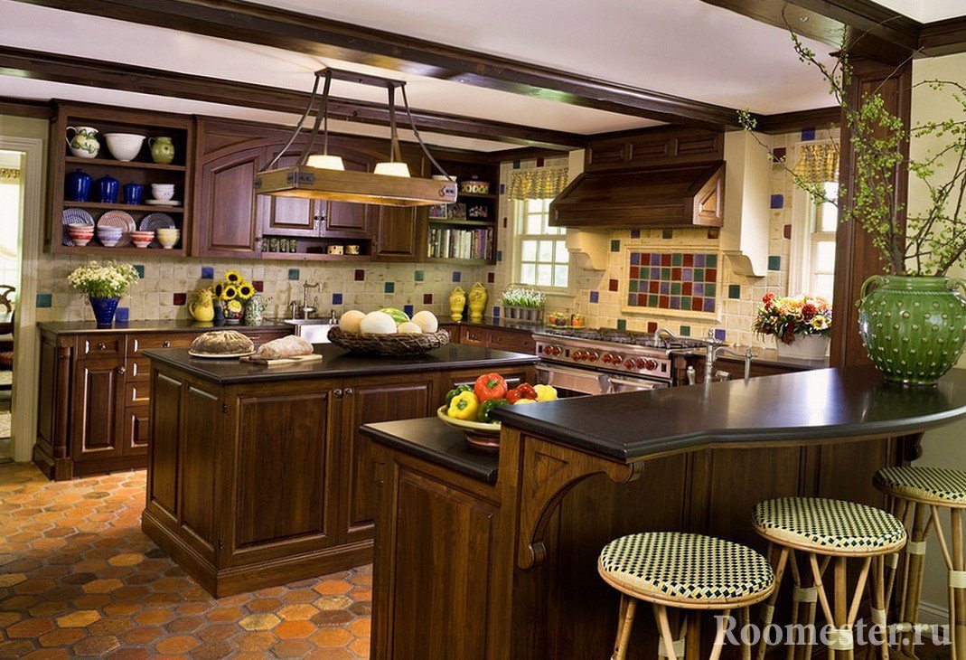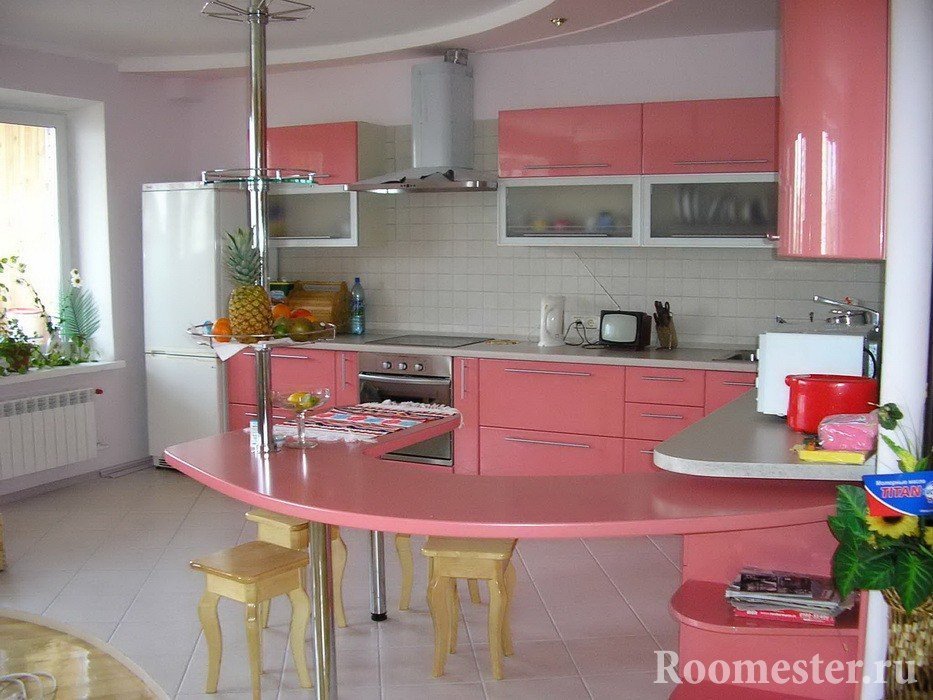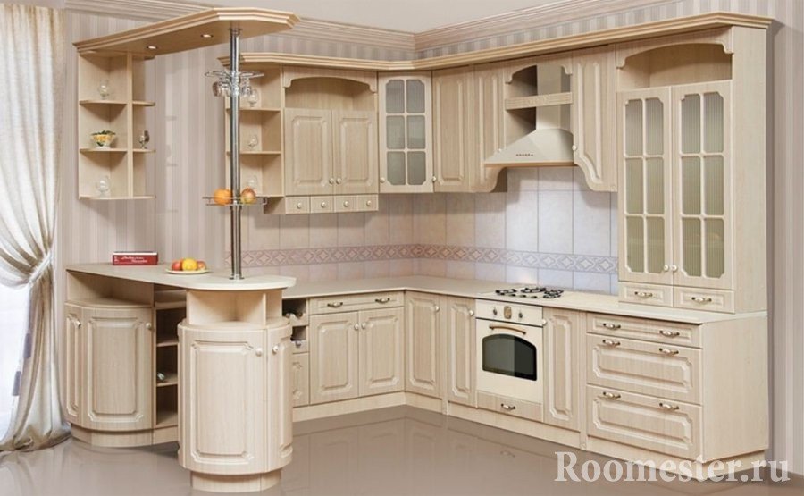 El uso de un juego de cocina de esquina le permite usar el área de la cocina al máximo. La disposición de los muebles de cocina a lo largo de las paredes libera el espacio del área principal de la habitación. Tal diseño elimina la escasez de espacio de trabajo. Sin embargo, si el área de la cocina es pequeña, la barra puede servir perfectamente como mesa de comedor y servir como un elemento de estilo en el conjunto general de la decoración de la cocina.