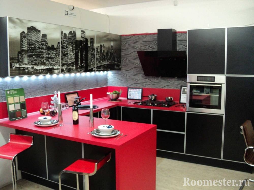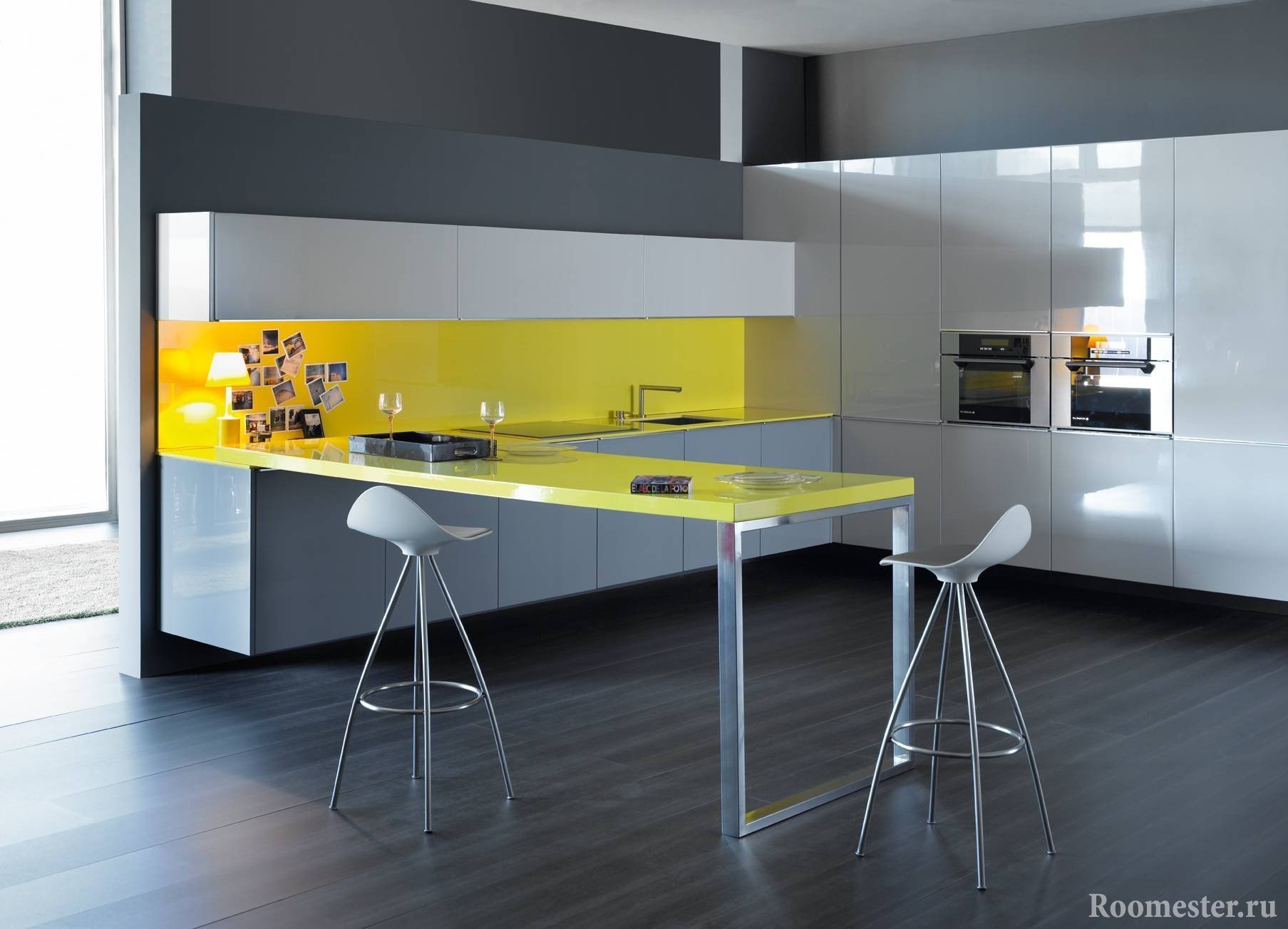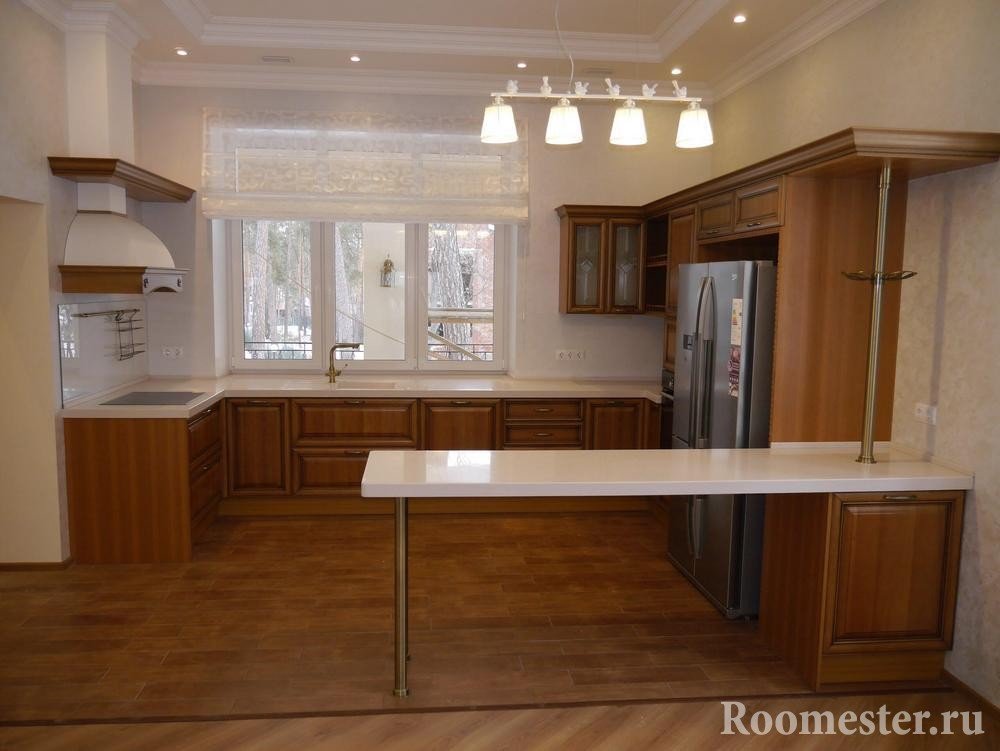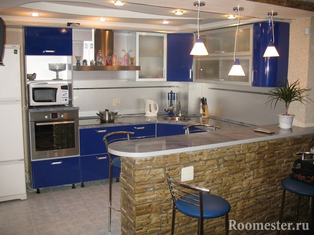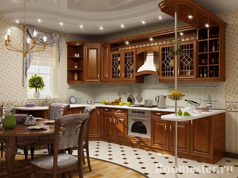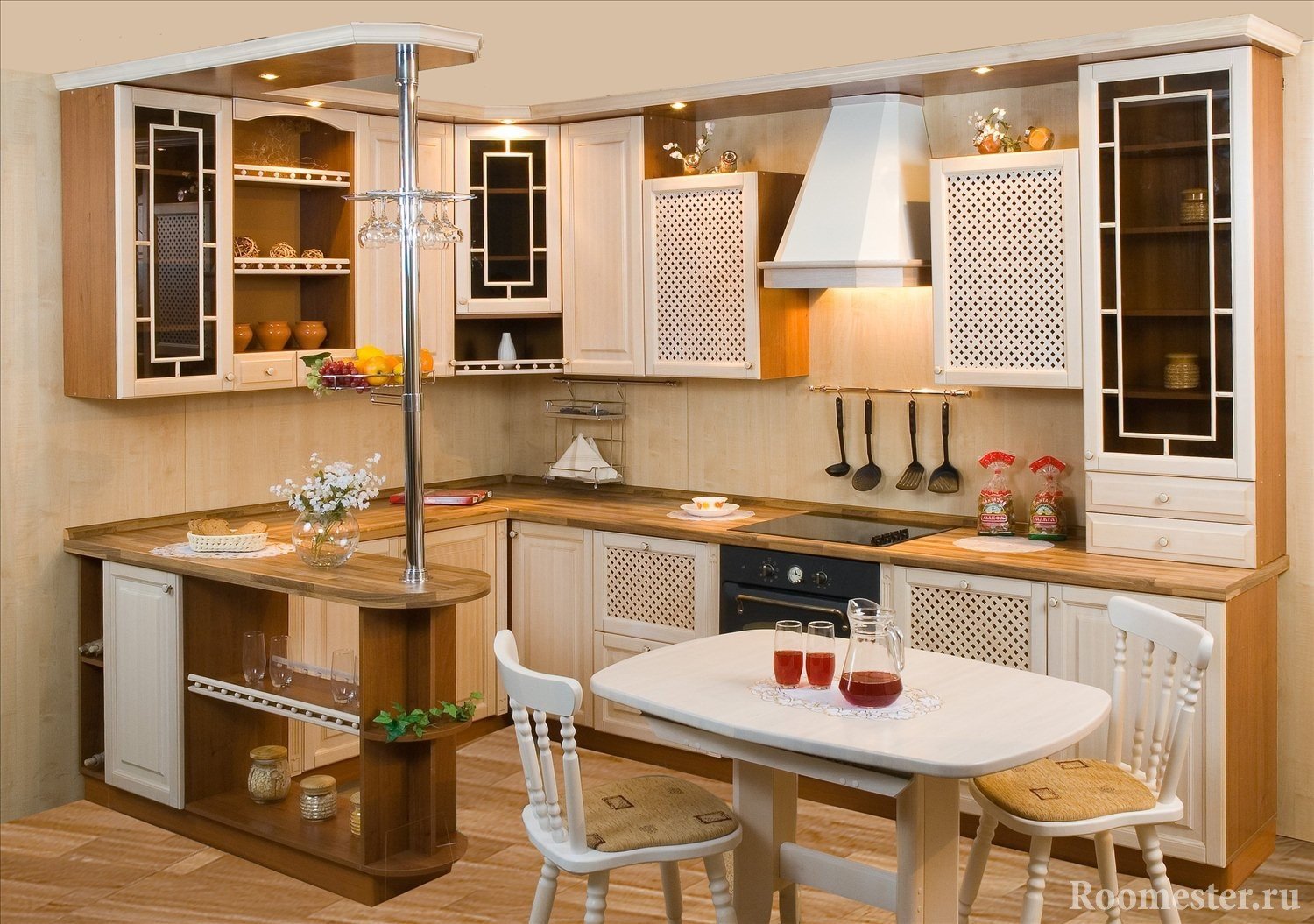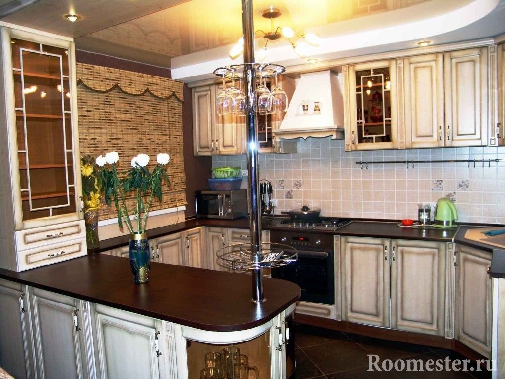 Al combinar el mostrador con el conjunto de esquina ubicado a lo largo de dos paredes de la cocina, se recomienda que sea paralelo a la línea principal de muebles, para simular el diseño con la letra "P". Esta técnica amplía ópticamente la cocina, organiza el espacio, dejando el centro de la habitación despejado.