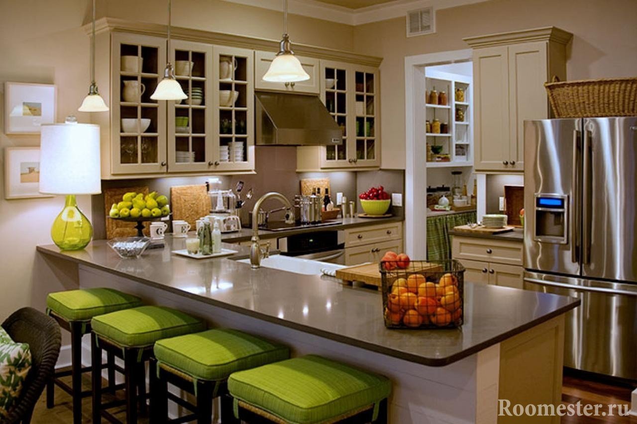 Crear un interior de cocina implica resolver problemas prácticos de organizar el espacio y las funciones estéticas. Por lo tanto, en los interiores de las cocinas modernas, el uso de una barra se ha vuelto muy común. El mostrador del bar le permite organizar convenientemente el espacio y resalta con estilo y elegancia la atmósfera del hogar.