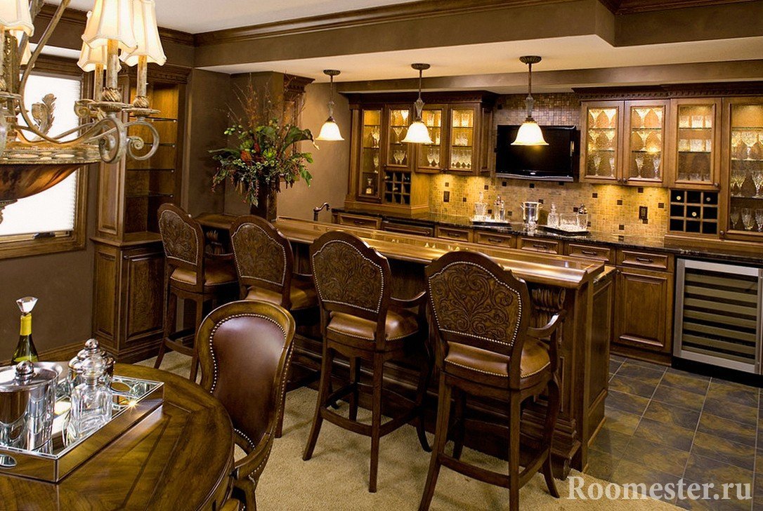 La barra de bar clásica está hecha de materiales naturales sólidos. Especialmente en tales proyectos es invaluable la madera natural. También materiales aplicables que simulan la superficie de "antigüedades".