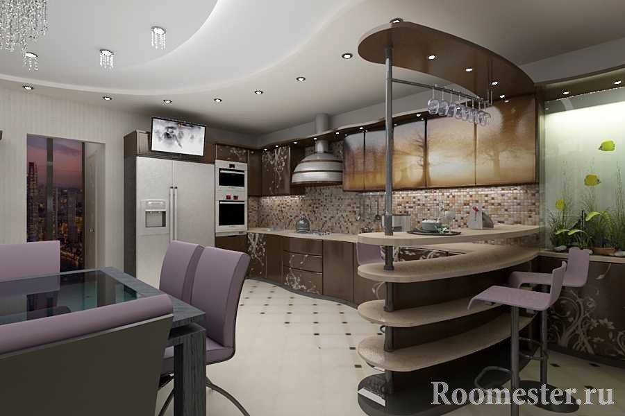 Como elemento del interior de la cocina, la barra de bar ha aparecido recientemente. Una vez que ese diseño de cocina personificaba un signo de prosperidad, bienestar financiero, lujo. Muy poco tiempo ha pasado. Ahora, en muchas cocinas, la barra de bar se utiliza como un tipo de mobiliario elegante y funcional. Debido a la variedad de formas, materiales, la base acumulada de soluciones de diseño estándar e individuales, la opción interior de la cocina con una barra de desayuno se ha convertido en una solución asequible para todos los gustos y presupuestos.