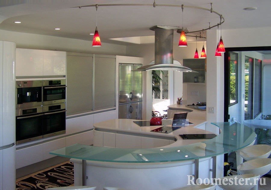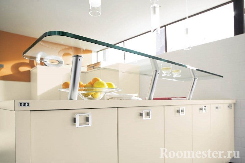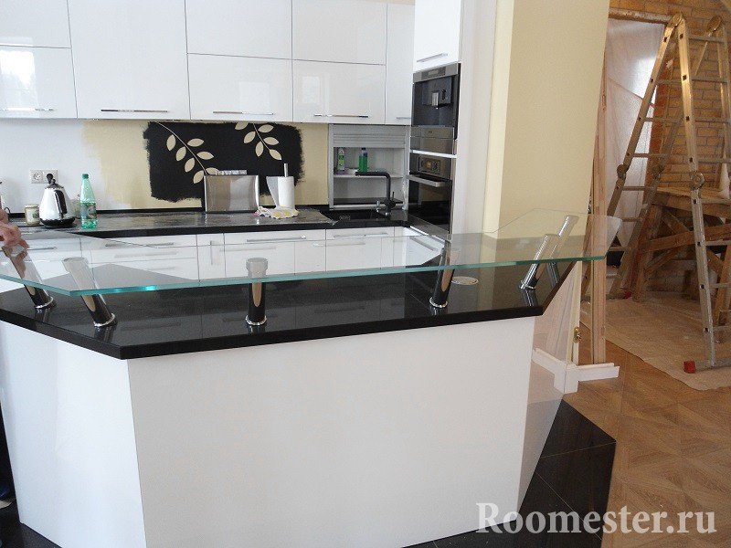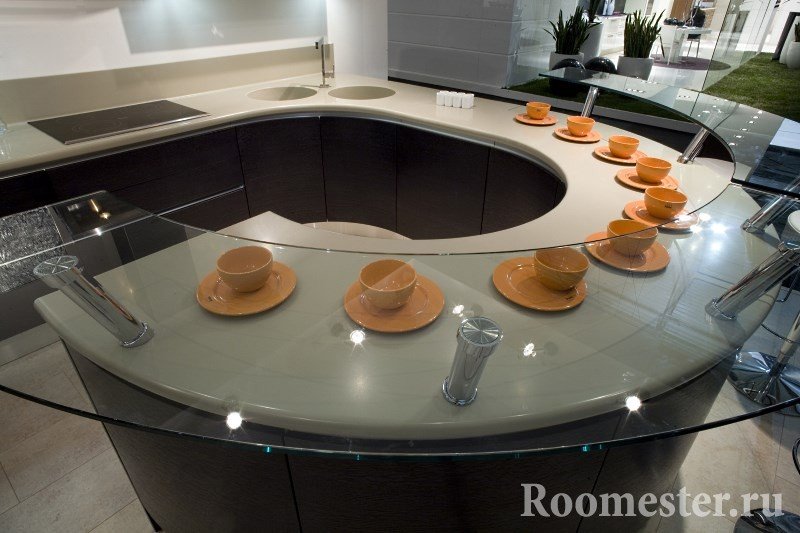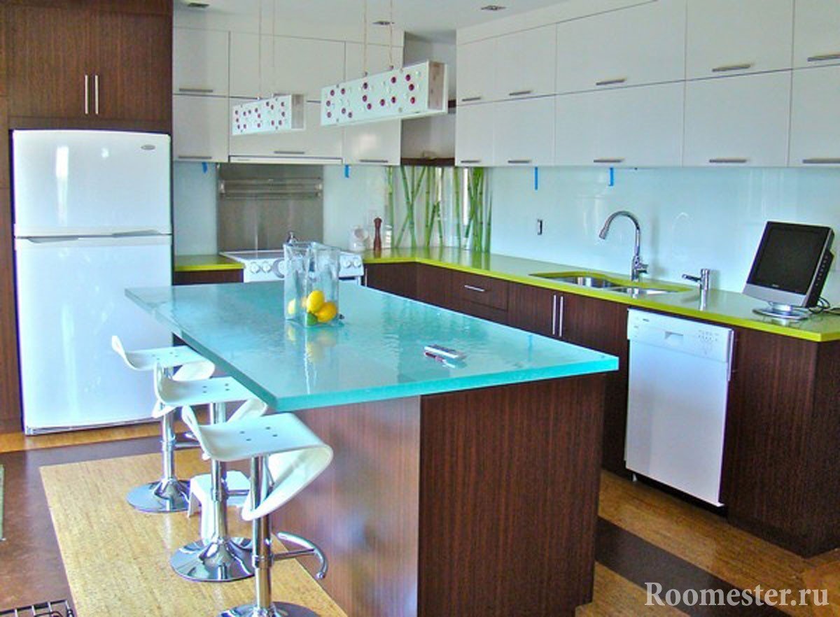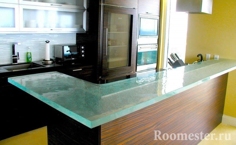 El mostrador de la barra de vidrio puede encajar con éxito en el interior de la cocina. El vidrio como tablero de mesa es un material muy bueno en términos de mantenimiento de la higiene debido a su densidad y suavidad.
