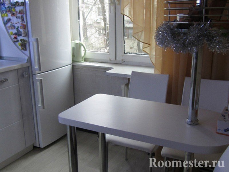 Otra forma de aumentar las superficies de trabajo de la cocina es combinar el alféizar de la ventana y la barra. La ventaja de esta decisión es la capacidad de cocinar y pasar tiempo en la ventana. Por lo tanto, se utiliza la luz natural del día, es posible disfrutar de la vista desde la ventana durante la cocina y las reuniones.