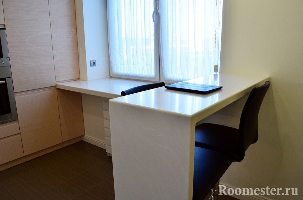 Para una combinación completa, a veces es necesario aumentar o disminuir la base del alféizar de la ventana. Para evitar tales preocupaciones, es ideal planificar este diseño en la etapa de diseño y reparación de la cocina. Las áreas de la barra y el alféizar de la ventana están cubiertas con una encimera. El ancho del alféizar de la ventana le permite planificar lugares para comer para 2-3 personas.