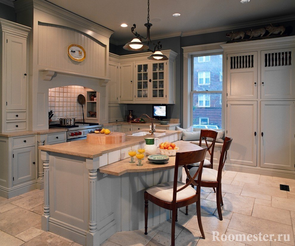 Es muy conveniente utilizar un diseño similar para una familia numerosa con niños pequeños. En este caso, resulta especialmente conveniente cocinar y alimentar a una ruidosa compañía de niños, prácticamente sin salir de un lugar. Las madres que saben cómo se siente alimentar a sus hijos inquietos y limpiarlos al mismo tiempo sin duda apreciarán tal conveniencia.