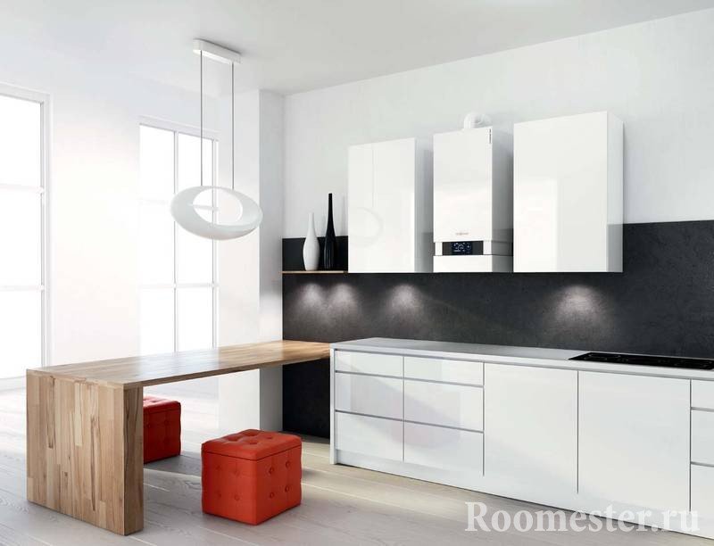 Las soluciones de dos tonos más preferidas para un diseño de cocina armonioso, que se encuentran en la foto, cuando se tomó la decisión de no ocultar la columna de gas en el fondo de las paredes neutrales: