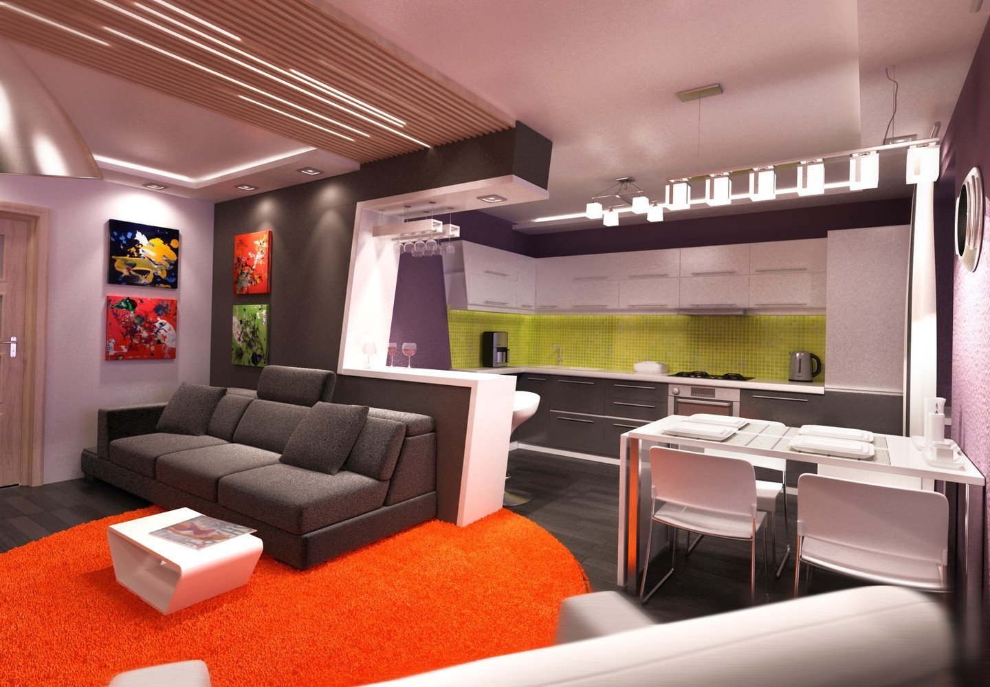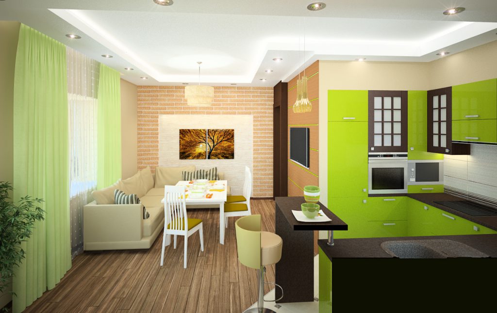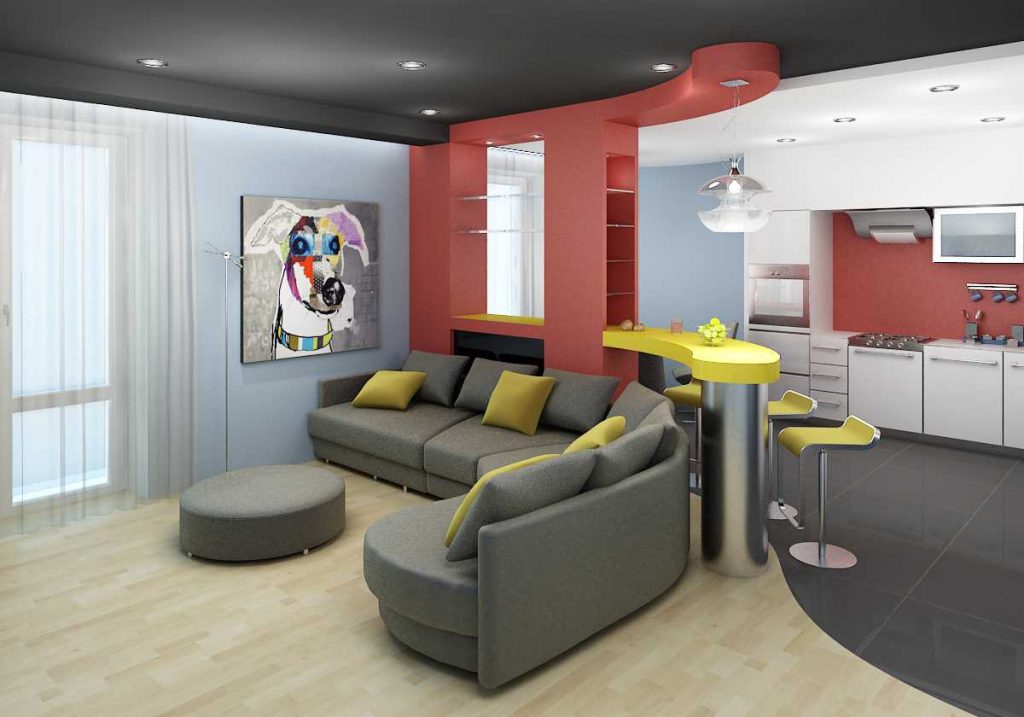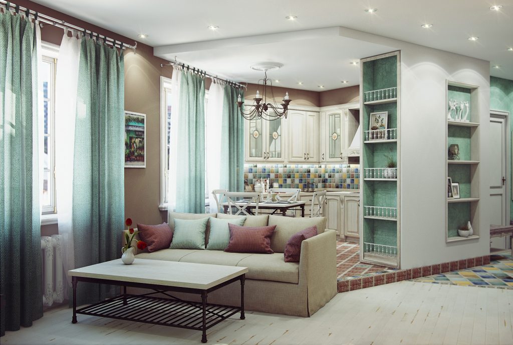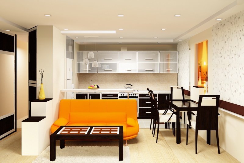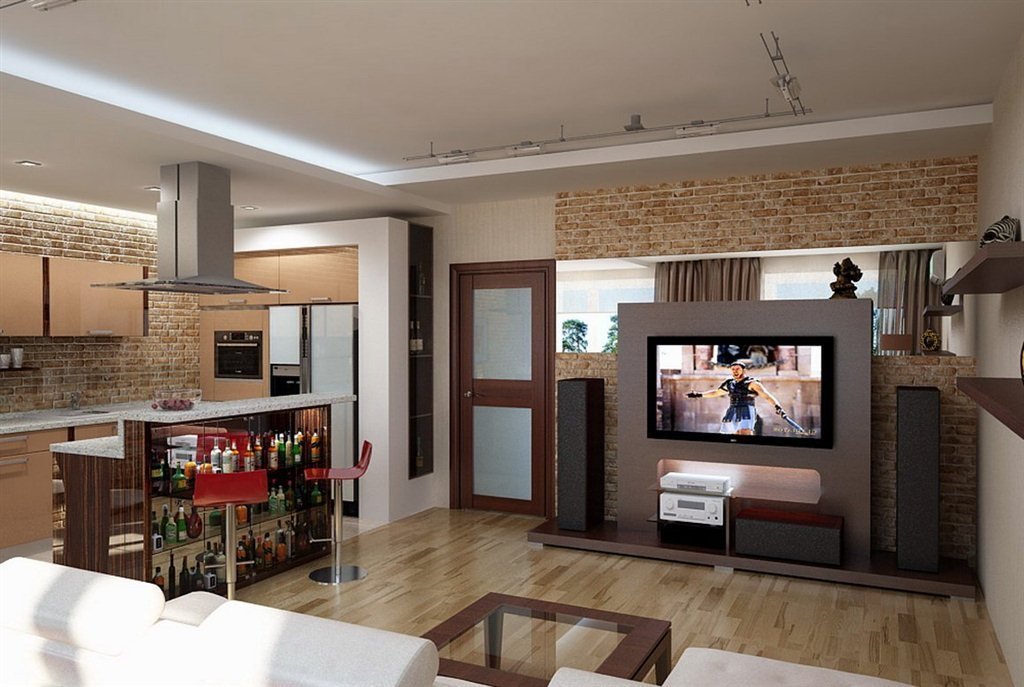 Consejos utiles. Las áreas de recreación y cocina en el interior deben corresponder al mismo estilo e interior, aunque las paredes y los pisos de la cocina y la sala de estar están hechos de materiales completamente diferentes, de diferentes colores. El borde de las zonas debe estar claramente "marcado" para que los huéspedes no tengan dudas de si hay un lavabo en la sala de estar o sillones con un televisor en la cocina.