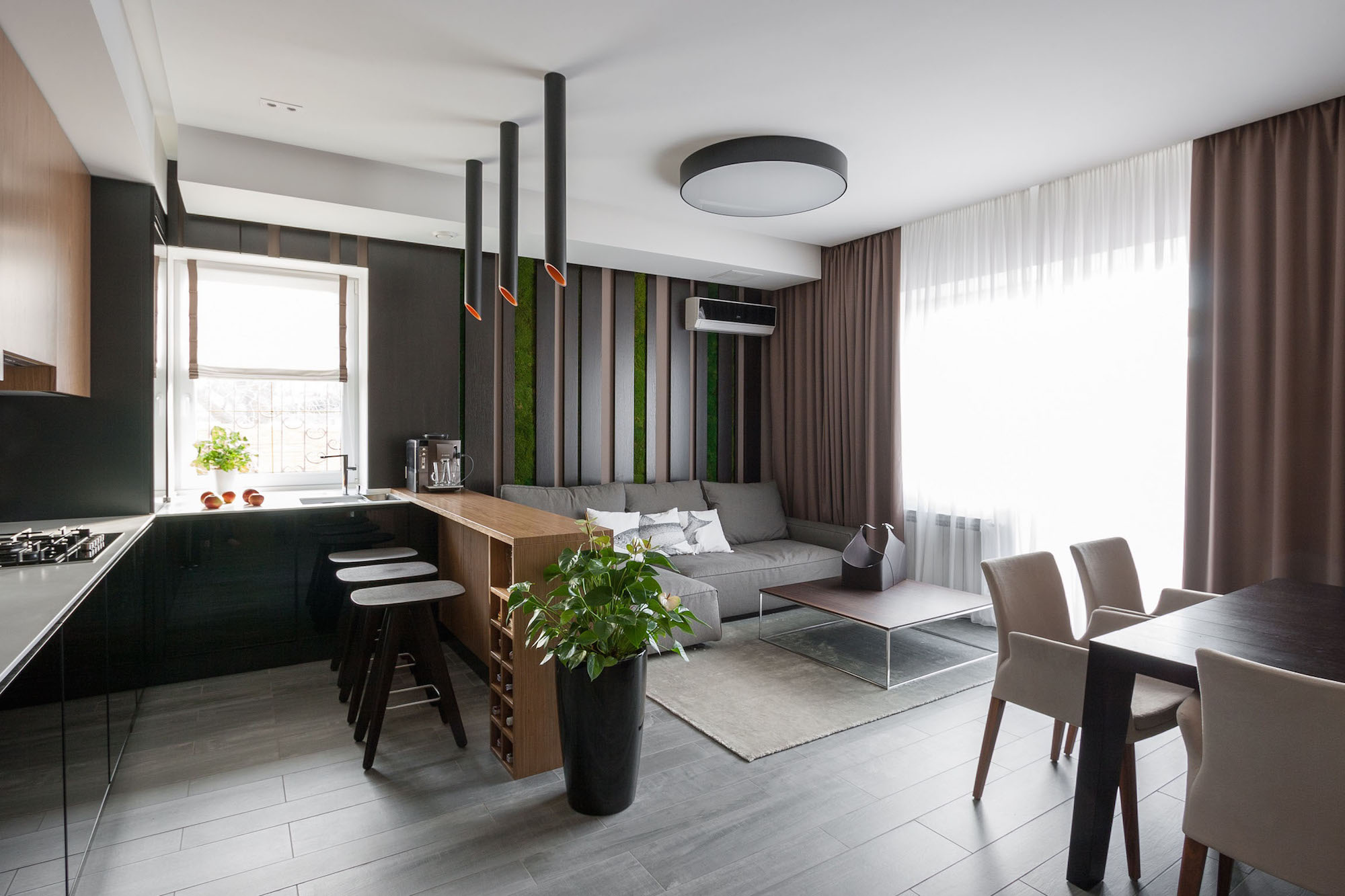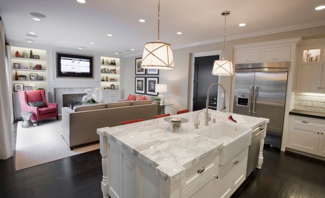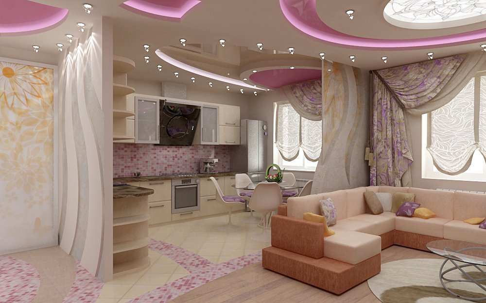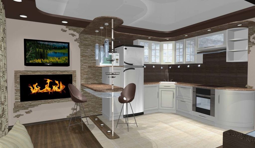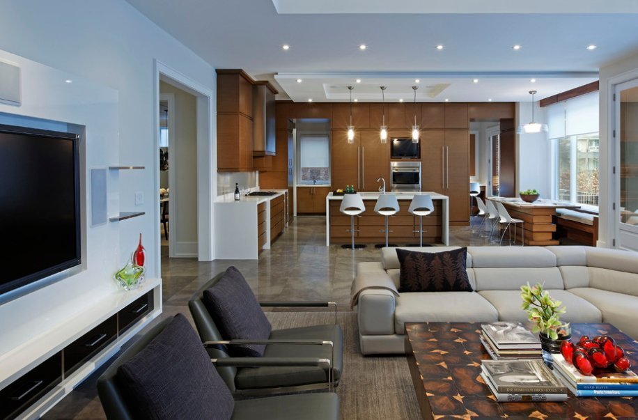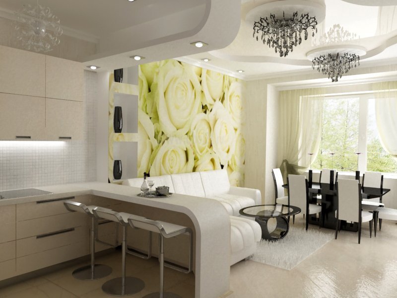 Consejos utiles. Las áreas de recreación y cocina en el interior deben corresponder al mismo estilo e interior, aunque las paredes y los pisos de la cocina y la sala de estar están hechos de materiales completamente diferentes, de diferentes colores. El borde de las zonas debe estar claramente "marcado" para que los huéspedes no tengan dudas de si hay un lavabo en la sala de estar o sillones con un televisor en la cocina.