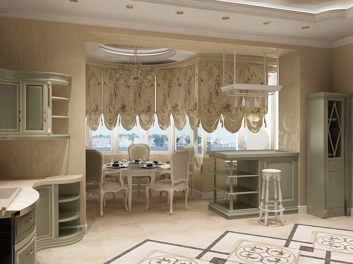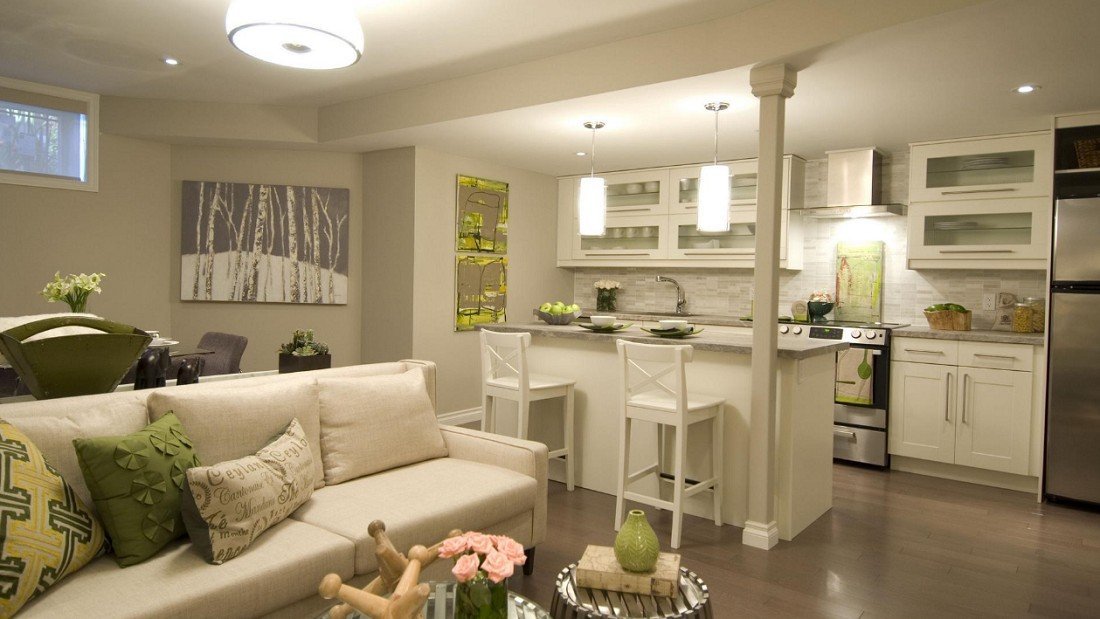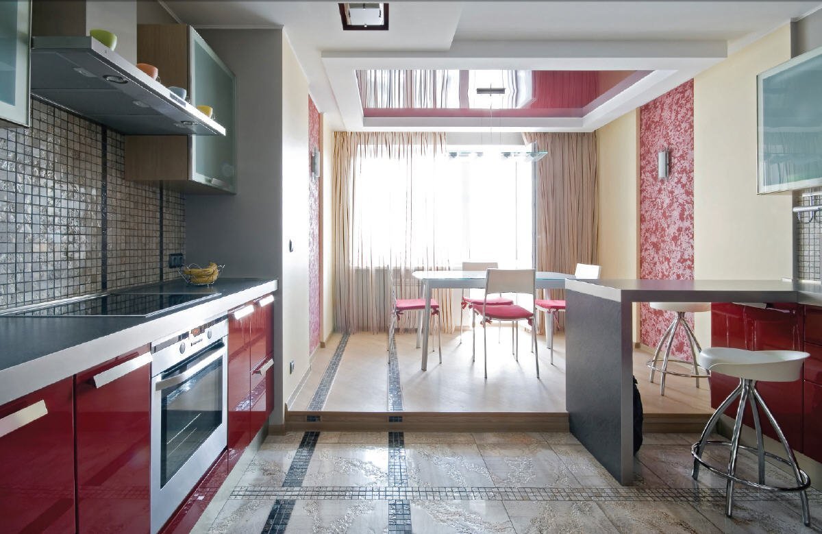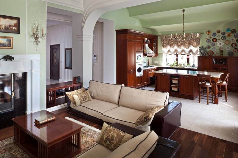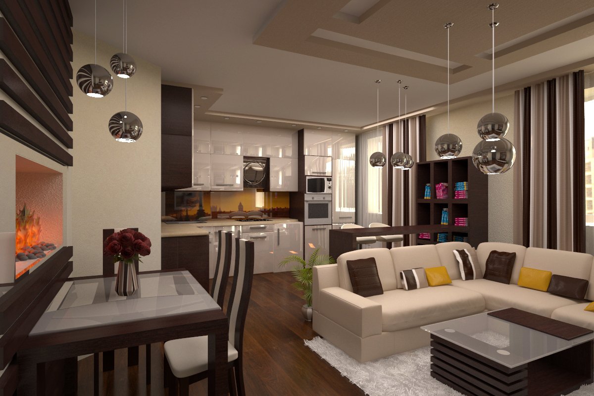 Consejos utiles. Las áreas de recreación y cocina en el interior deben corresponder al mismo estilo e interior, aunque las paredes y los pisos de la cocina y la sala de estar están hechos de materiales completamente diferentes, de diferentes colores. El borde de las zonas debe estar claramente "marcado" para que los huéspedes no tengan dudas de si hay un lavabo en la sala de estar o sillones con un televisor en la cocina.
