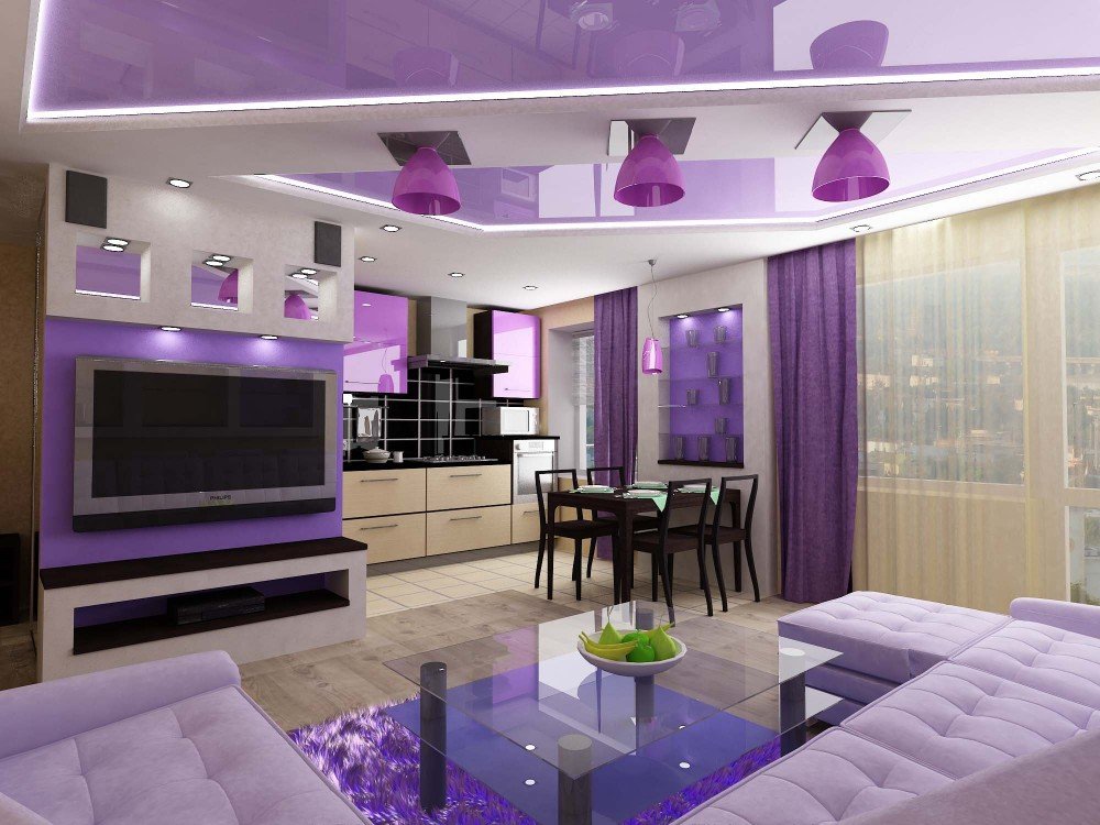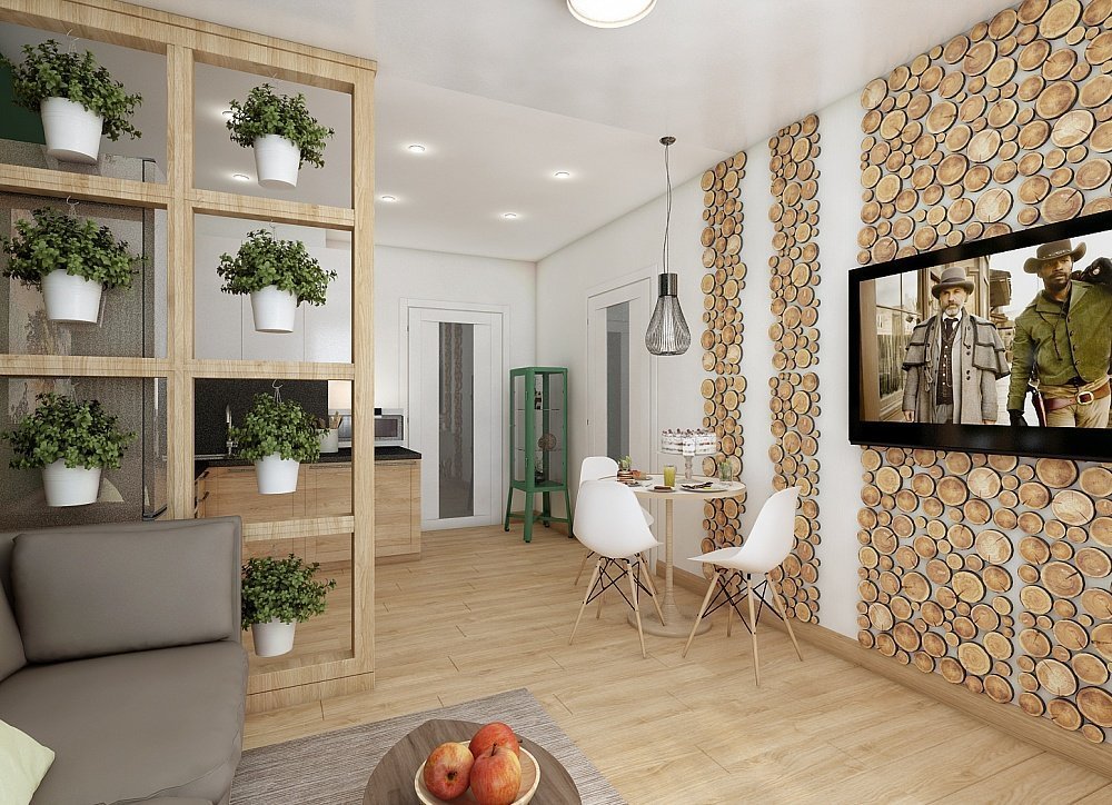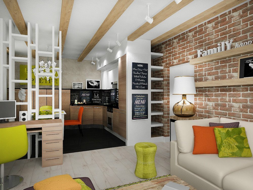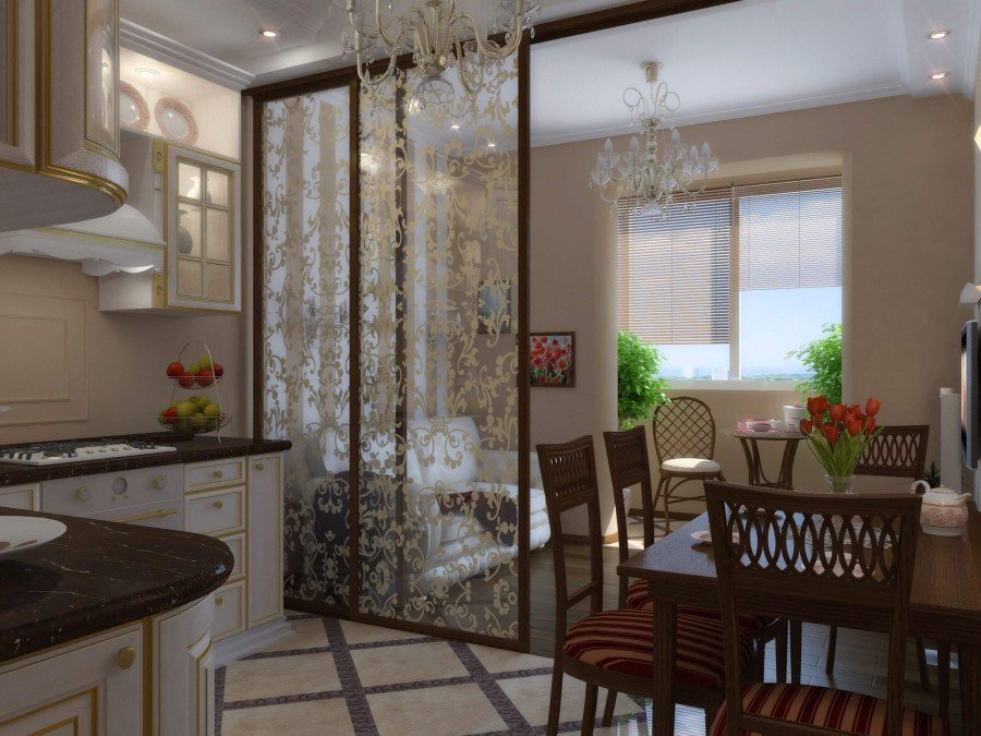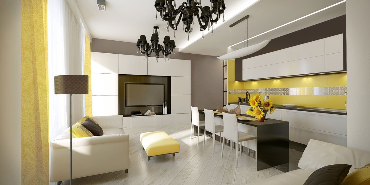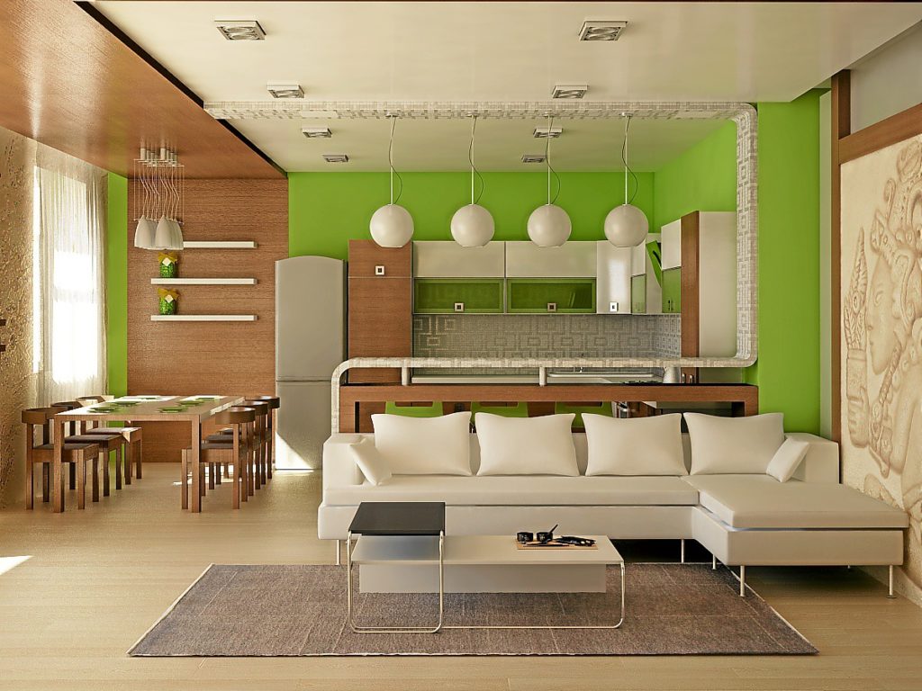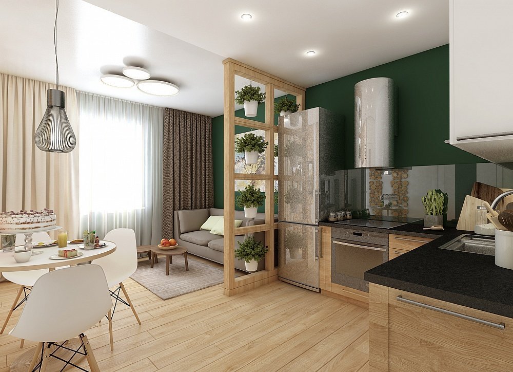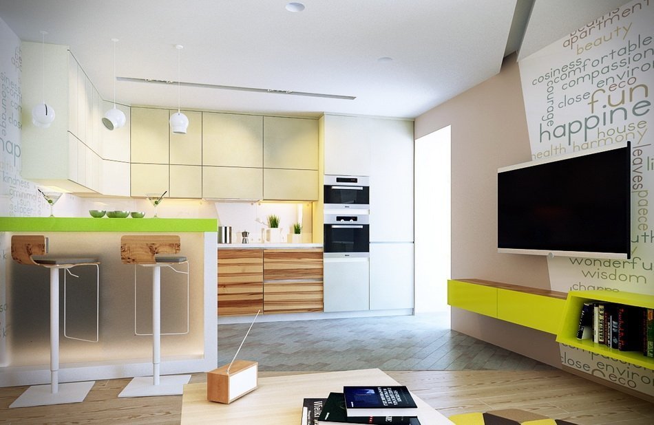La división original de las zonas será al decorar las paredes de la cocina con azulejos, piedra, yeso y las paredes de la sala con un buen papel de seda. El piso de la sala está cubierto con laminado, parquet y la cocina está alicatada. Independientemente de los materiales que compartan las zonas, esta será una solución original. La selección de colores debe realizarse de acuerdo con las condiciones de luz natural.