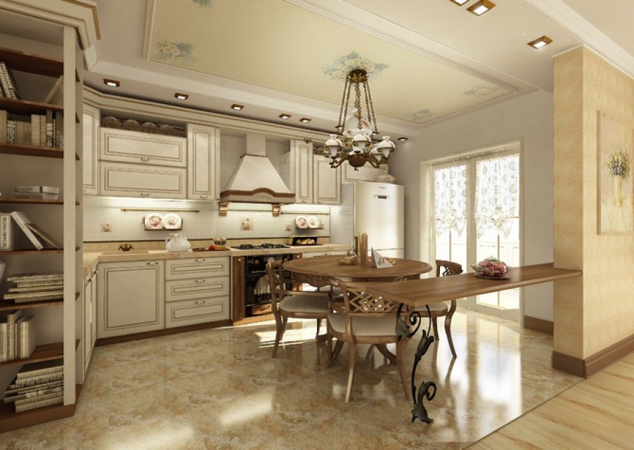 Implica un esquema de color tranquilo sin colores y colores "pegadizos".Muebles de madera natural, electrodomésticos utilizados en la cocina de la categoría de precios "por encima de la media". Todo debe ser "completo" y de buen gusto. Clásico no tolera un montón de pequeñeces. Se presta especial atención al "ajuste" competente en el estilo de los elementos modernos, sin el cual no se puede hacer. Con el enfoque equivocado, serán rechazados por la situación como algo extraño.