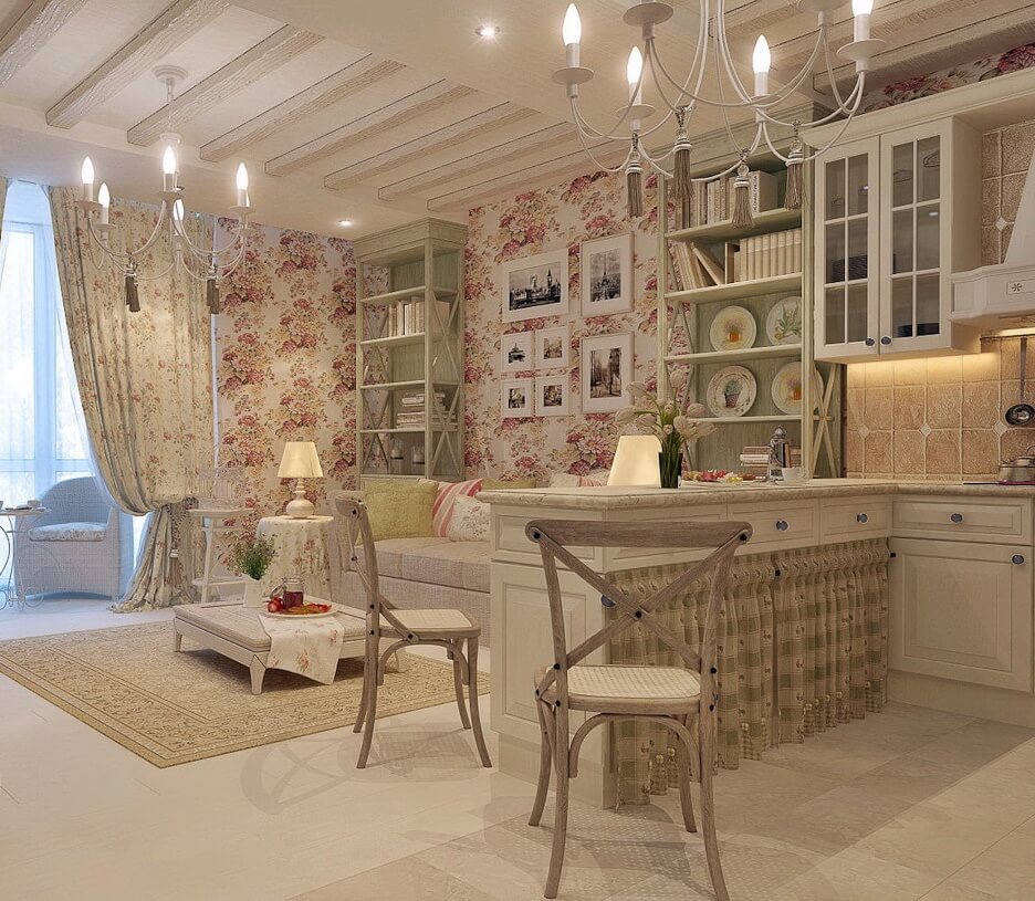Este estilo de nostalgia por la "casa en el pueblo" del sur de Francia y un sentido de unidad con la naturaleza. Los esquemas de color se basan en colores "desteñidos por el sol": oliva, beige, pastel, gris ceniza, leche. El mobiliario es "sólido", de formas simples, de madera. Muebles de color en tonos verdes o azules discretos con pátina. La presencia de muebles de mimbre con rasguños, cobre y elementos decorativos forjados es bienvenida. Las placas deben estar en estantes abiertos. Los elementos multicolores pueden ser cortinas de luz y artículos textiles.