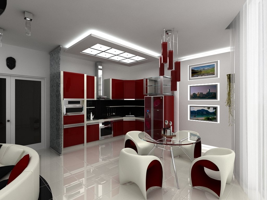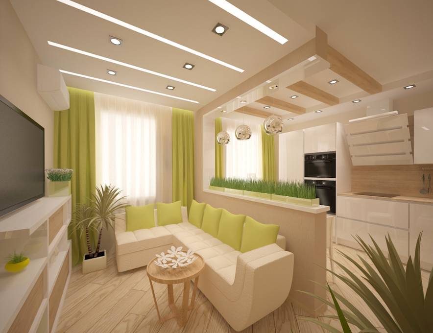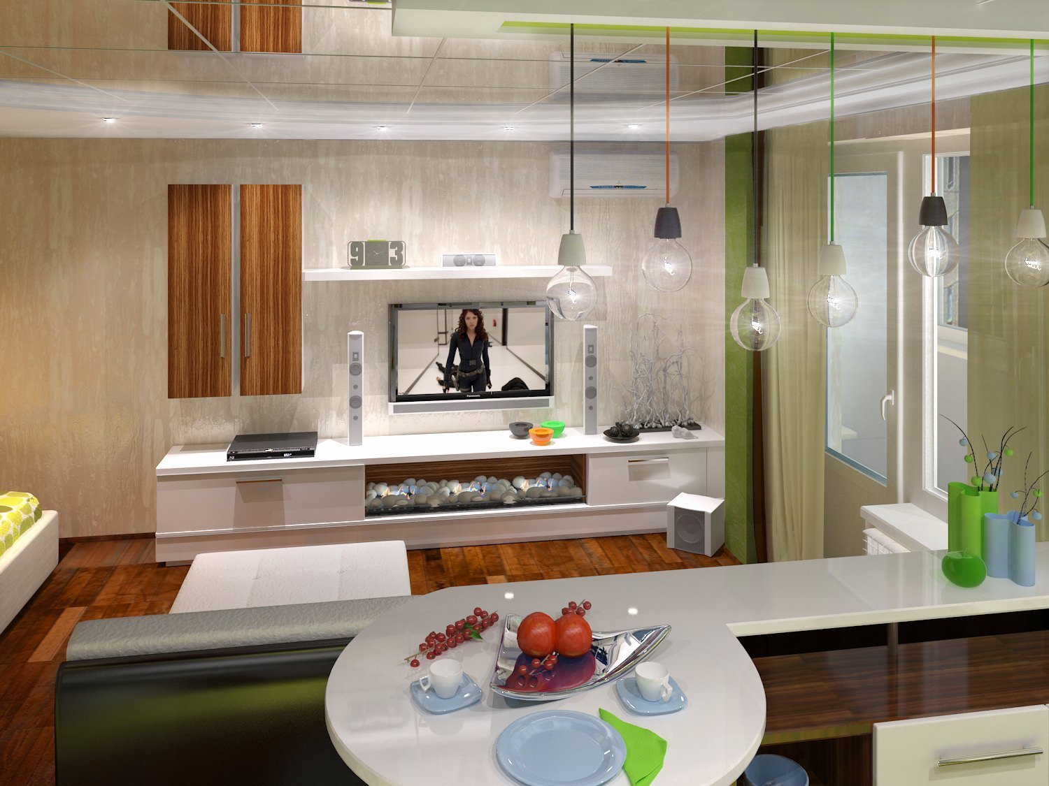 Al cocinar, el olor del área de la cocina se extenderá por toda la habitación. Una campana potente y la ubicación de la cocina colocada directamente junto a la ventana (pero no menos de 40 cm para evitar quemadores de gas de tiro) a veces pueden corregir la situación.Las partículas invisibles de hollín y grasa se depositarán en los muebles tapizados en un área adyacente. Será difícil limpiar sofás y sillones de tal "incursión". El sonido del funcionamiento de los electrodomésticos de la cocina no está aislado del área de descanso. Una licuadora, un hervidor de agua hirviendo, un refrigerador, un lavaplatos, etc. pueden interferir con una conversación amistosa o ver un programa de televisión juntos.
