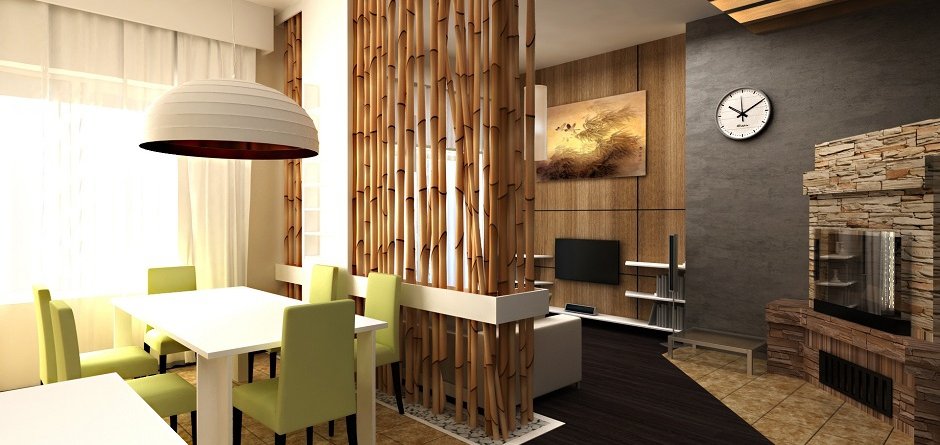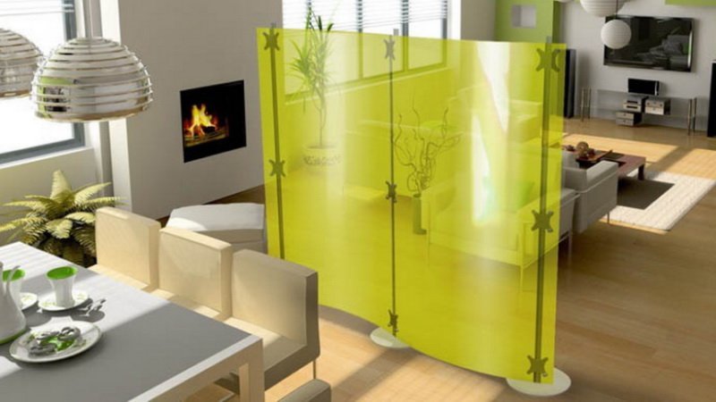 Las particiones interiores son estacionarias (particiones, arcos) y desmontables rápidamente (deslizantes, plegables como una pantalla, con una ventana o espejo de popa incorporado, etc.). De acuerdo con el material de rendimiento, desde madera y yeso hasta elegantes estantes de metal con estantes de vidrio templado en pantallas de tela o estilo de alta tecnología. En particiones portátiles (pantallas), su movilidad es una ventaja. Separar o desplazar cualquier zona simplemente reorganizando la partición no será difícil. No vale la pena elegir pantallas a base de tela para separar el área de la cocina, ya que la tela absorbe los olores. Aquí las pantallas de PVC o celosía simple de madera son adecuadas. Se coloca una partición con una ventana simplemente para indicar los límites de los sitios y para garantizar que la luz penetre en otra zona. Una partición "multicolor" se verá muy interesante e inusual, cuyos lados y la textura se resolverán en el mismo esquema de color que el área de cada lado.