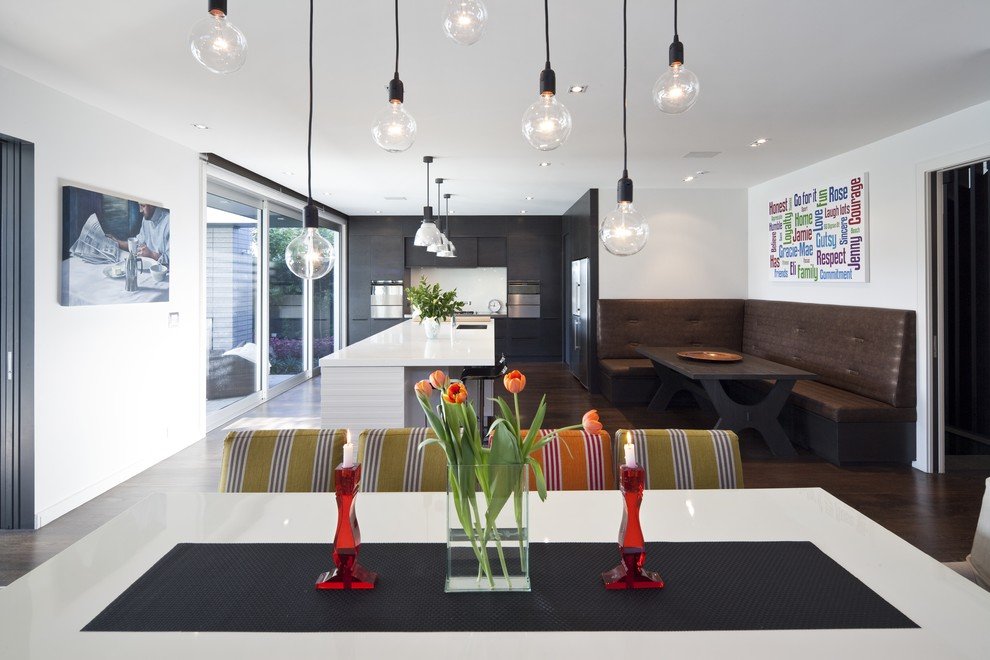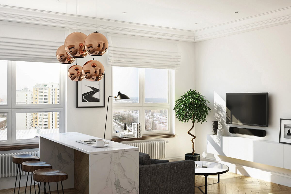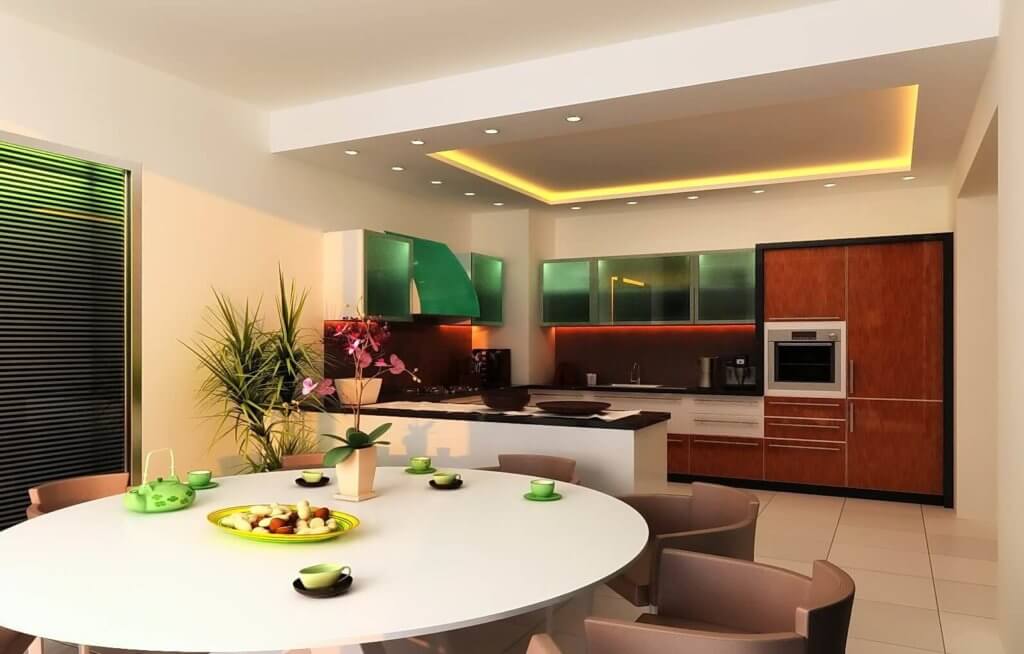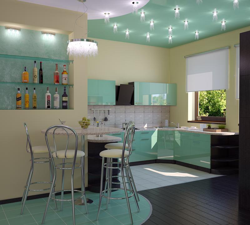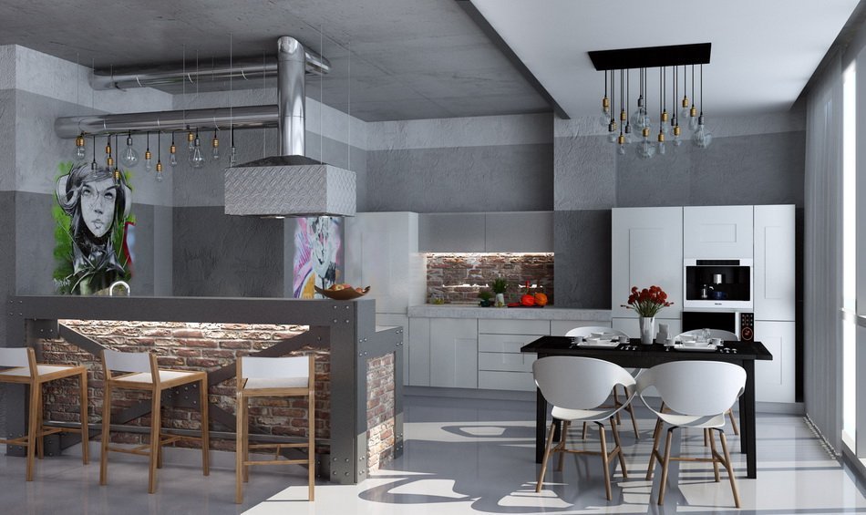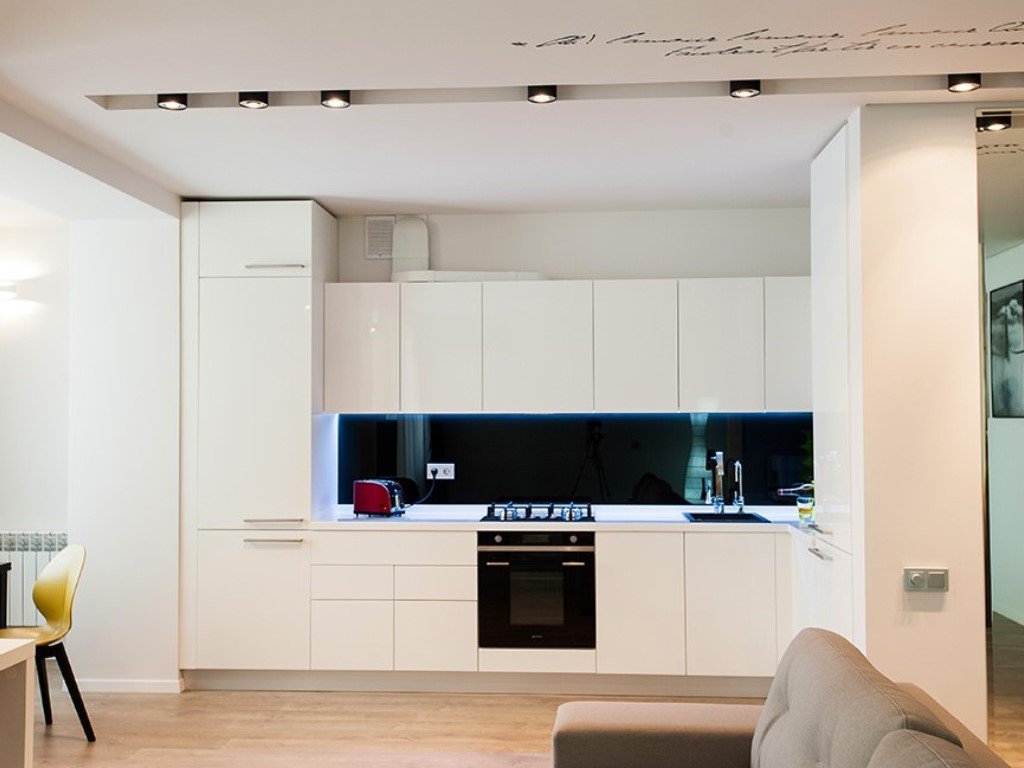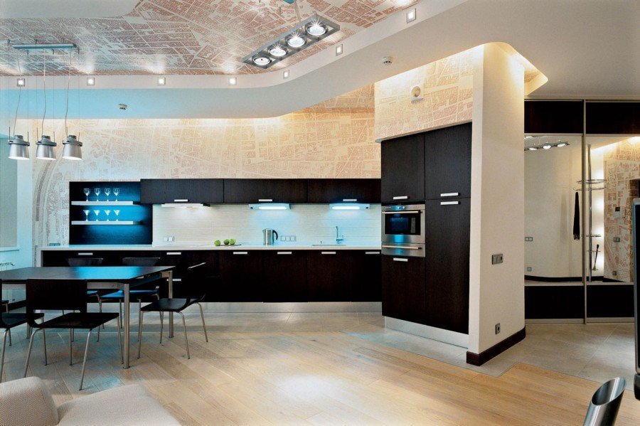 Con la ayuda de la iluminación, puede lograr una hermosa separación visual de zonas, sin utilizar otros métodos. Las leyes de diseño existen aquí: la superficie de trabajo de la cocina debe estar bien iluminada, ya que cocinar en el crepúsculo es inconveniente, y una habitación con poca iluminación visual "oculta" la sensación del volumen de la habitación. Se puede colgar una lámpara de araña moderna y elegante sobre el centro de la cocina, las lámparas de techo se pueden fijar sobre el mostrador de la barra divisoria y se pueden usar focos debajo de los gabinetes de la pared. La zona más alejada de la ventana también debe tener una iluminación suficientemente brillante.