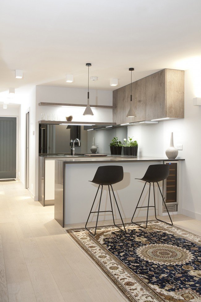 Con un diseño de tipo paralelo (dos líneas), la cocina está ubicada en la cocina en dos paredes opuestas. Se utiliza principalmente en presencia de una cocina de paso o con una ventana frente a la puerta. Un fregadero y una estufa generalmente se encuentran en una pared, y un refrigerador y un congelador en el lado opuesto. La distancia mínima entre las hileras es de al menos 1,2 metros, para poder abrir los casilleros en ambos lados al mismo tiempo y sacar la sartén del horno de manera segura. Visualmente "expanda" la habitación, por lo que tiene sentido pensar en tal disposición para los propietarios de cocinas alargadas. El inconveniente más significativo es que si hay una persona en la estufa durante la cocción, se forman "atascos de tráfico" en el movimiento hacia el refrigerador para tomar una cerveza mientras se ve un partido de fútbol. Por lo tanto, los propietarios de cocinas, en las que hay suficiente espacio libre, deberían pensar en una opción de diseño paralelo. Además, para expandir visualmente la habitación de dicha cocina, los gabinetes de la pared superior se retiran por ambos lados. Si esto no es posible, entonces vale la pena ordenarlos en un tono claro o colgarlos de un solo lado.