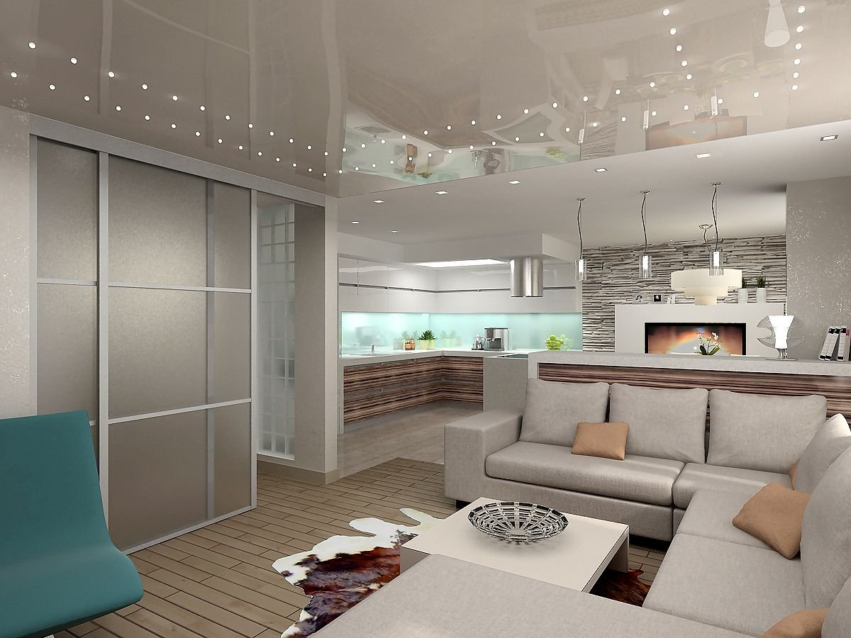 La diferenciación de zonas con la ayuda de la diferencia de altura del piso es una técnica clásica que se ha utilizado en todo momento y ha colocado "acentos" en la habitación. Hay una doble visión de lo que debería ser más alto. Algunos "tradicionalmente" levantan la cocina, citando el hecho de que es más fácil bajar con platos completos para los invitados. Para determinar qué habrá en el podio, depende de los propietarios del apartamento decidir, pero antes en la altura había zonas más "importantes" en el estado para los propietarios, una especie de "trono" de supremacía de la comodidad personal sobre la comodidad pública. Tal separación complementa efectivamente un techo de dos o tres niveles hecho de yeso, textil o película de PVC, con lámparas incorporadas, que reflejan los contornos de las zonas y con una transición de color. El podio se puede equipar al mismo tiempo que un lugar para almacenar todo tipo de cosas, y sus pasos se pueden usar para insertar la iluminación de la zona inferior. Vale la pena recordar que la zonificación con pisos o techos solo es posible con una altura suficiente de las habitaciones.