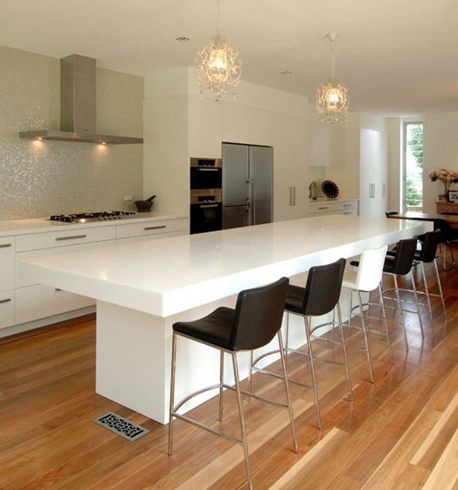 Se puede organizar una verdadera "isla" en la cocina, con un área de al menos 20 m2. Al implementar este tipo de planificación, una de las áreas de trabajo estará ubicada en el medio de la cocina. Estrictamente hablando, el diseño de la isla será de dos tipos a la vez. La segunda área de trabajo se colocará contra las paredes en forma lineal o en forma de U. Actualmente, la planificación de la isla es muy popular. Tendrá que sacrificar el área, pero es con este tipo de cocina que el estudio "juega" con sus lados rentables, y un interior seleccionado correctamente creará una impresión de lujo. Si hay una placa en la zona central, la campana para la "atmósfera" de la isla se ubicará en el centro de la habitación, por lo que debe considerar cómo ocultar los conductos de ventilación debajo del techo. Las dimensiones de la parte de "isla", por regla general, no exceden 1200x1200mm para poder alcanzar cualquier ángulo sin hacer movimientos innecesarios. A veces, una isla se considera una mesa de comedor o un carrito con ruedas. En este caso, la encimera se utiliza como superficie de trabajo, y la mesa estacionaria está equipada con un sistema de cajones y estantes integrados para almacenar los utensilios necesarios.Un diseño peninsular es cualquier tipo de diseño con una protuberancia adicional de la superficie de trabajo o gabinete con una estufa, fregadero. La superficie sobresaliente a veces se usa como barra de bar o mesa de servicio.