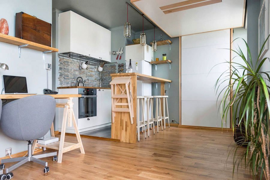 Con la colocación competente y armoniosa de muebles y superficies de trabajo, las dimensiones de incluso una cocina pequeña se pueden convertir a su favor. Para comenzar a planificar, debe guiarse por la "regla de oro": la ubicación de los vértices del "triángulo de trabajo" (estufa, fregadero, refrigerador) entre sí a una distancia de 60 a 300 cm. Antes de decidirse por una solución de diseño como crear una cocina, Los estudios deben sopesar los pros y los contras, tener en cuenta todos los matices. Si las oportunidades lo permiten, entonces el estudio es el más adecuado para un apartamento en el que será posible combinarlo con un comedor o sala de estar completos, dejando la habitación para relajarse como una habitación separada o colocándola en el segundo piso. Para los propietarios de pequeños "odnushki", esta opción es adecuada con un "estiramiento", aunque a menudo esta es la única forma de obtener un espacio acogedor y confortable. Si hay niños en una habitación, este método es inaceptable, o la zonificación debe hacerse usando una partición. Los niños deben tener su propio "rincón", su propio espacio personal.